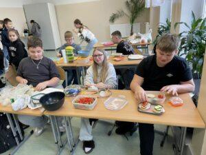 Uczniowie klasy V i VI wzięli udział w zajęciach w ramach projektu „Trzymaj formę”, których celem było pokazanie, że zdrowe odżywianie może być zarówno smaczne, jak i ciekawe. Zadaniem uczniów było wspólne przygotowanie zróżnicowanego, zbilansowanego i kolorowego śniadania.