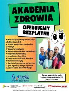 W imieniu Stowarzyszenia Karuzela pragniemy poinformować o realizacji zadania publicznego „Akademia Zdrowia” skierowanego do dzieci, młodzieży, dorosłych oraz rodzin, ze szczególnym uwzględnieniem potrzeb związanych ze wsparciem zdrowia psychicznego i emocjonalnego.