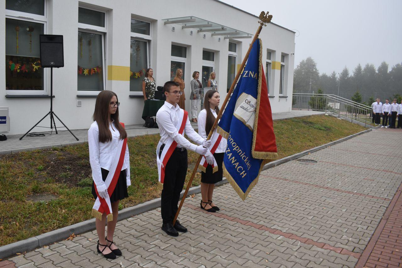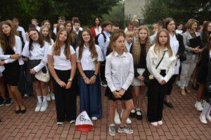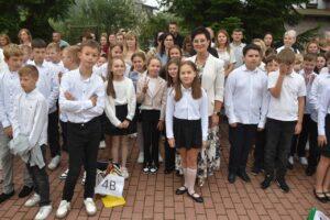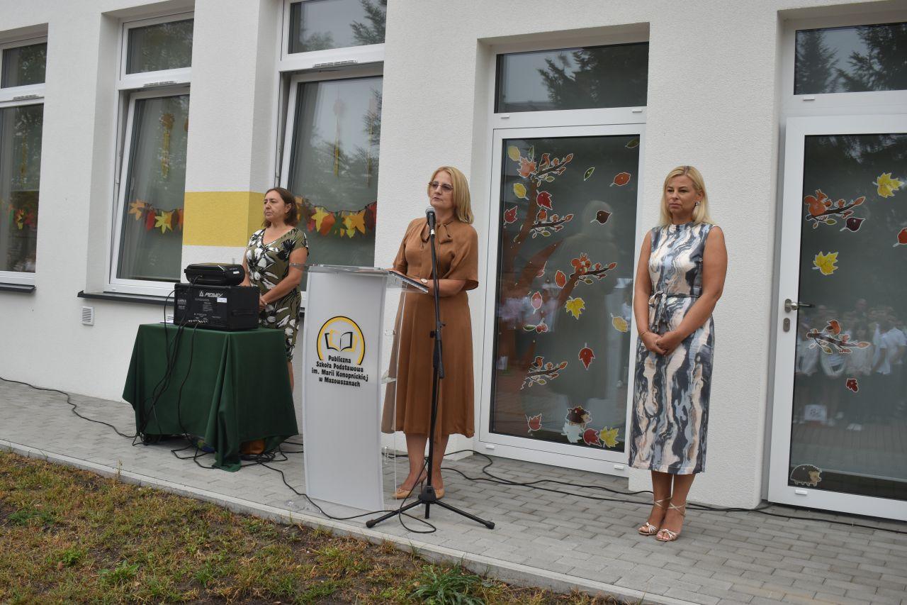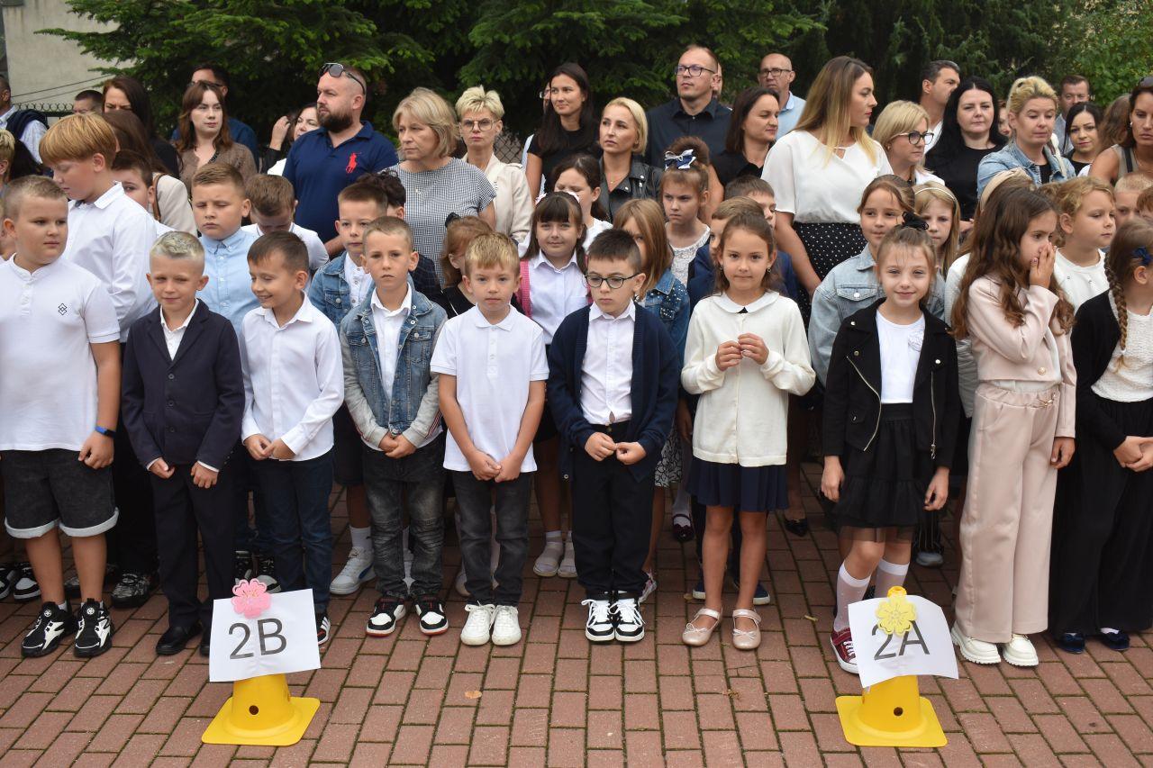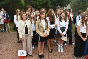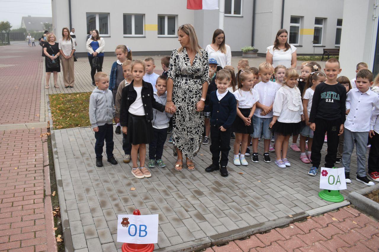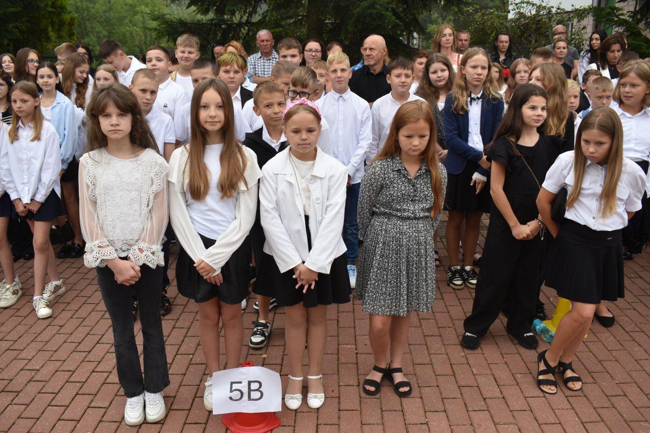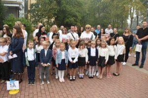 Po nabożeństwie wszyscy uczniowie, nauczyciele, rodzice oraz zaproszeni goście zgromadzili się na placu przed szkołą. Pani Dyrektor Małgorzata Trelka serdecznie powitała wszystkich obecnych, przedstawiła wychowawców klas oraz nowych nauczycieli, którzy dołączyli do naszego grona pedagogicznego. W swoim przemówieniu życzyła wszystkim uczniom owocnego, pełnego radości i sukcesów roku szkolnego.