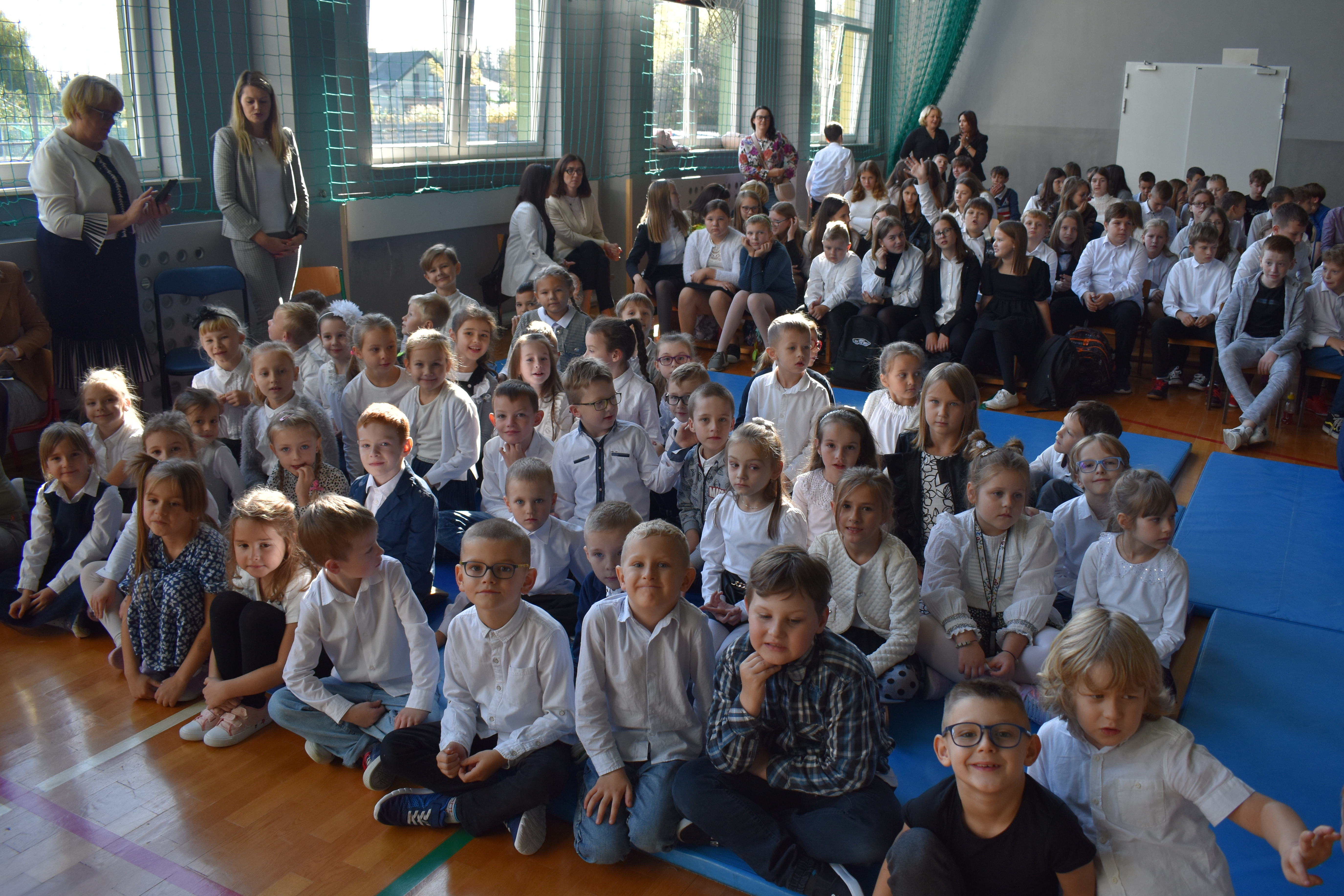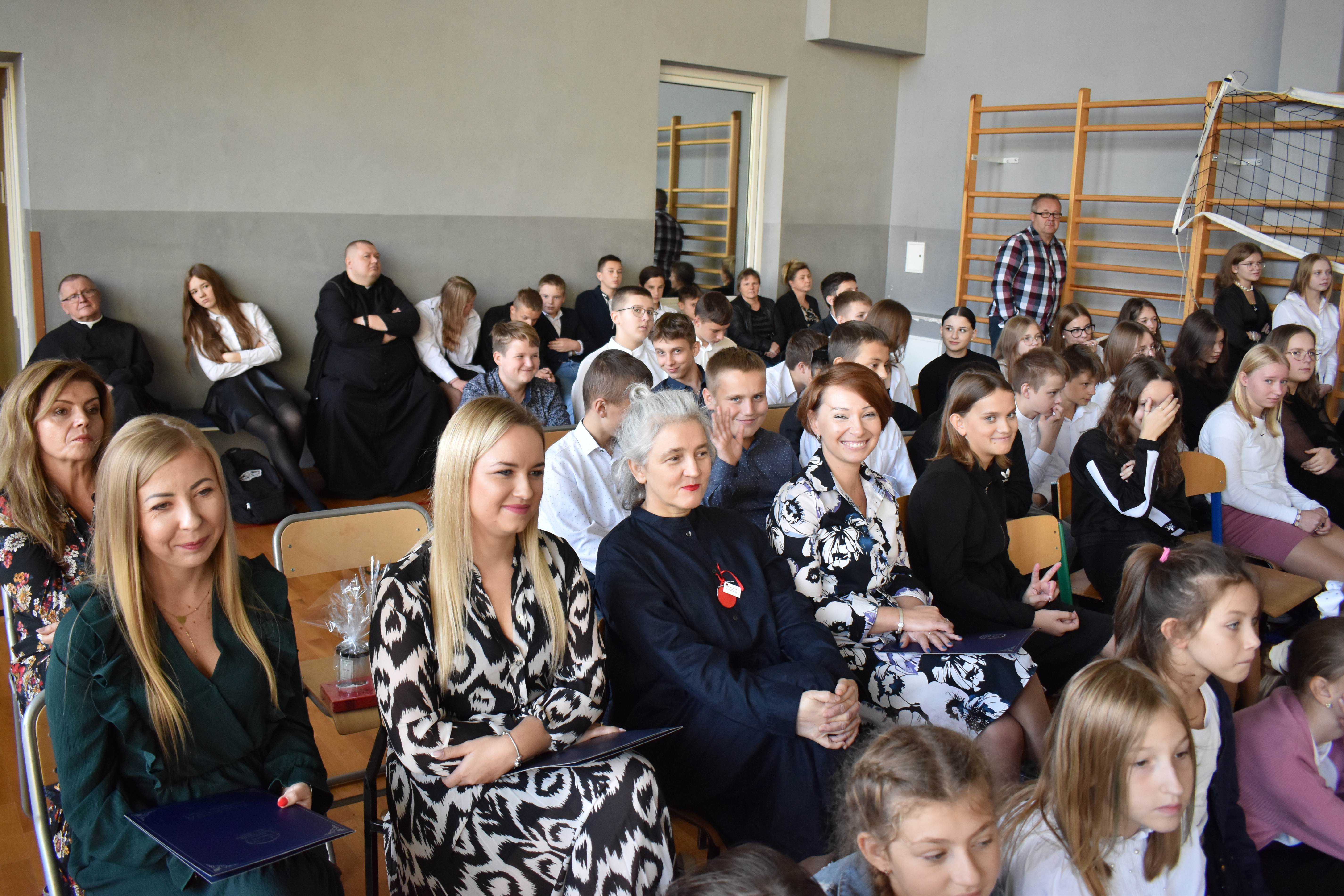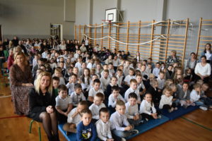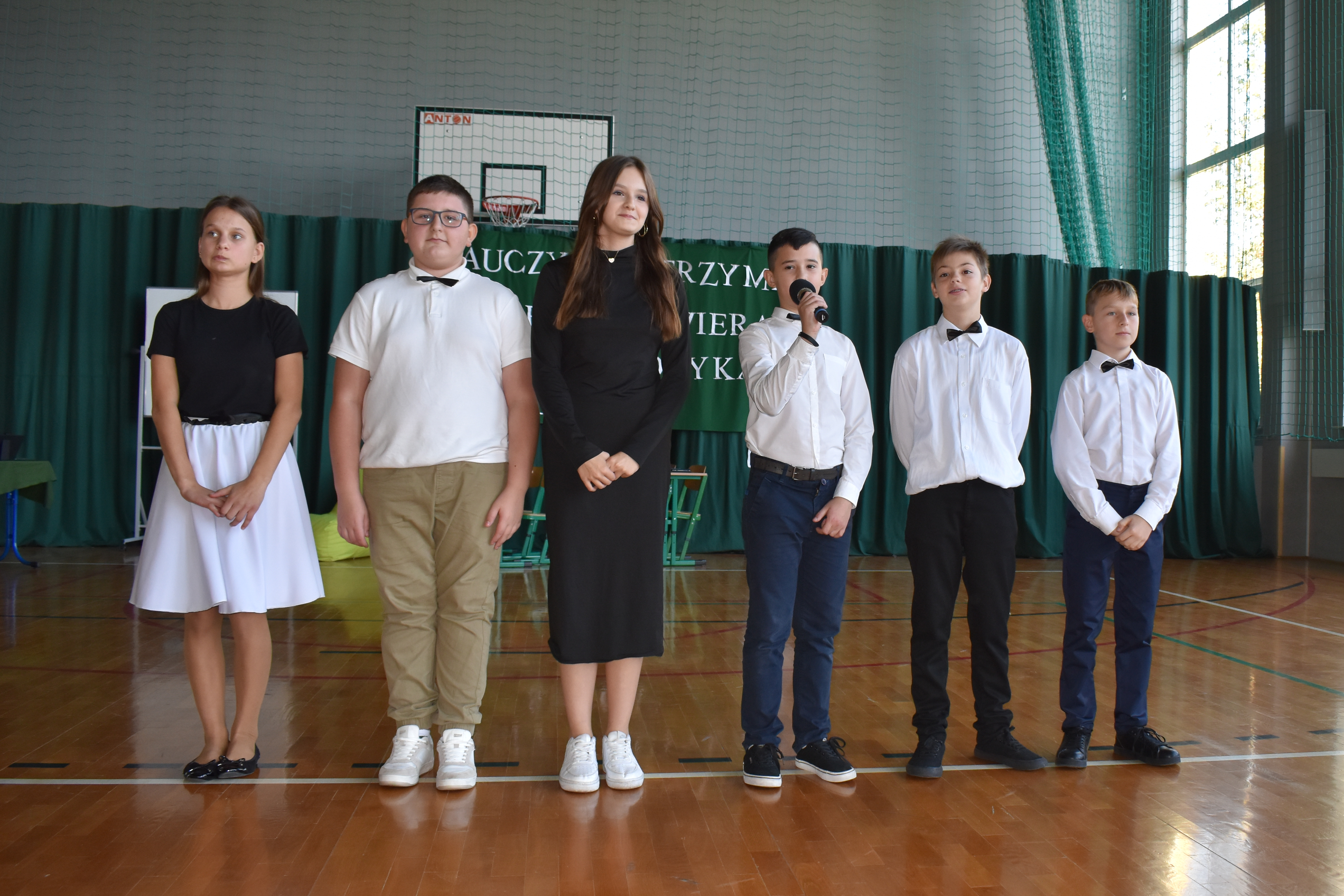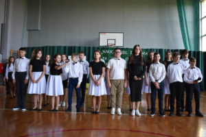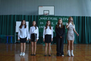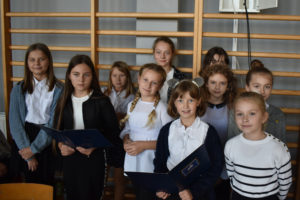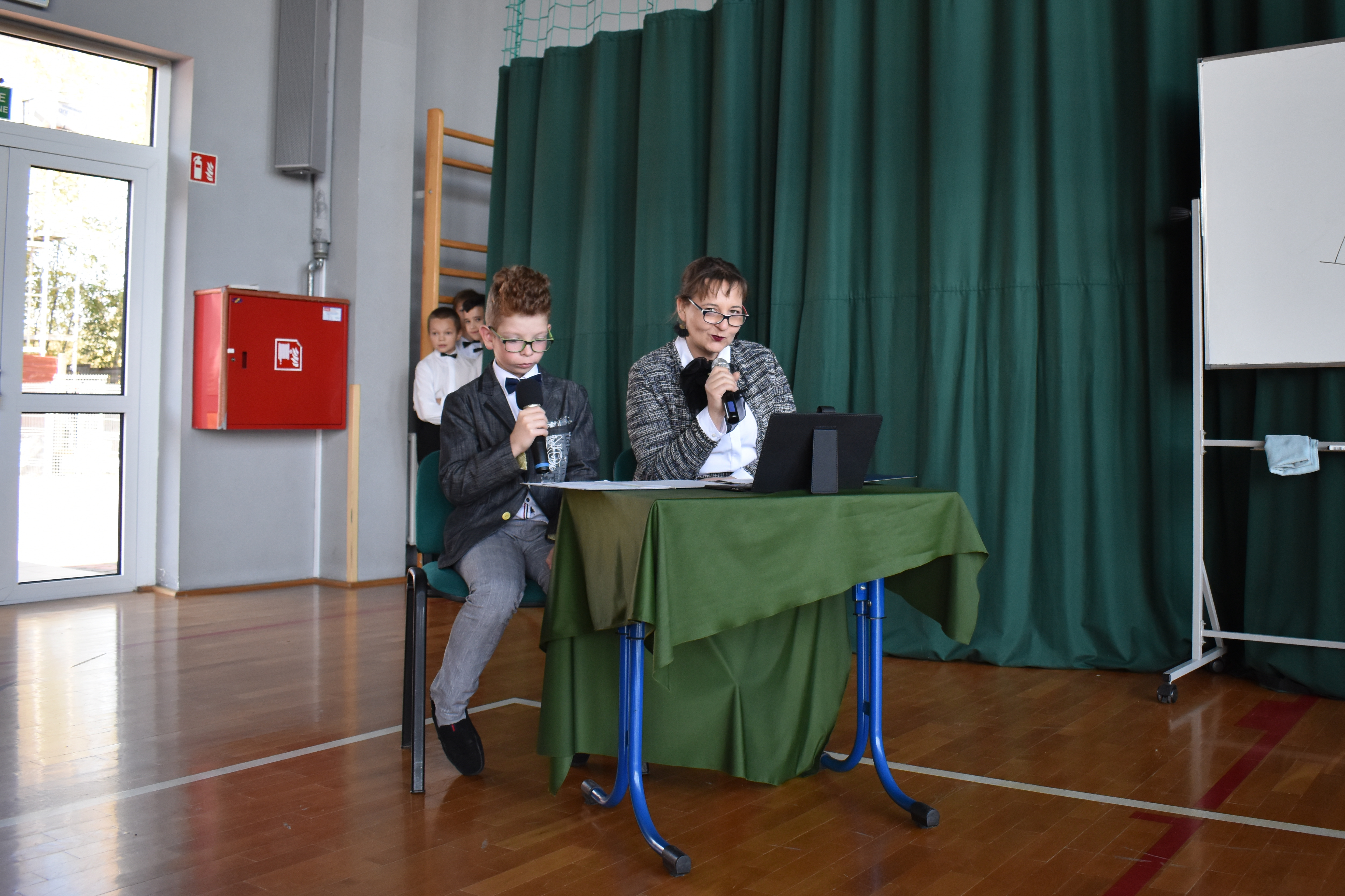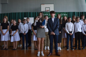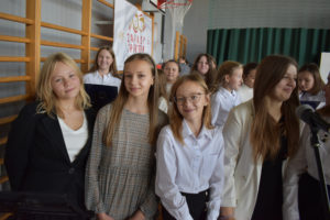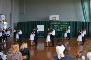 Po dużej przerwie wszystkie klasy zebrały się w szli gimnastycznej, żeby obejrzeć program liryczno – satyryczny przygotowany przez uczniów klas szóstych pod opieką wychowawców tych klas oraz wsparciu zespołu wokalnego. O oprawę plastyczną zadbały panie: Bożena Pietras i Katarzyna Orłowska. Program składał się z pięciu humorystycznych scenek z życia szkoły – także tej w zdalnym nauczaniu, przeplatany lirycznymi piosenkami. Gwoździem programu był piękny walc do muzyki Dymitra Szostakiewicza zaprezentowany przez uczniów klasy 6 b. Rodzice uczniów zadbali o eleganckie stroje, a pani Izabela Tracz ułożyła choreografię, która została nagrodzona gromkimi brawami.