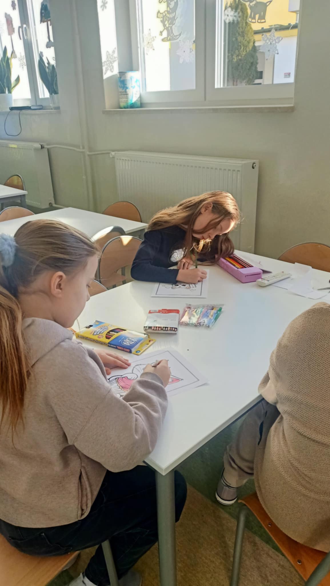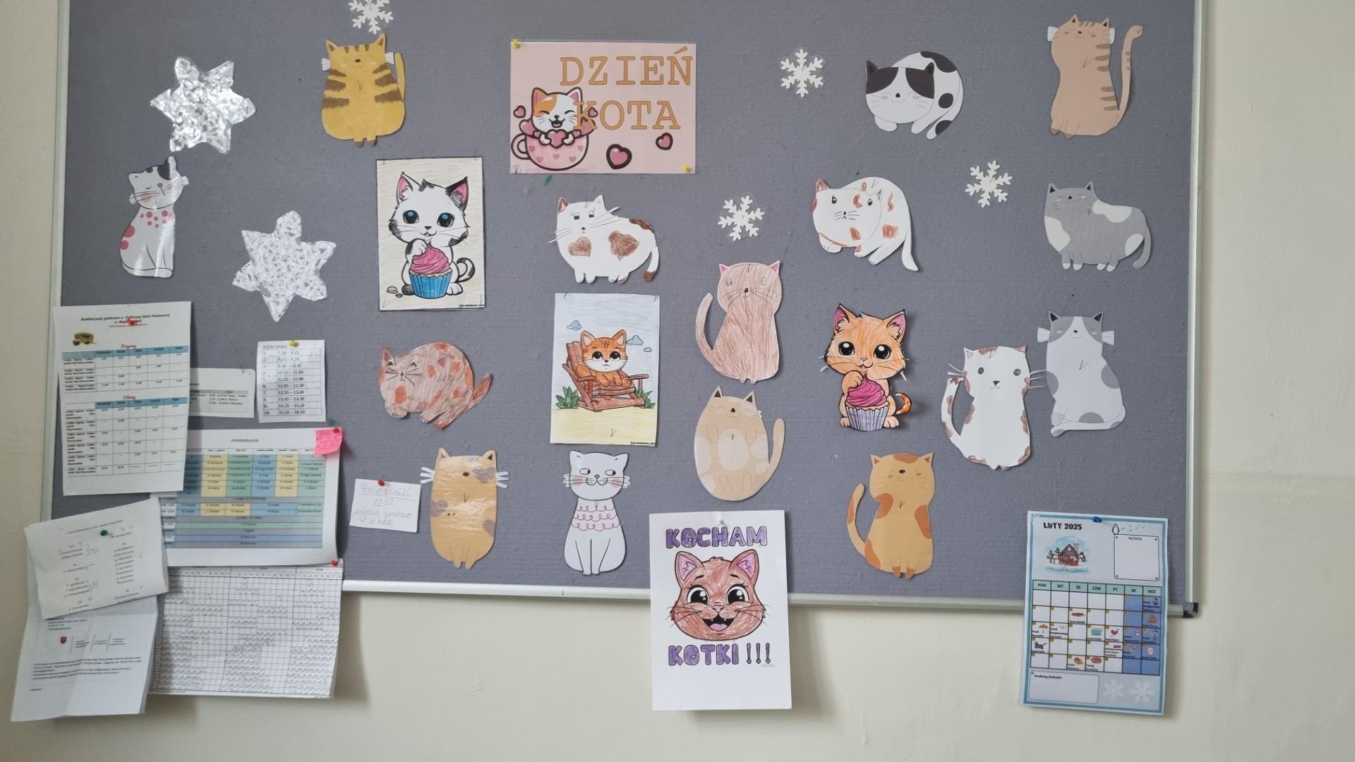 Kolejnym elementem Dnia Kota była praca plastyczna, związana oczywiście z tematem. Świetliczaki odrysowywały szablon kota i pięknie go zdobiły według własnego pomysłu. Były też kolorowanki z różnymi kotami. Dzięki kreatywnej pracy dzieci, tablica świetlicowa stała się naprawdę kocia 😊 Na koniec był zasłużony odpoczynek – oglądanie bajek z puchatymi bohaterami w roli głównej. To był prawdziwie koci dzień!
