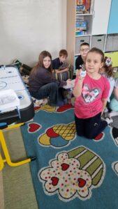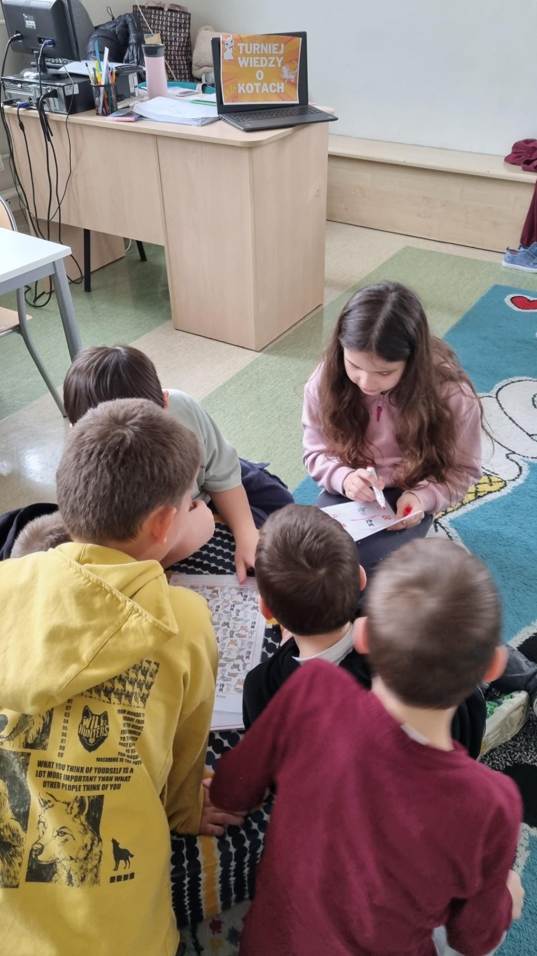 Następnie odbył się Turniej wiedzy o kotach, w którym dwie drużyny rywalizowały ze sobą, rozwiązując zadania i odpowiadając na pytania. Zadaniem dzieci było także ułożenie kociego diagramu według wzoru, czy policzenie wszystkich kotów na ilustracji. Zwycięska drużyna otrzymała słodką nagrodę.