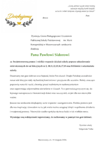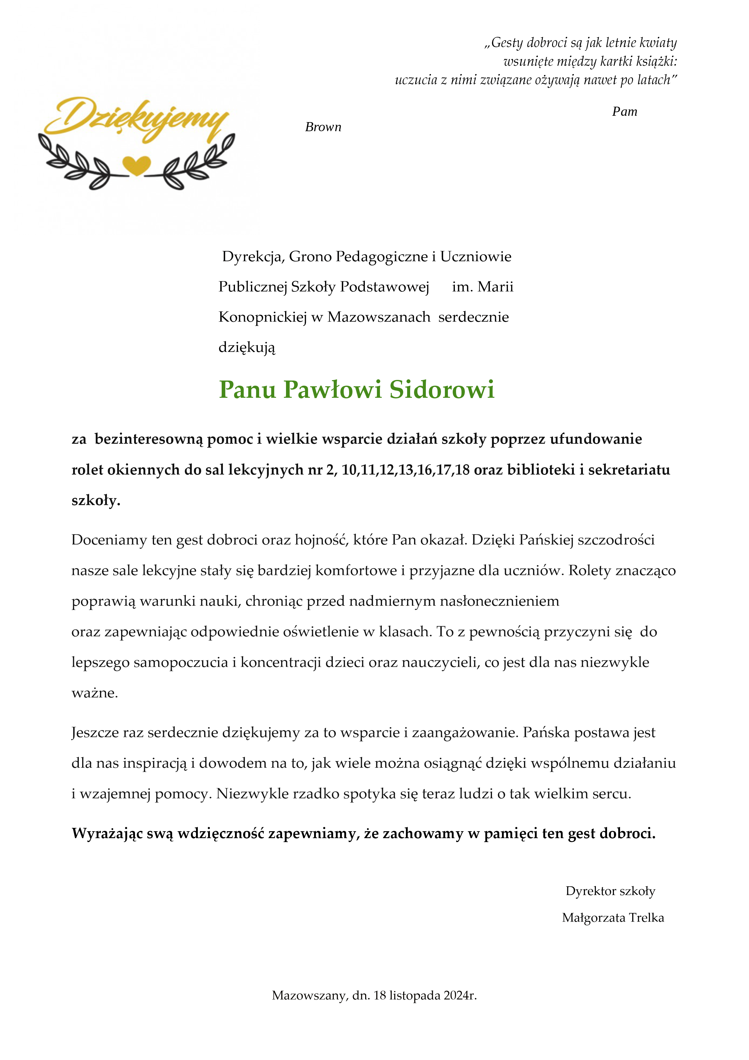 Dyrekcja, Grono Pedagogiczne i Uczniowie Publicznej Szkoły Podstawowej im. Marii Konopnickiej w Mazowszanach serdecznie dziękują Panu Pawłowi Sidorowi za bezinteresowną pomoc i wielkie wsparcie działań szkoły poprzez ufundowanie rolet okiennych do sal lekcyjnych nr 2, 10,11,12,13,16,17,18 oraz biblioteki i sekretariatu szkoły.