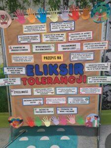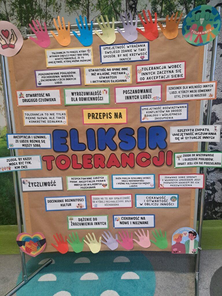 Dla uczniów klas IV – VIII zostały przygotowane dwa scenariusze lekcji na godzinę wychowawczą: “Warsztaty tworzenia Eliksiru Tolerancji” oraz “Eliksir Tolerancji”. Punktem kulminacyjnym obchodów było wspólne wykonanie Drzewa Tolerancji, które składało się z kolorowych karteczek i odrysowanych dłoni, na których widniały hasła kojarzące się z tolerancją. To wyjątkowe wydarzenie nie tylko wzbogaciło wiedzę uczniów, ale pozwoliło im również wyrazić siebie oraz lepiej zrozumieć, jak ważne jest akceptowanie drugiego człowieka, bez względu na różnice, które nas dzielą.