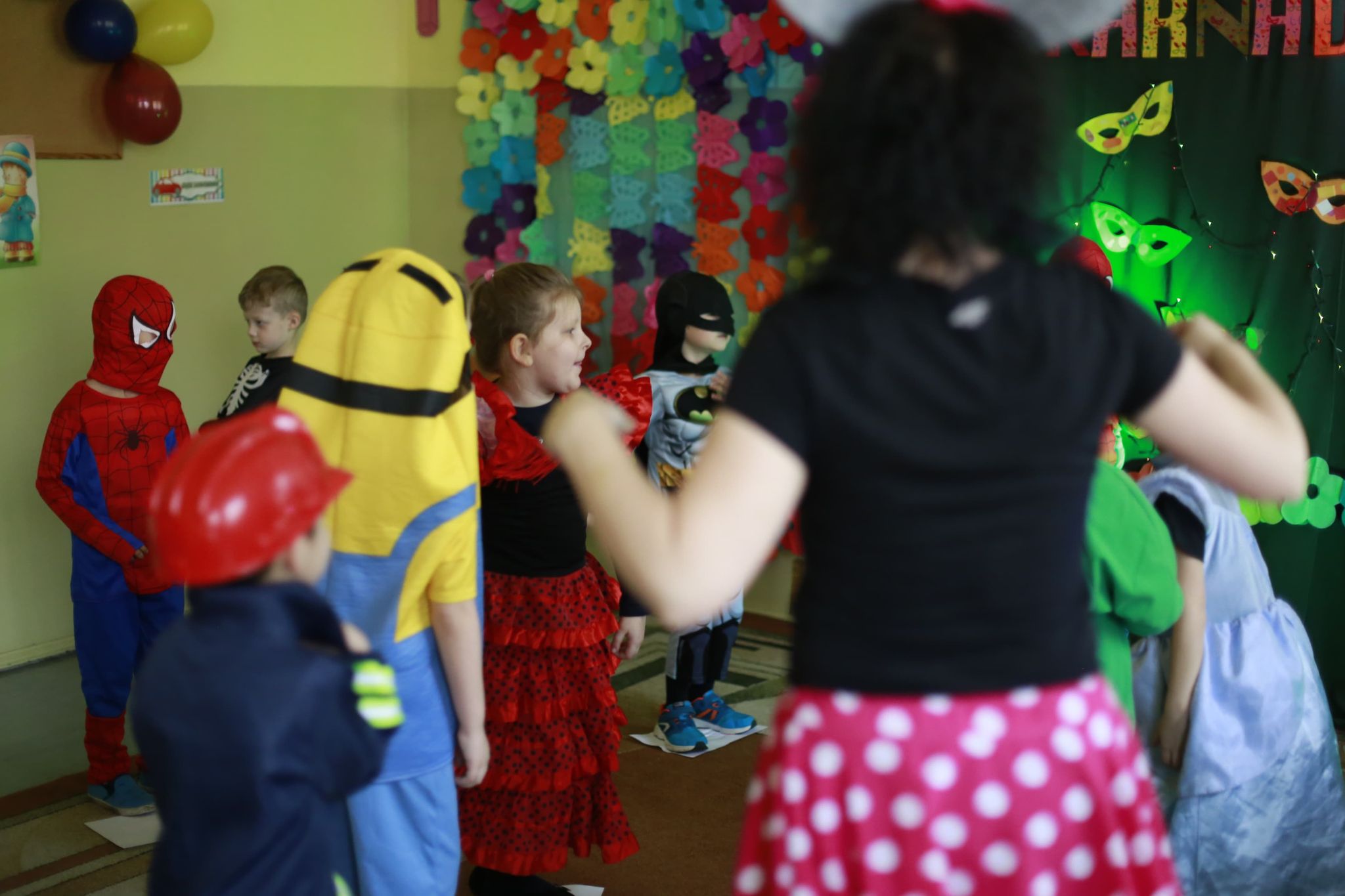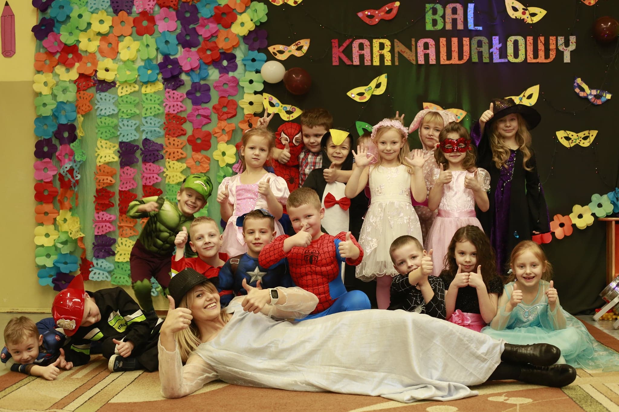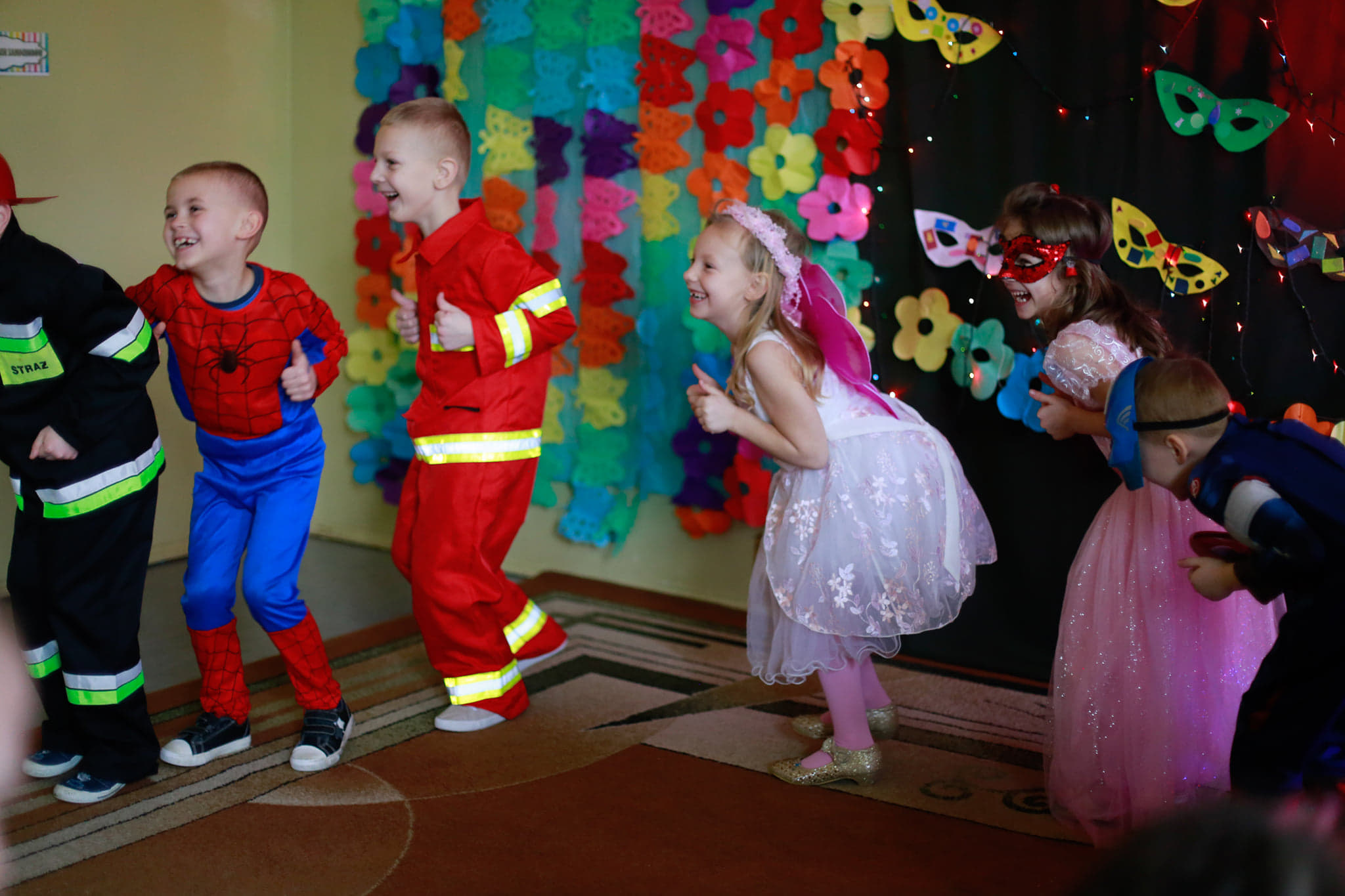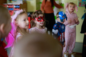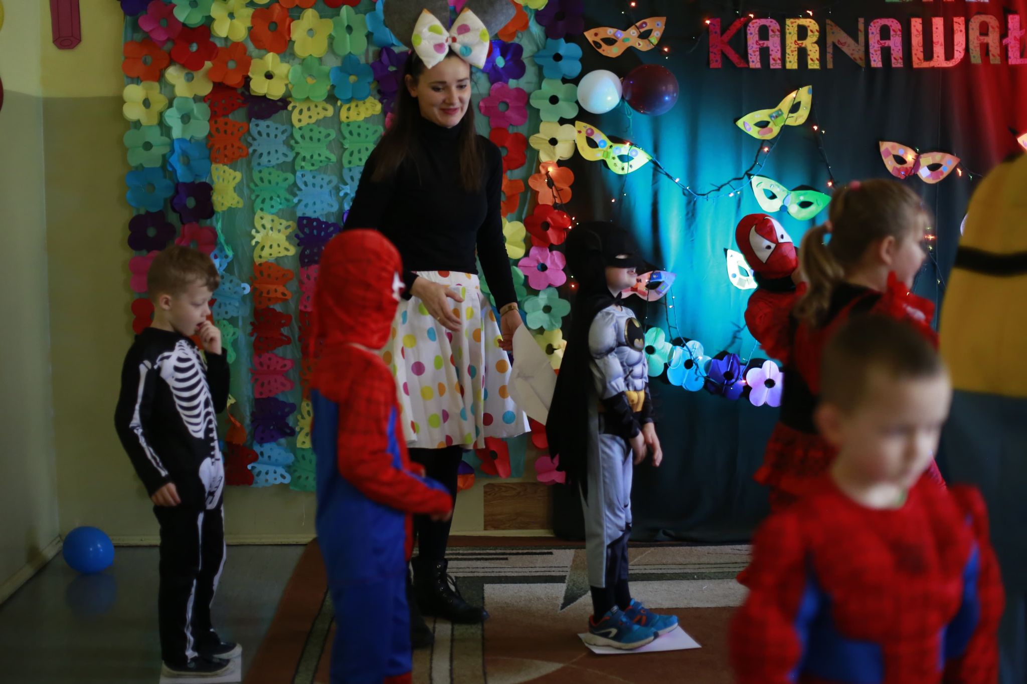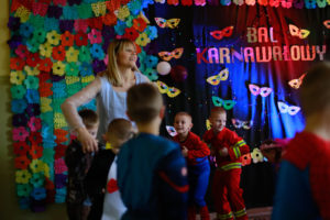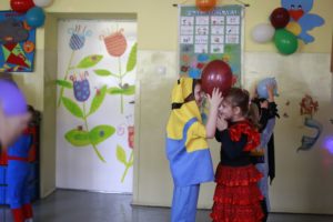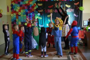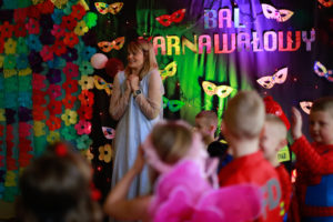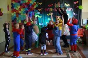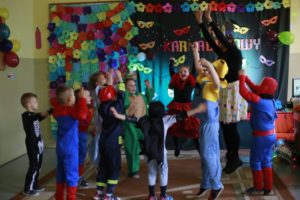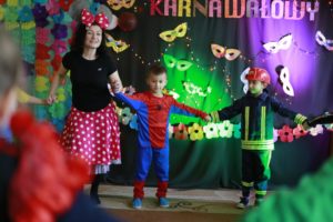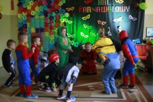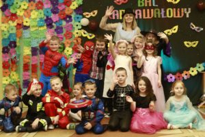 Bal karnawałowy dla przedszkolaków to dzień niezwykły, często wyczekiwany przez wiele tygodni. Jest atrakcją bardzo lubianą przez dzieci, dostarczającą im wielu przeżyć i radości. Tak też było u nas w dniu 4 lutego. Już od rana w przedszkolu pojawiały się kolorowe postacie. Dzieci przebrane były za bohaterów znanych bajek, w sali przedszkolnej można było spotkać wróżki, królewny, delikatne motylki, strażaków, Spider-Mana itd., nie sposób zliczyć i wymienić tych wszystkich postaci. Dzieci świetnie się bawiły w gronie swoich nauczycieli, którzy uatrakcyjnili bal różnymi zabawami i konkursami. Nauczycielki przedszkola dołożyły wszelkich starań, by wystrój sali balowej wprowadził dzieci w radosny, bajkowy nastrój oraz zachęcał do wesołej zabawy.