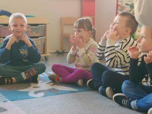 Od października 2023r. dzieci z oddziałów przedszkolnych 0a, 0b oraz z Krasnoludków uczestniczyły w zajęciach, prowadzonych przez pedagoga, psychologa i logopedę szkolnego, w ramach innowacji pedagogicznej “Emocjonalny LogoRytm: słyszę, mówię, czuję”.