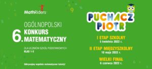 5 kwietnia 2022r. uczniowie klas I- III wzięli udział w VI edycji Ogólnopolskiego Konkursu Matematycznego „Puchacz Piotr”, którego organizatorem jest sieć Centrów Nauczania Matematyki MathRiders.