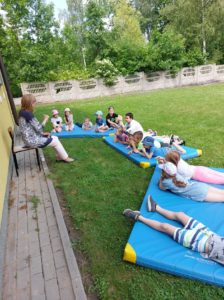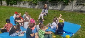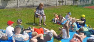 W plenerze, w słonecznej aurze, wśród śpiewu ptaków oraz przy kojącej muzyce relaksacyjnej dzieci wysłuchały bajki terapeutycznej, która miała wyciszyć, koić smuteczki i rozdrażnienia oraz niwelować nadmiar energii. Bajka o sympatycznym kotku, który znalazł się „w krainie łagodności”, pozwoliła niektórym dzieciom tak się zrelaksować, że zasnęły. Dzięki zajęciom, przedszkolaki miały możliwość poznania technik relaksacyjnych, poprawiających samopoczucie.