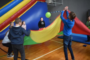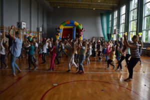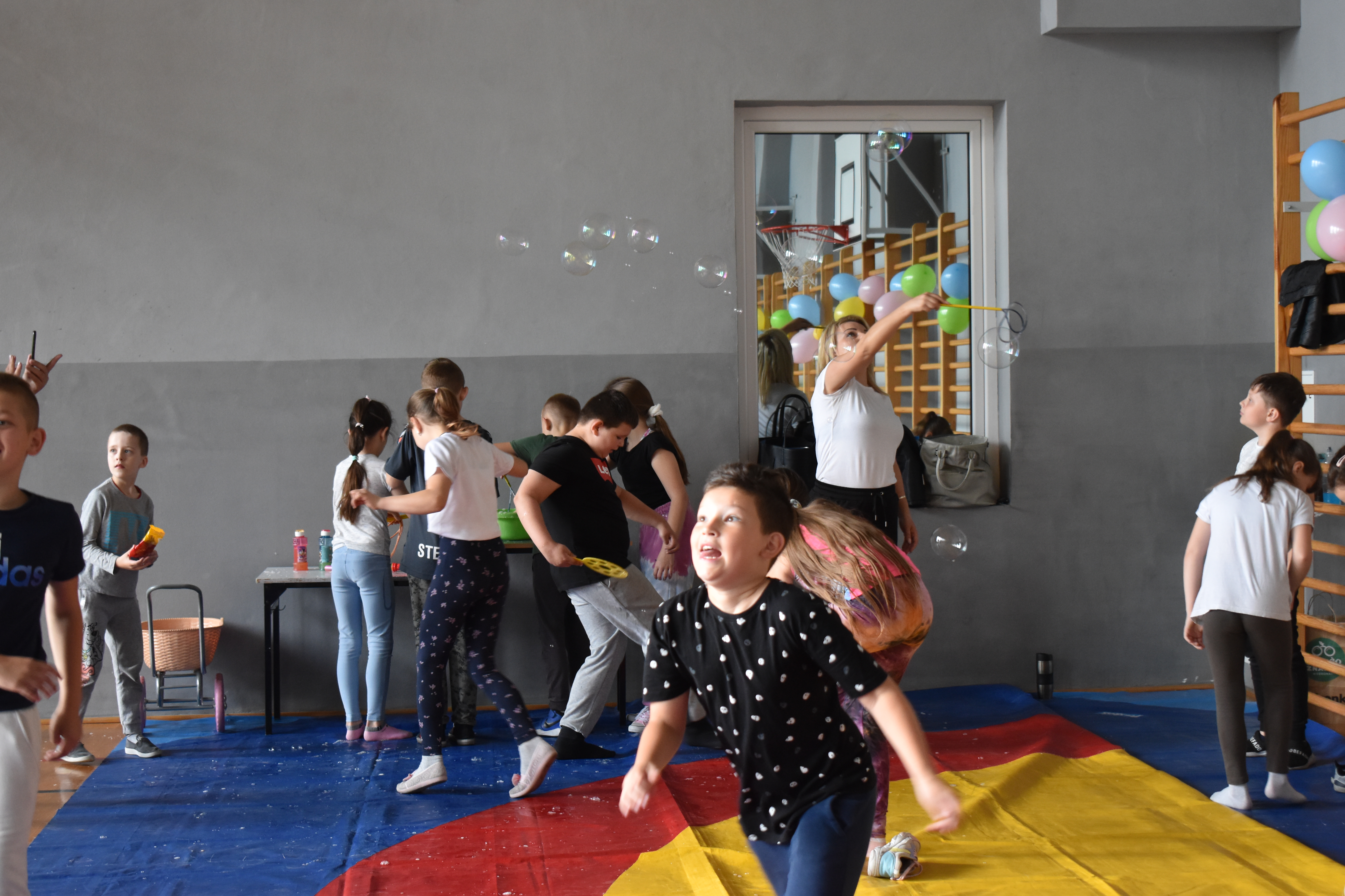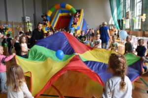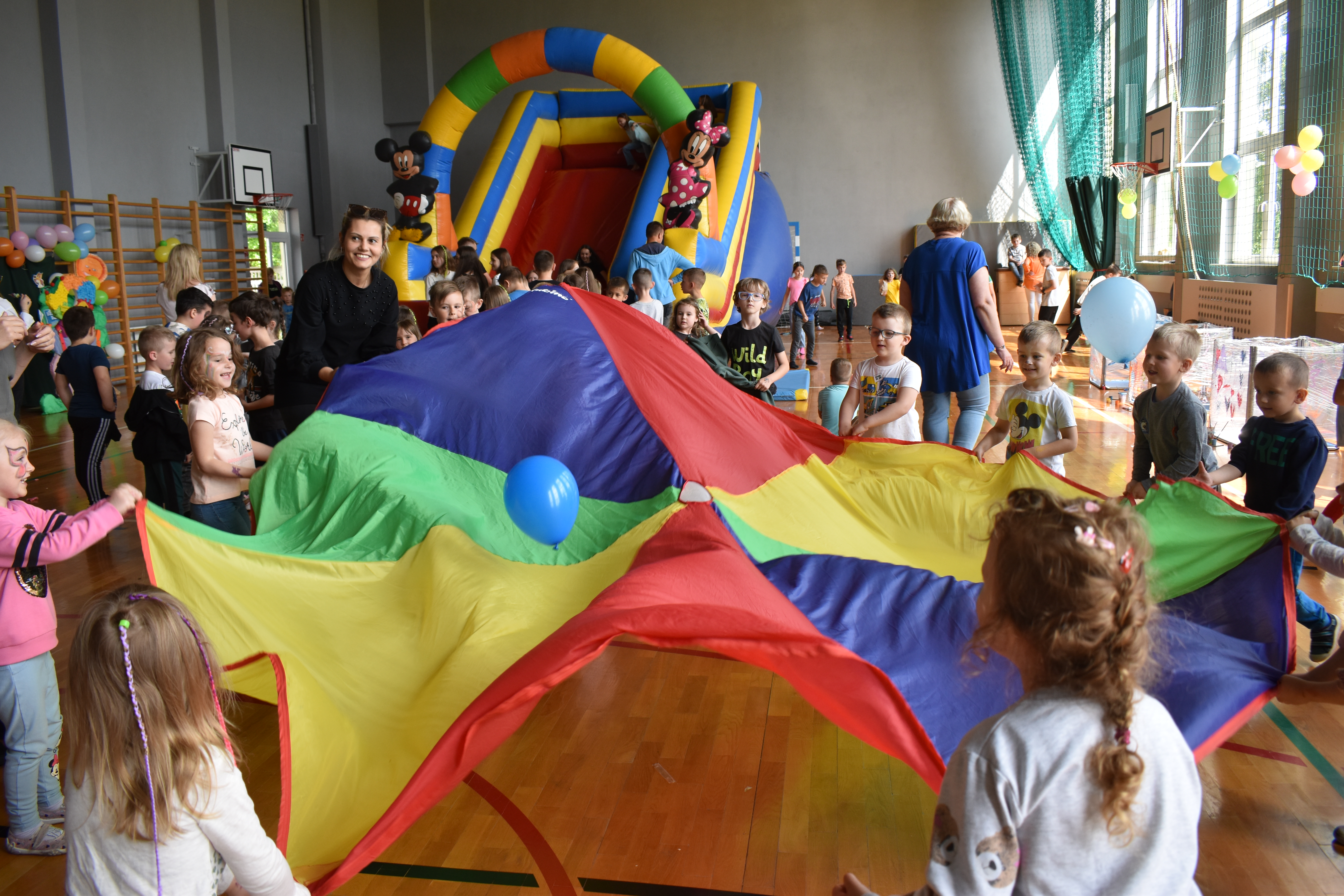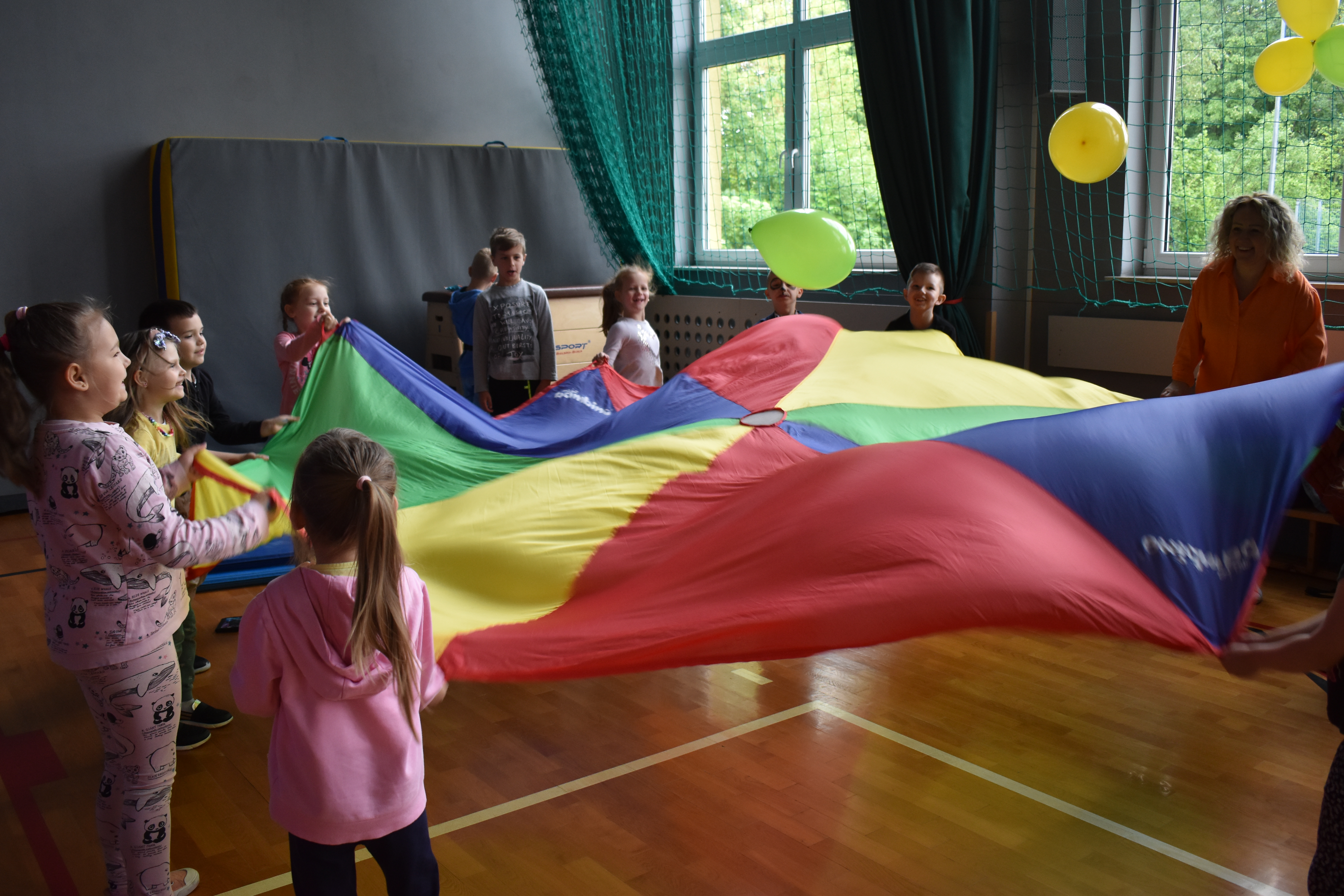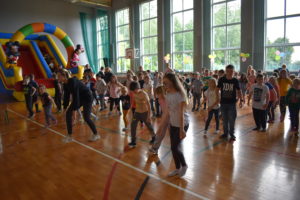 W czerwcu świętowaliśmy w naszej szkole Dzień Dziecka. Pogoda na dworze nie dopisała, ale uczniowska radość i pogoda ducha wypełniła salę gimnastyczną. Wydarzeniu towarzyszyło wiele niespodzianek, jednakże najwięcej emocji wśród naszych uczniów wywołał ogromny dmuchaniec.