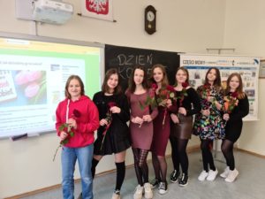 Już z samego rana koleżanki z klasy zostały obdarowane pięknymi różami. Zaś na lekcji wychowawczej chłopcy przygotowali dla płci pięknej słodką niespodziankę. Wśród przygotowanych smakołyków były babeczki i ciasteczka pieczone samodzielnie przez naszych dżentelmenów.
