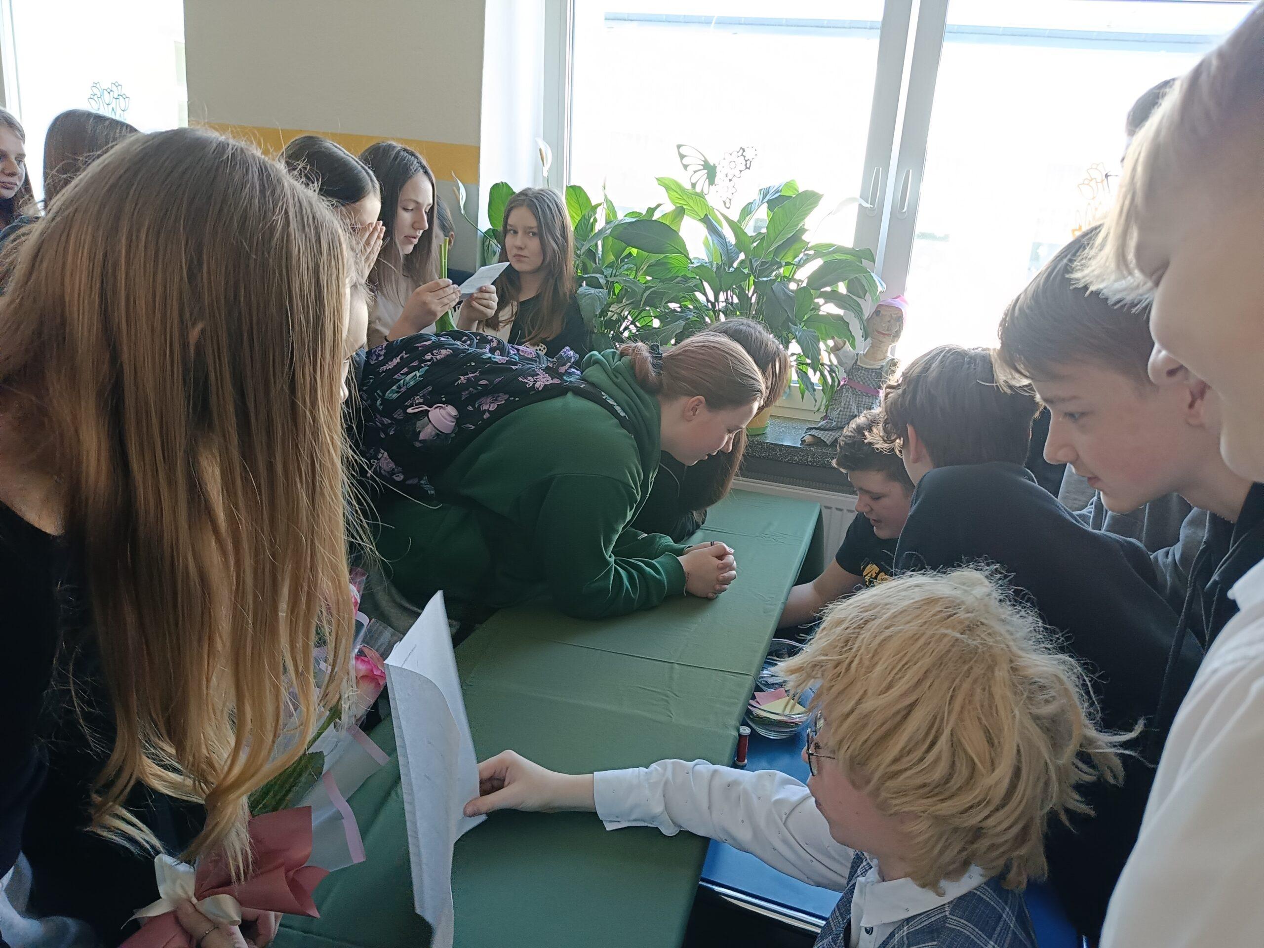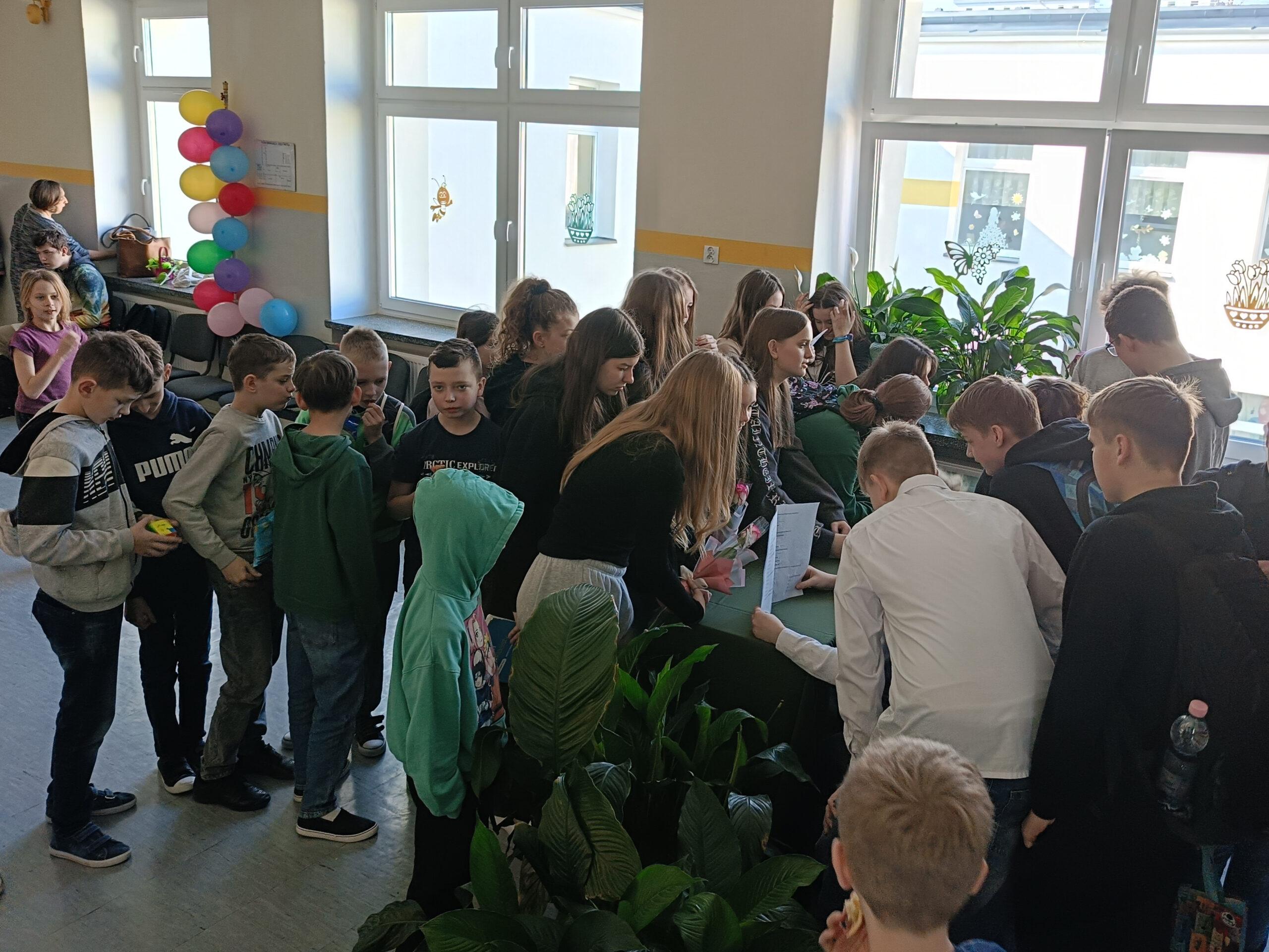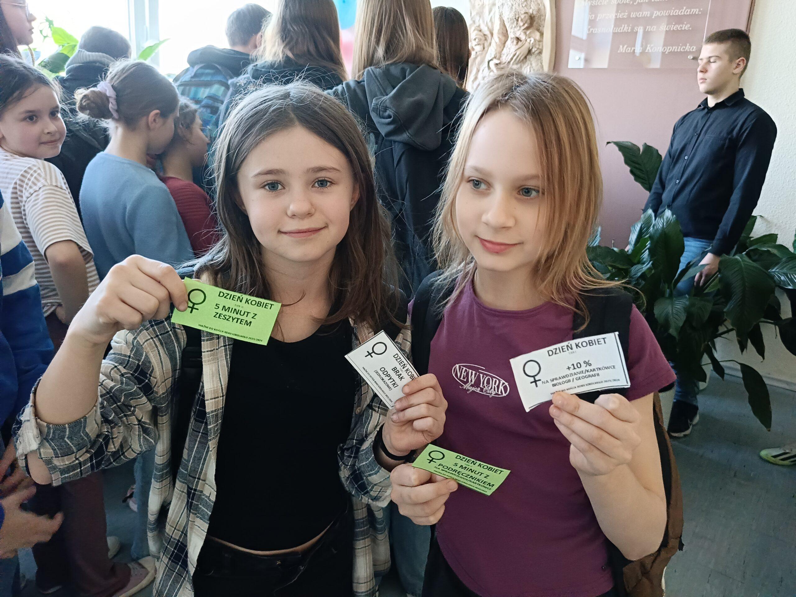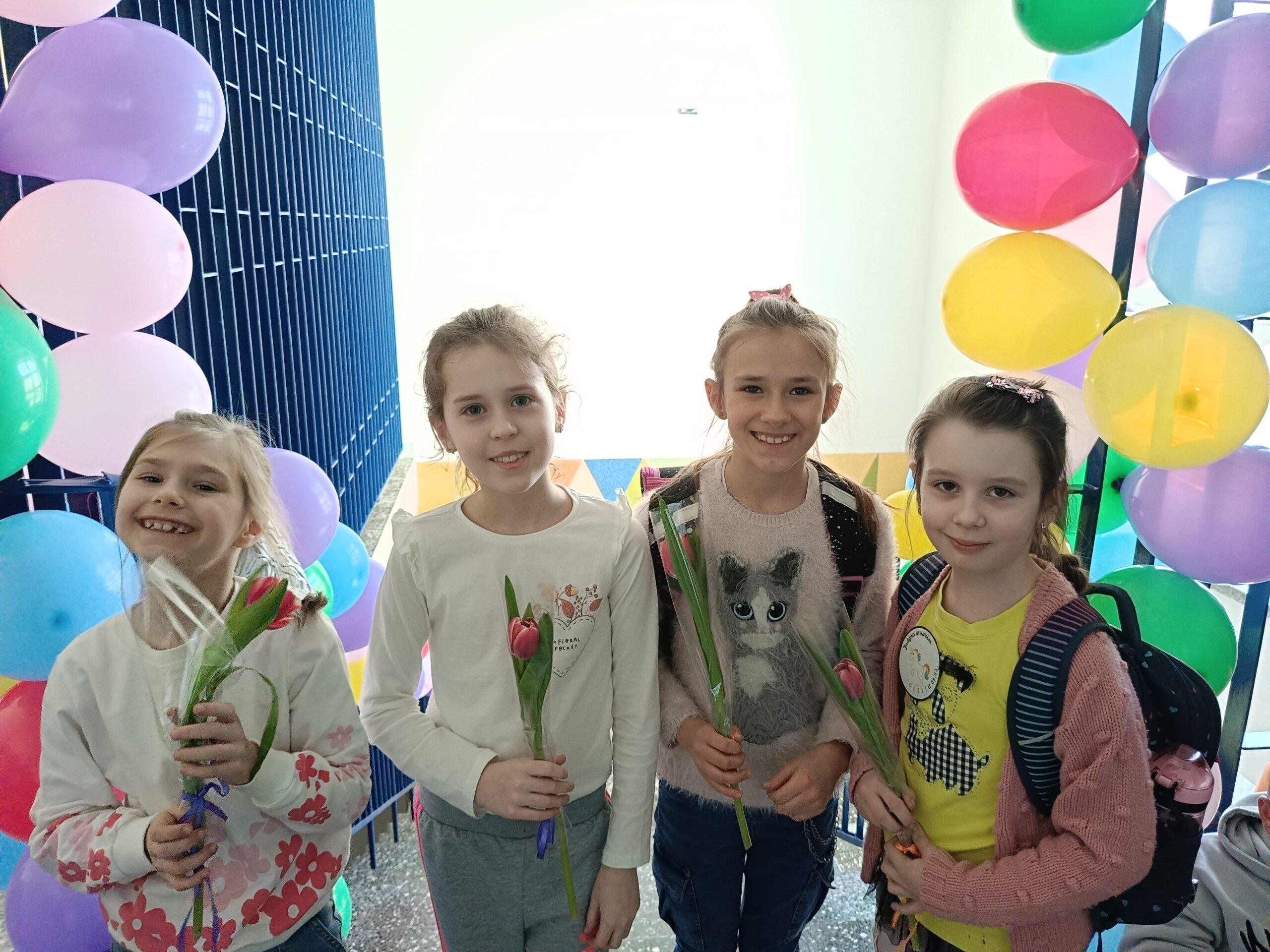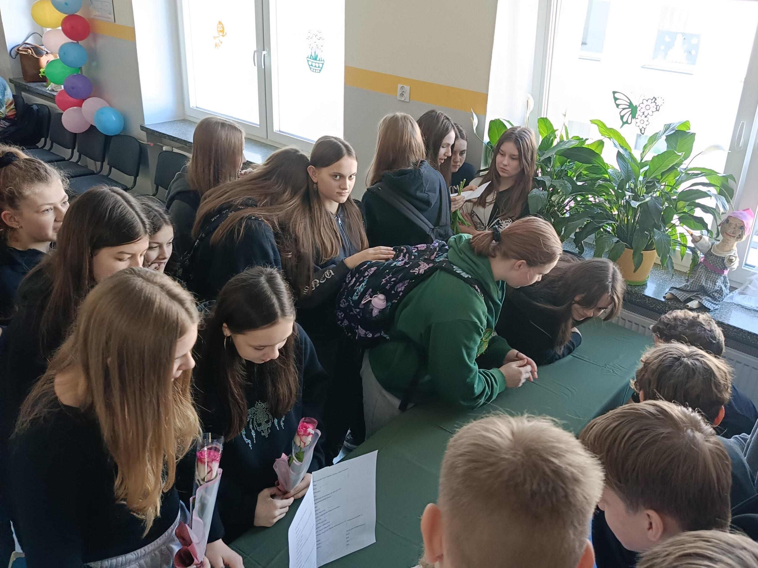Już od rana chłopcy w klasach wręczali dziewczynkom kwiaty i upominki. Na szkolnych korytarzach pojawiły się dekoracje, a na tablicach piękne plakaty z życzeniami. W czasie przerw chłopcy poprowadzili quiz, z bardzo atrakcyjnymi nagrodami: dzień bez pytania, zwolnienie z pracy domowej, pisanie kartkówki z podręcznikiem. Dzień Kobiet w naszej szkole był pełen radości i śmiechu. Wszystkie panie mogły poczuć się wyjątkowo.