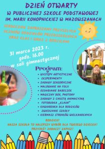 Bardzo serdecznie zapraszamy kandydatów na przyszłych uczniów oddziałów przedszkolnych oraz klas pierwszych wraz z rodzicami na Dzień Otwarty Szkoły. Spotkanie odbędzie się 31 marca 2023 r. (piątek) o godzinie 16.00 w sali gimnastycznej PSP im. Marii Konopnickiej w Mazowszanach.