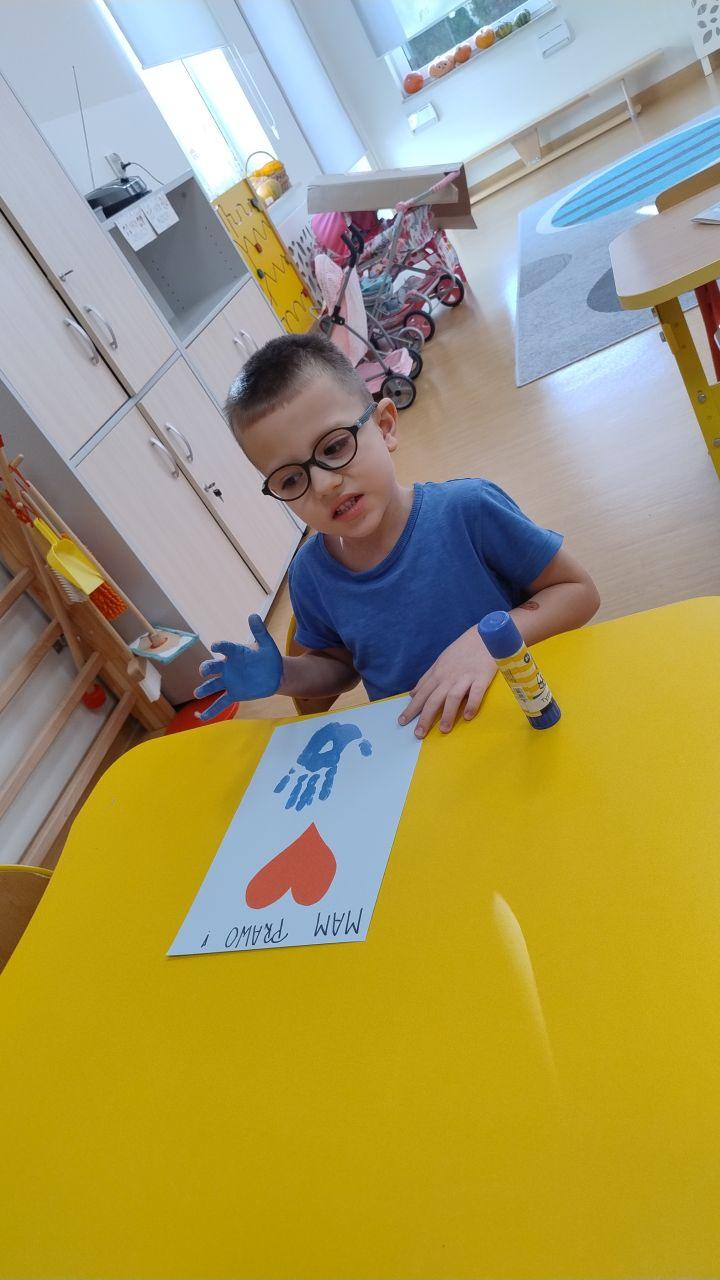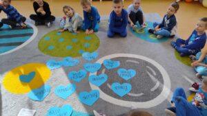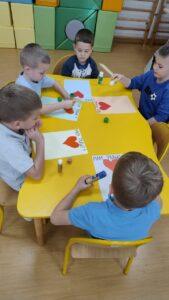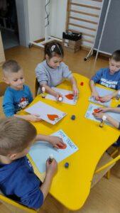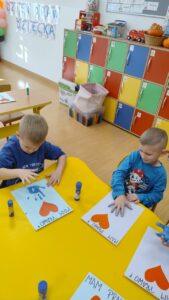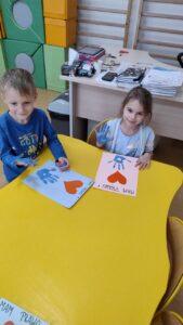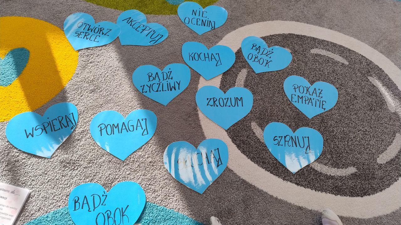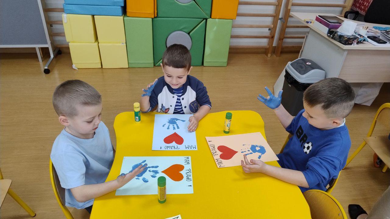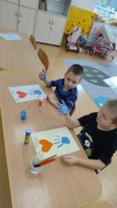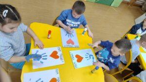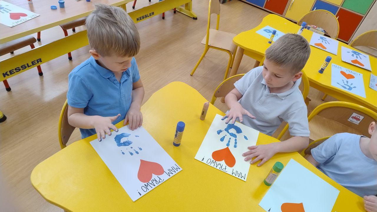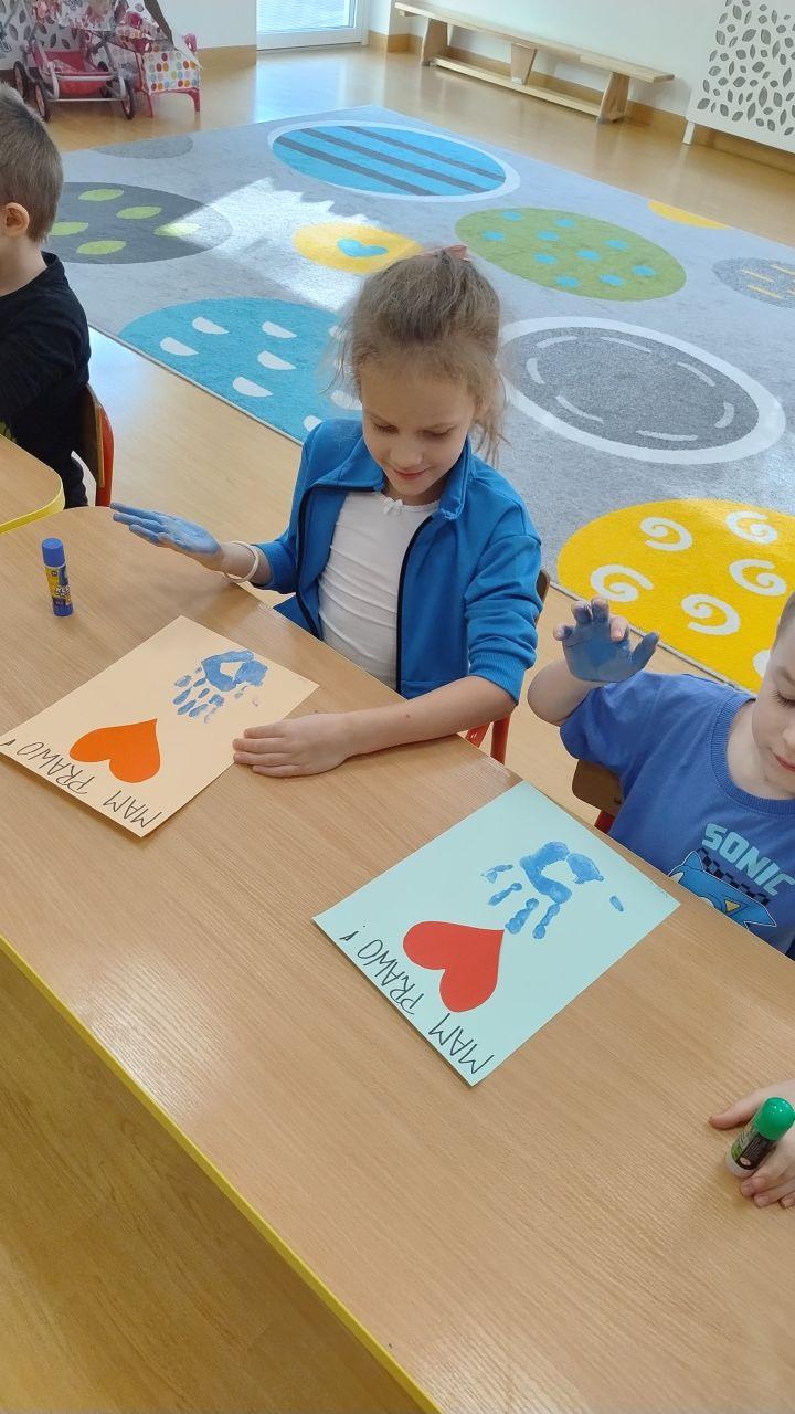 Kolejnym punktem dnia były twórcze zajęcia plastyczne pod hasłem „Mam Prawo…”. Dzieci wykonały piękne prace, ozdabiając je czerwonym serduszkiem oraz odbiciem swojej niebieskiej dłoni -symbolem jedności i wspólnoty.
