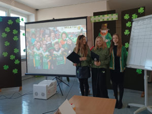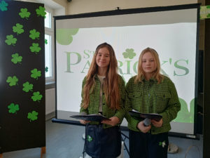 W dniu 17 marca br. w naszej szkole odbyły się obchody Dnia św. Patryka – patrona Irlandii. Z tej okazji nasza szkoła przybrała się już w iście wiosenne barwy. Wszędzie królowały zielone koniczynki, a uczniowie klas 5-7 przystąpili do szkolnego quizu na temat wiedzy o Irlandii, jej symboli narodowych, kultury, muzyki i kuchni. Konkurs został wzbogacony o irlandzkie piosenki i tańce.