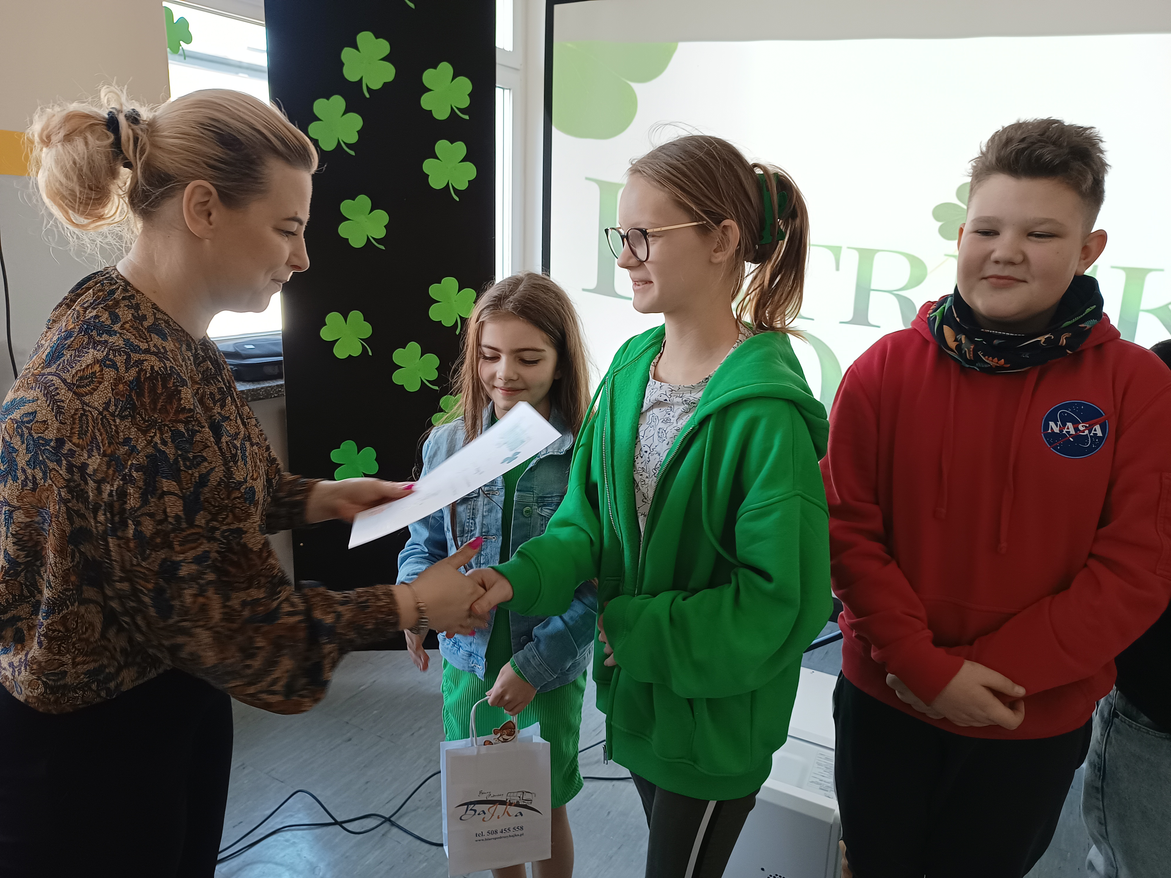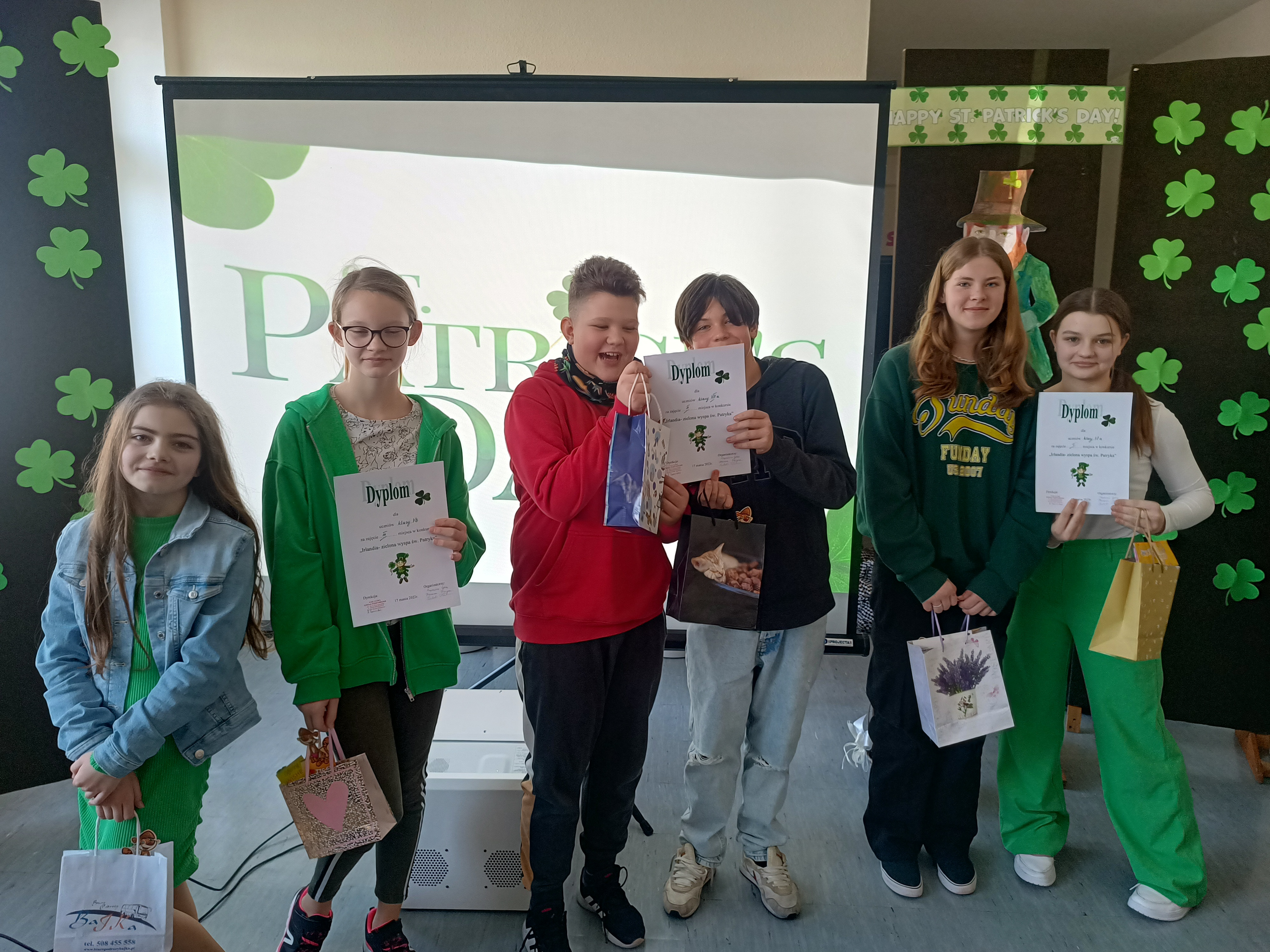 Zwycięzcami quizu okazali się uczniowie klasy VIa, II miejsce zdobyła klasa VIIa, a miejsce III przypadło klasie Vb. Obchody irlandzkiego święta wzbogaciła Zielona Kawiarenka, w której uczniowie mogli nabyć słodkie przysmaki w kolorach irlandzkiej flagi – czyli zielonym, pomarańczowym i białym.