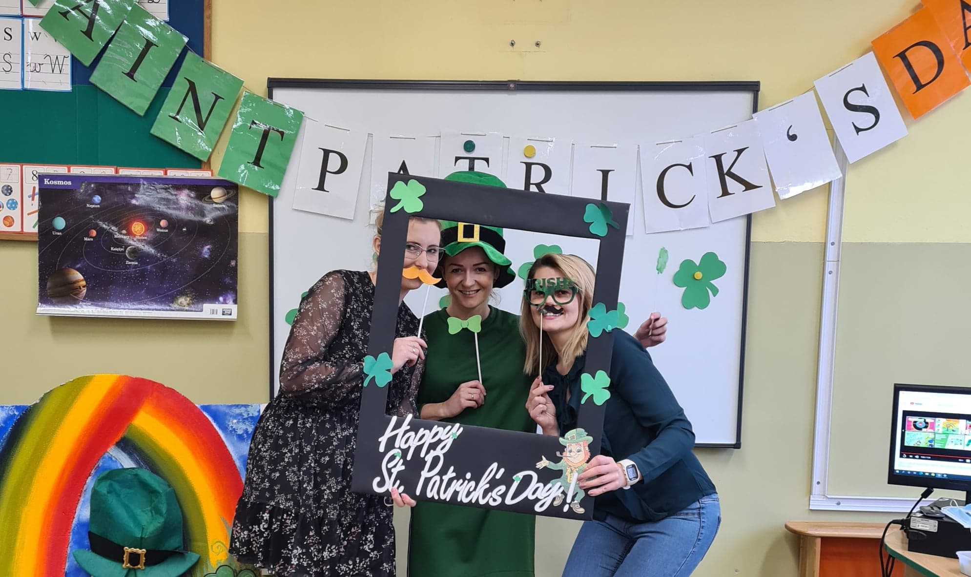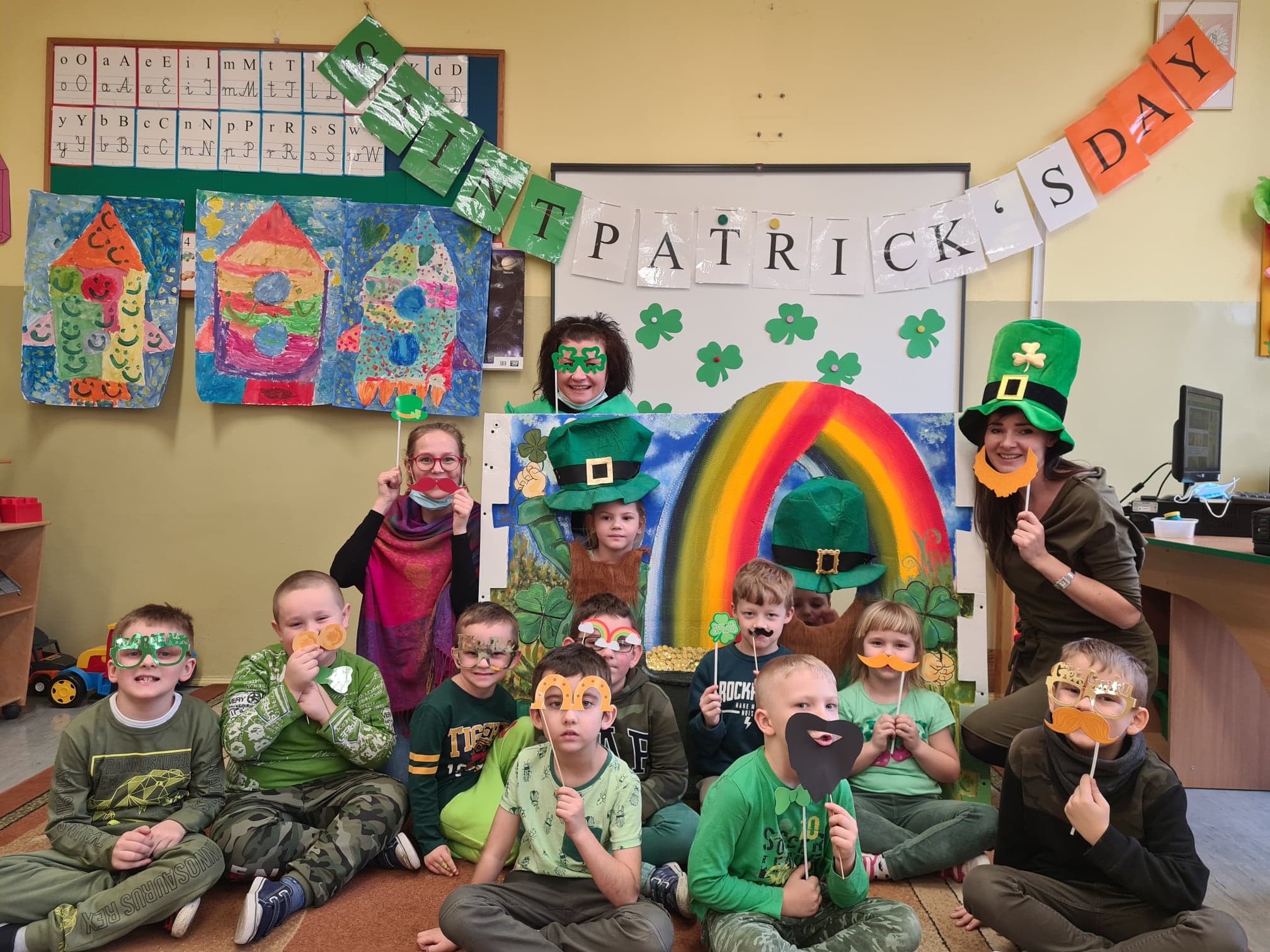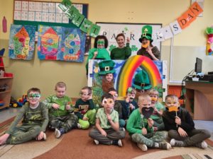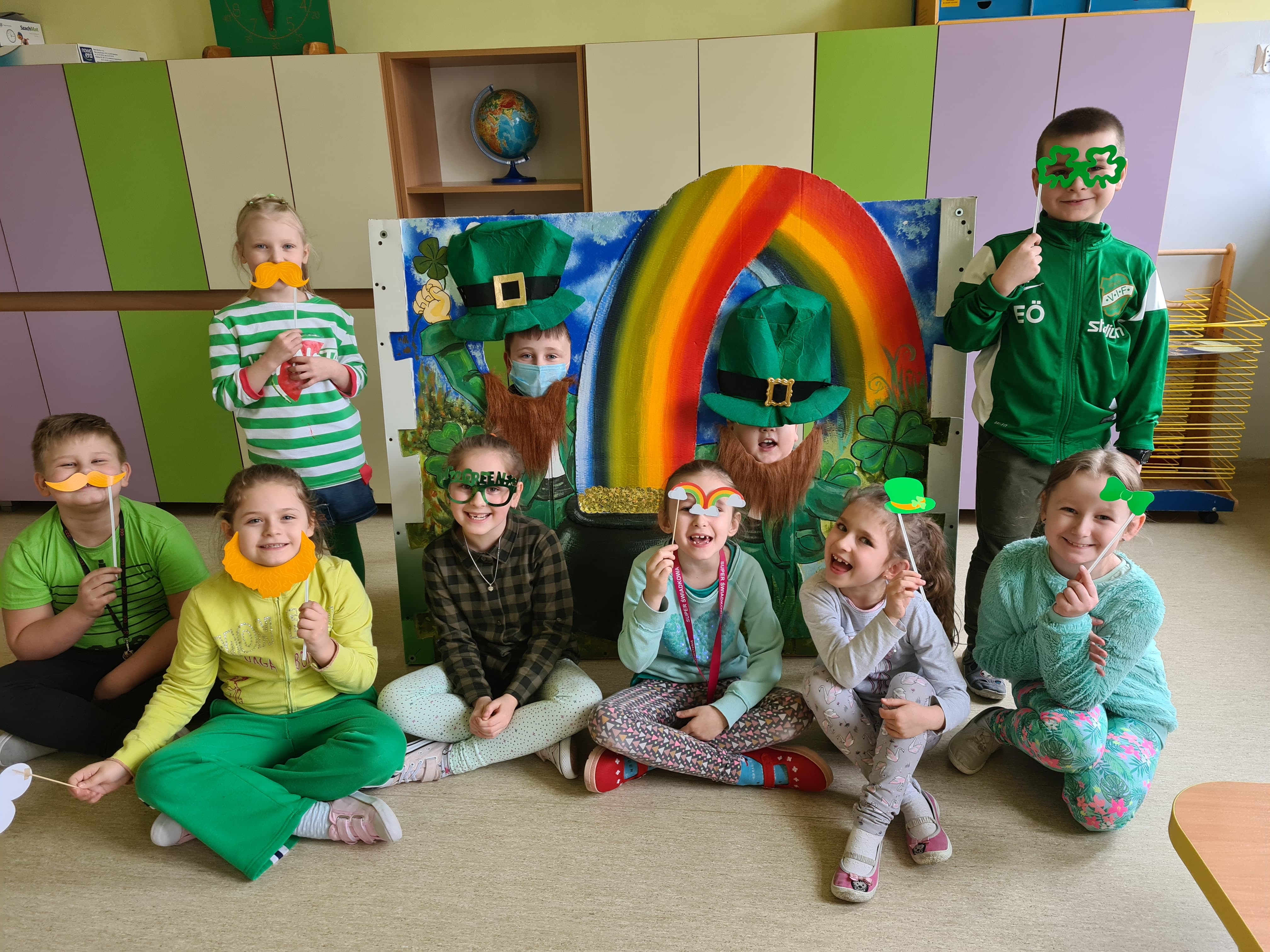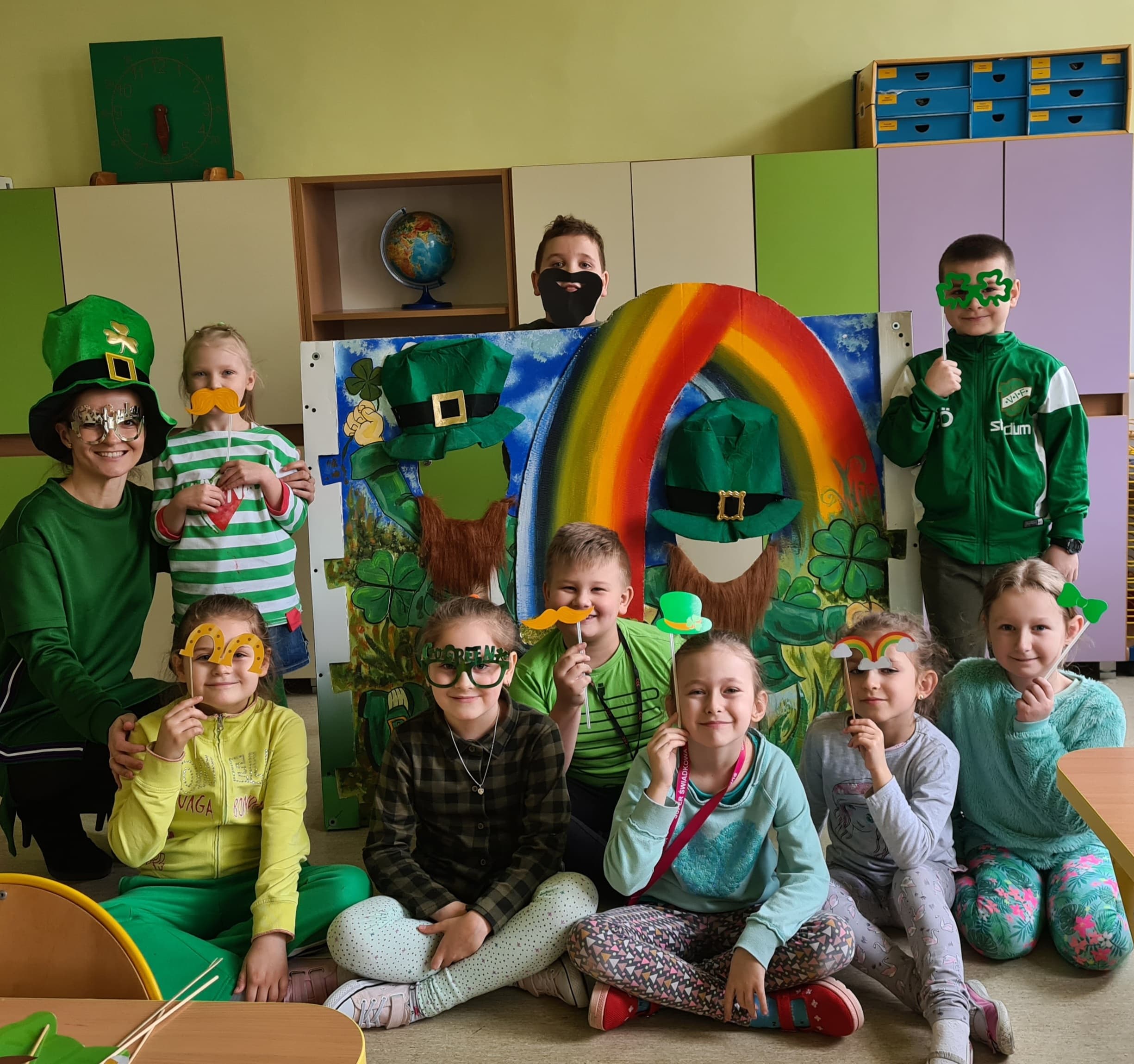 Dzień św. Patryka to jedno z najweselszych świąt obchodzone dziś na całym świecie. Pomimo pandemii nie odpuściliśmy i w tym roku również dołączyliśmy do „zielonego świętowania.” Dla uczniów naszej szkoły jest to nie tylko dobra zabawa ale przede wszystkim doskonała okazja do zaznajomienia się z elementami kultury anglosaskiej. Solidaryzując się z mieszkańcami szmaragdowej wyspy założyliśmy w tym dniu zielone stroje oraz kapelusze Leprechauna, przyozdobiliśmy sale trójlistnymi koniczynami. W trakcie lekcji j. angielskiego dzieci tańczyły taniec Leprechauna, pozowały do zdjęć w foto budce, poznały historię św. Patryka i złośliwego skrzata, obejrzały filmik w j. angielskim poświęcony Irlandii. Najodważniejsi zdecydowali się wziąć udział w tanecznym wyzwaniu i zatańczyć Irish Jig zaś dziewczynki z koła wokalnego, pod opieką p. Tracz, przygotowały piosenkę Lepreachauna w wersji wokalnej i instrumentalnej. Dziękujemy wszystkim za zaangażowanie.
