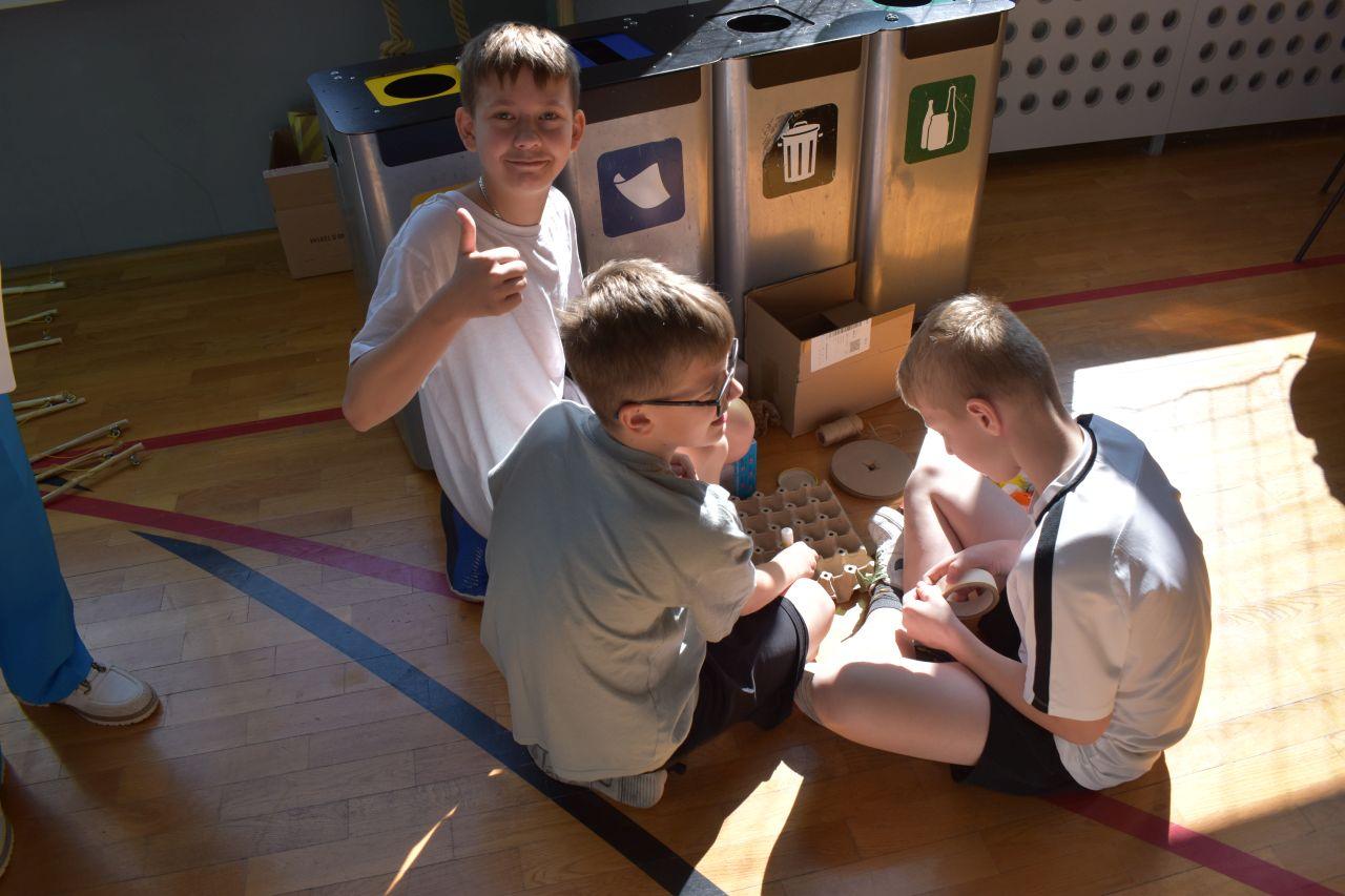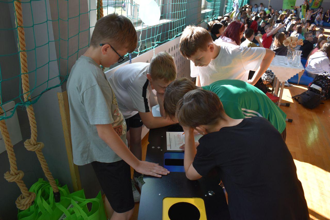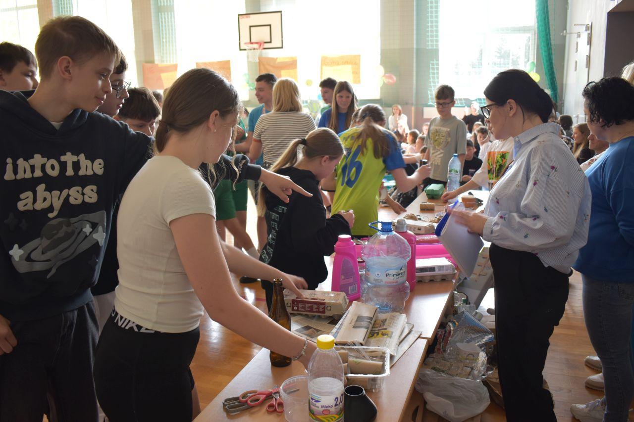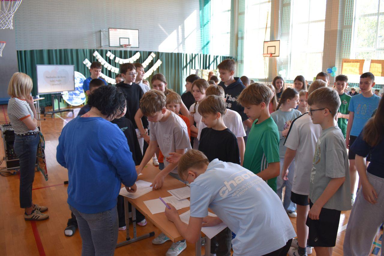 W czasie, gdy w sali gimnastycznej starsi uczniowie zmagali się z ekologicznymi konkurencjami, na górnym korytarzu klasy 1-3 miały okazję odwiedzić eko-stoiska, przygotowane specjalnie dla nich. Młodsi uczniowie także potwierdzili, że dbanie o planetę nie jest im obce. Doskonale radzili sobie z zadaniami, które ochoczo prezentowali im wolontariusze.