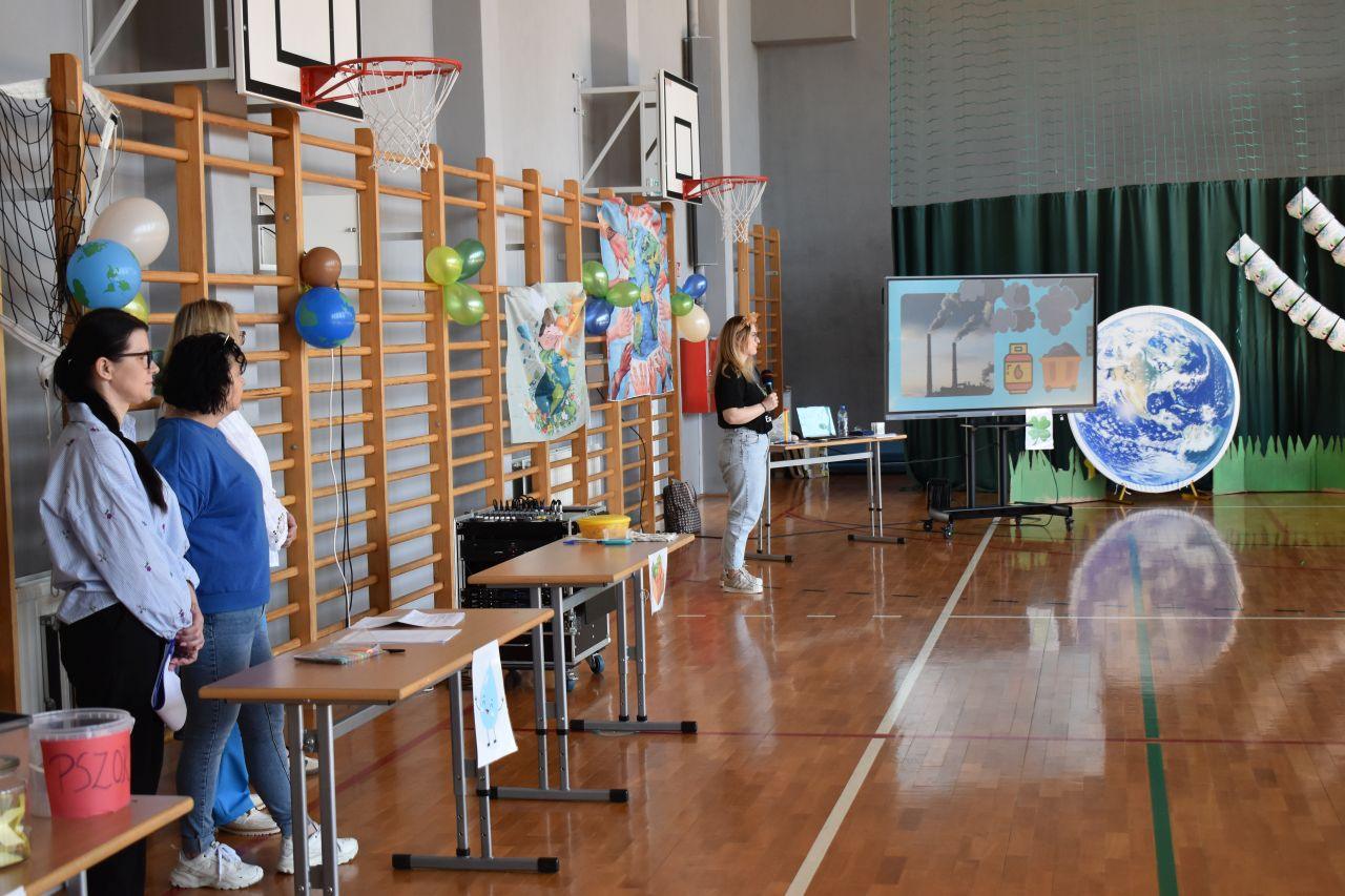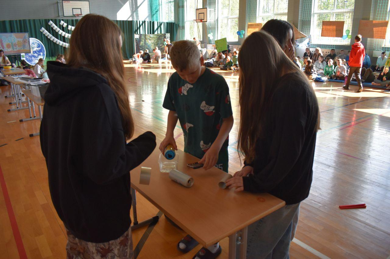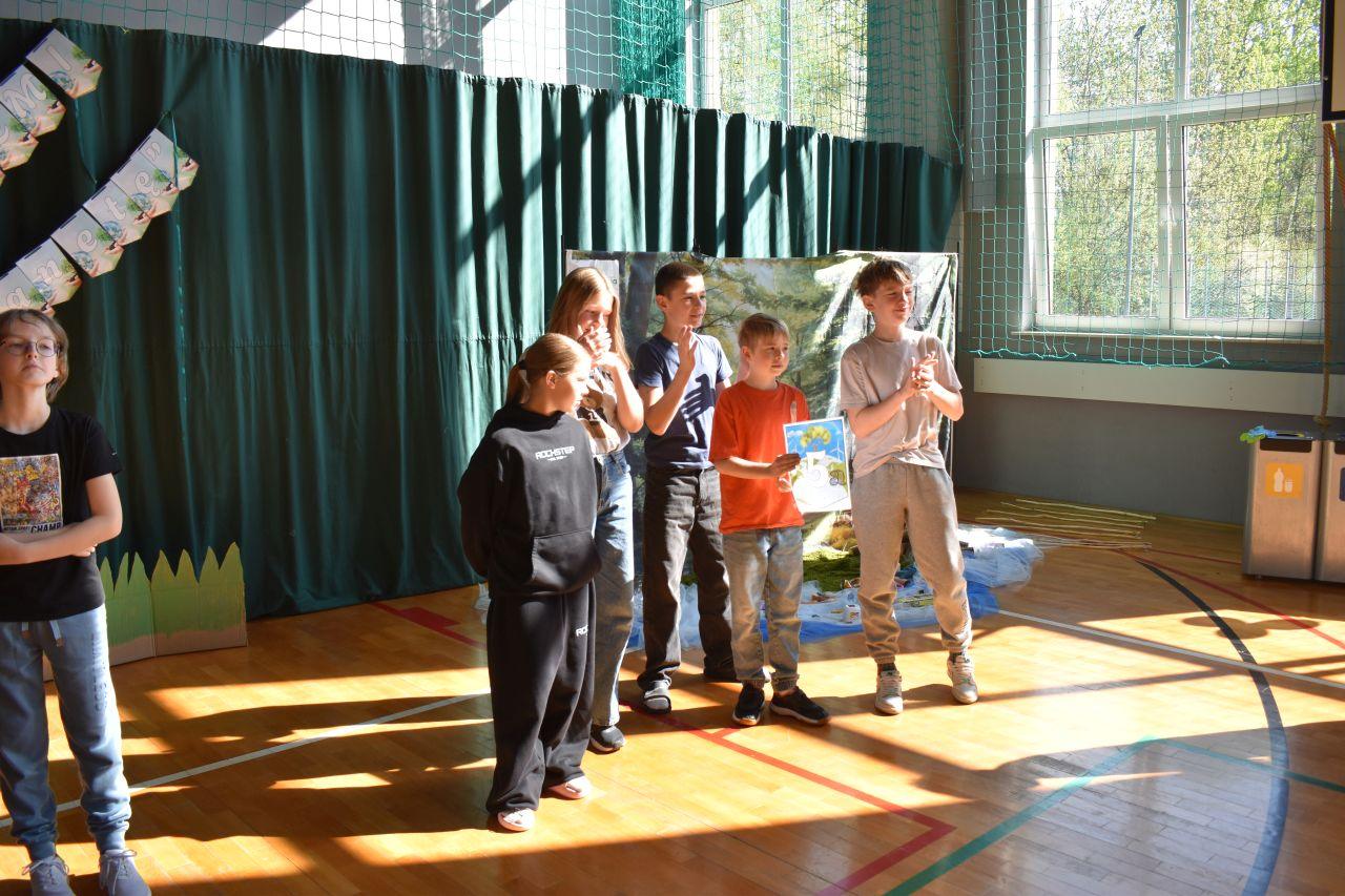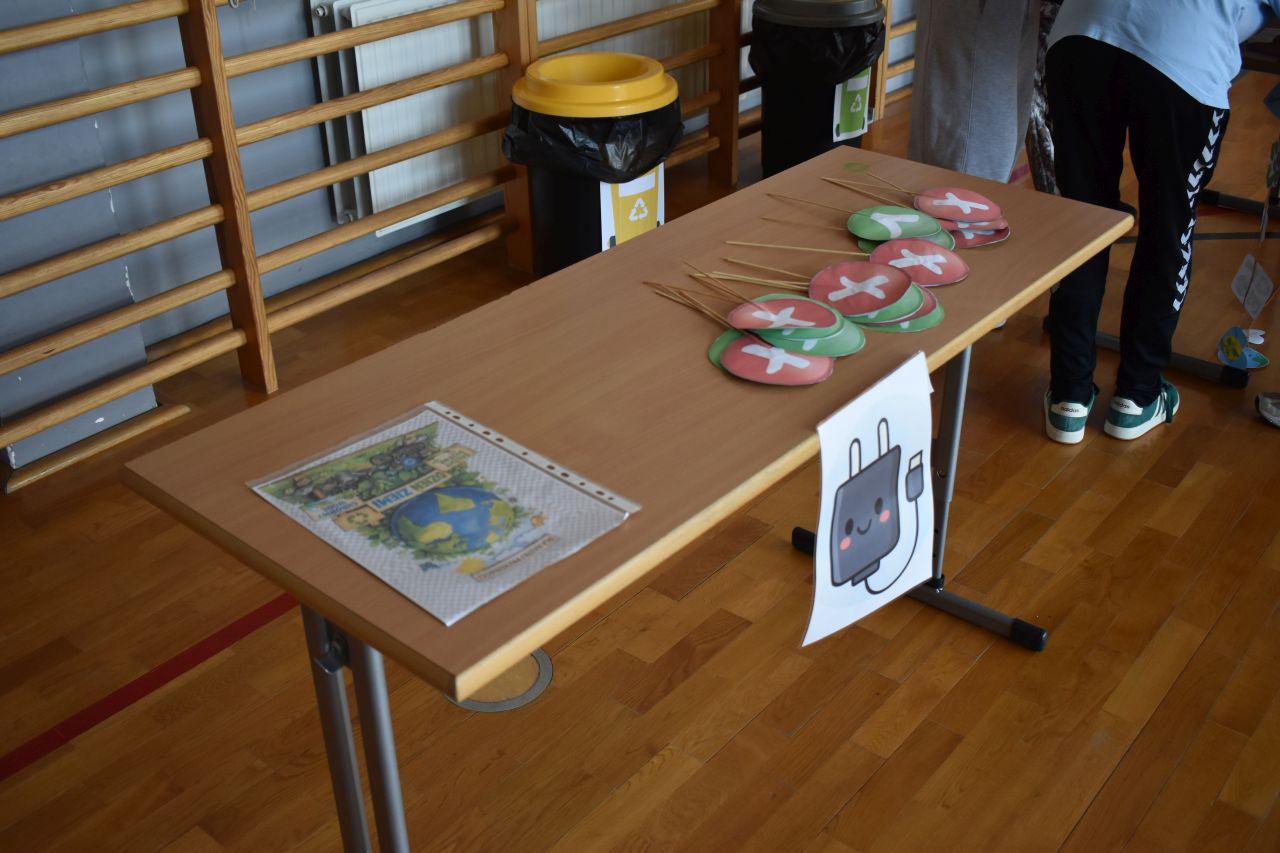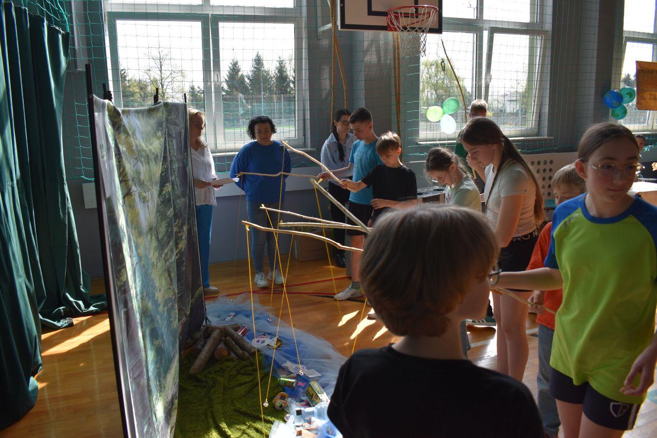 W czasie, gdy w sali gimnastycznej starsi uczniowie zmagali się z ekologicznymi konkurencjami, na górnym korytarzu klasy 1-3 miały okazję odwiedzić eko-stoiska, przygotowane specjalnie dla nich. Młodsi uczniowie także potwierdzili, że dbanie o planetę nie jest im obce. Doskonale radzili sobie z zadaniami, które ochoczo prezentowali im wolontariusze.