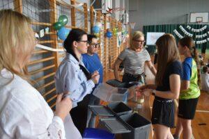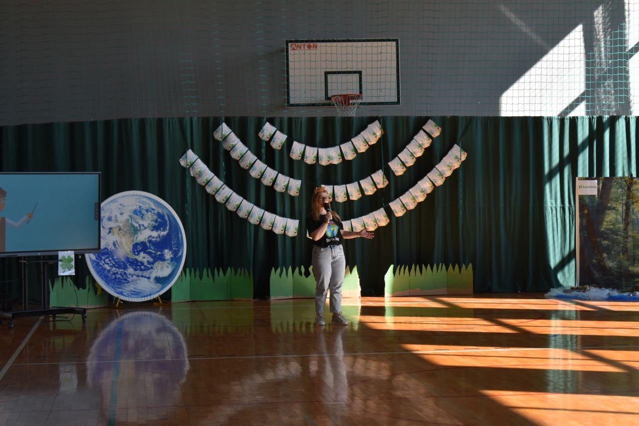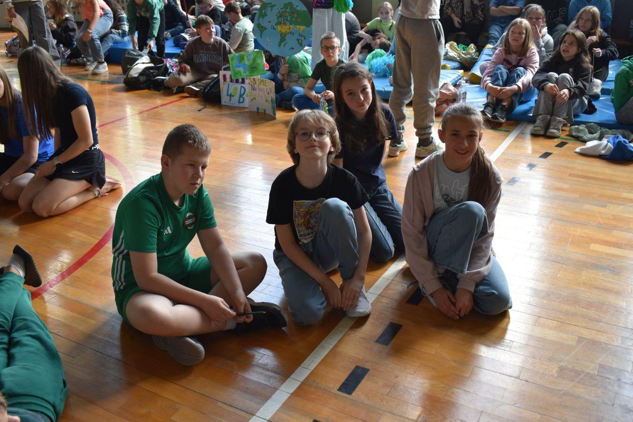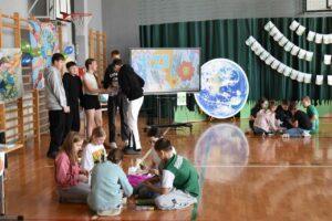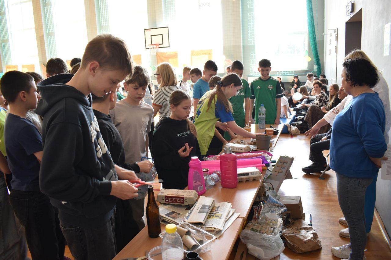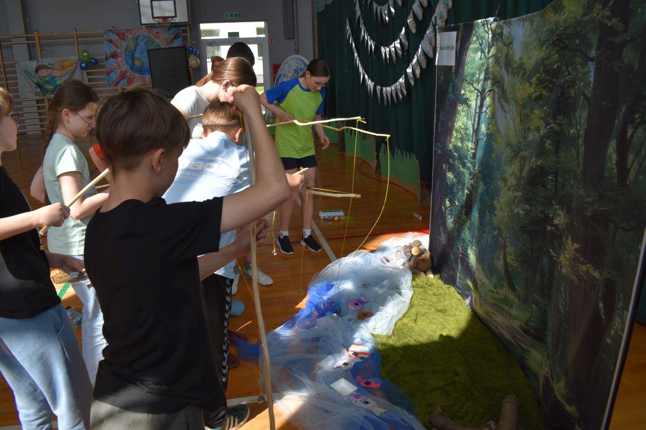 W czasie, gdy w sali gimnastycznej starsi uczniowie zmagali się z ekologicznymi konkurencjami, na górnym korytarzu klasy 1-3 miały okazję odwiedzić eko-stoiska, przygotowane specjalnie dla nich. Młodsi uczniowie także potwierdzili, że dbanie o planetę nie jest im obce. Doskonale radzili sobie z zadaniami, które ochoczo prezentowali im wolontariusze.