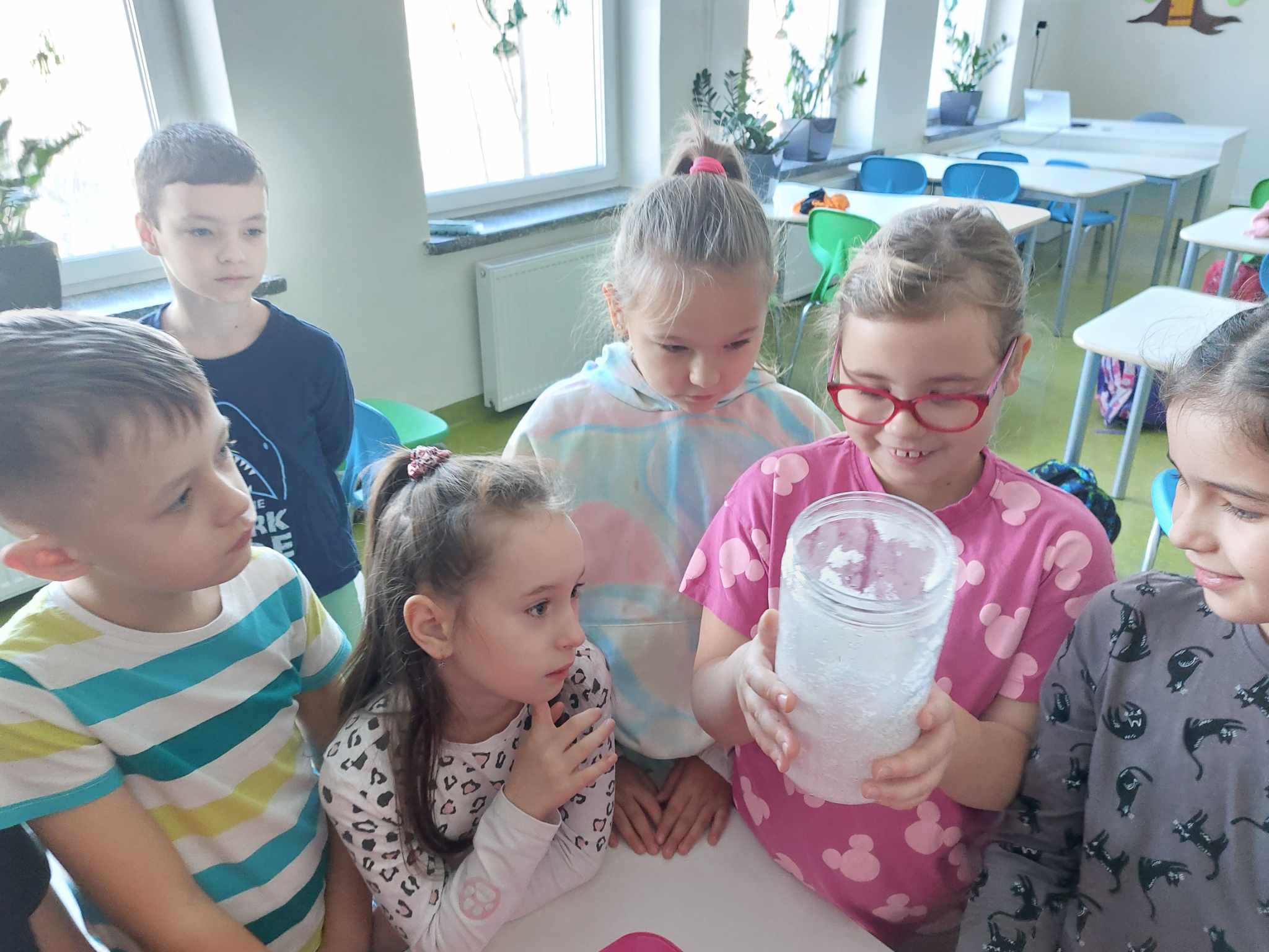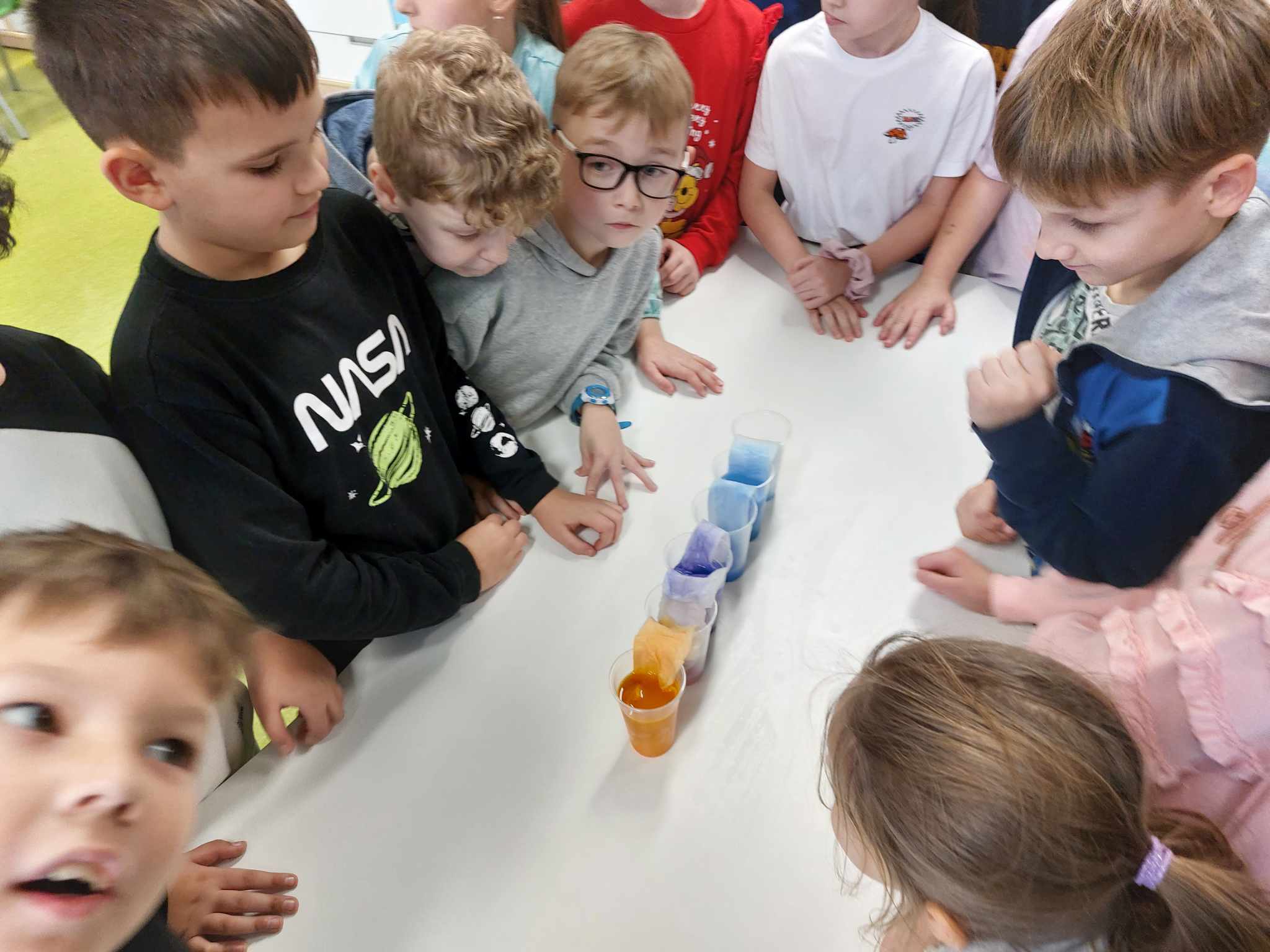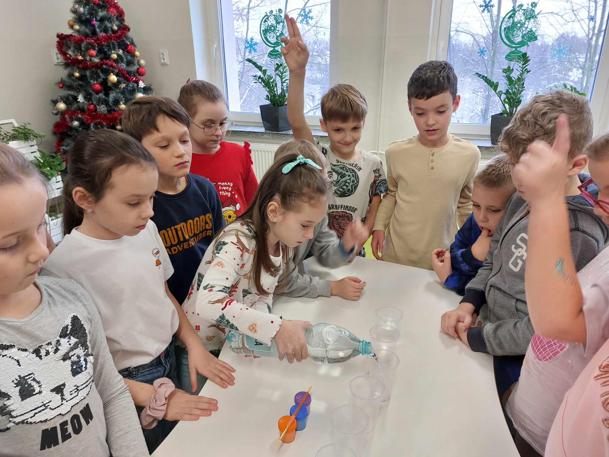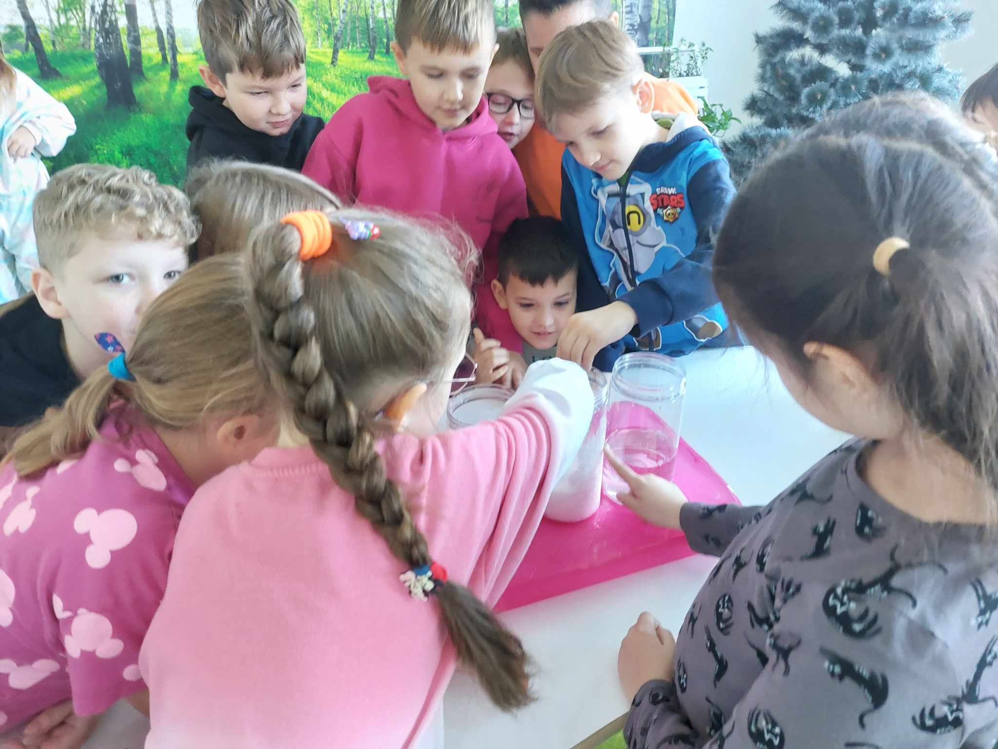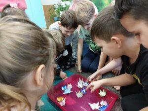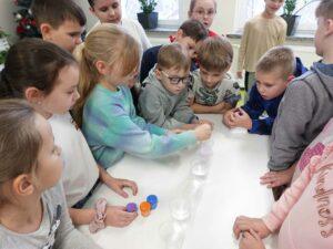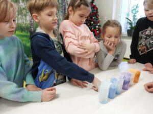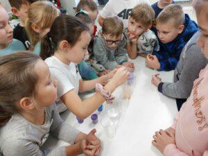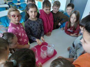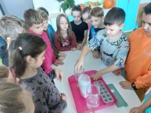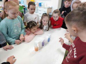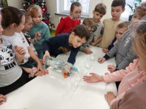 Właściwości wody to ekscytujący temat. Woda jest najbardziej rozpowszechnionym, najbardziej znanym i jednocześnie najbardziej zagadkowym płynem na Ziemi. W ramach innowacji pedagogicznej „Z przyrodą za pan brat” uczniowie z klasy 2A przeprowadzali doświadczenia z wykorzystaniem wody. Celem zajęć było zwrócenie uwagi na: ilość wody na świecie, dlaczego ważne jest, aby szanować wodę, a także, w jaki sposób możemy ją oszczędzać. Zajęcia rozpoczęły od obejrzenia i omówienia prezentacji, następnie uczniowie przeprowadzili kilka eksperymentów z wodą, dzięki którym dowiedzieli się, jakie właściwości ma woda, co w niej pływa, co tonie, co się rozpuszcza a co nie, jak zachowuje się wędrująca woda oraz papierowe gwiazdki ułożone na wodzie. Uczniowie mieli okazję przekonać się, że woda to niezwykły materiał do eksperymentów!