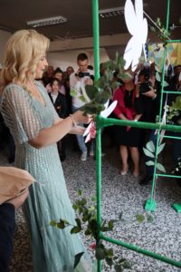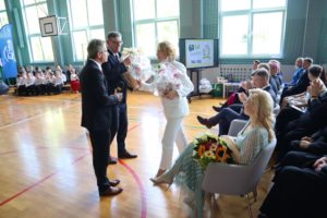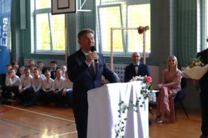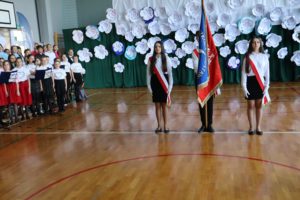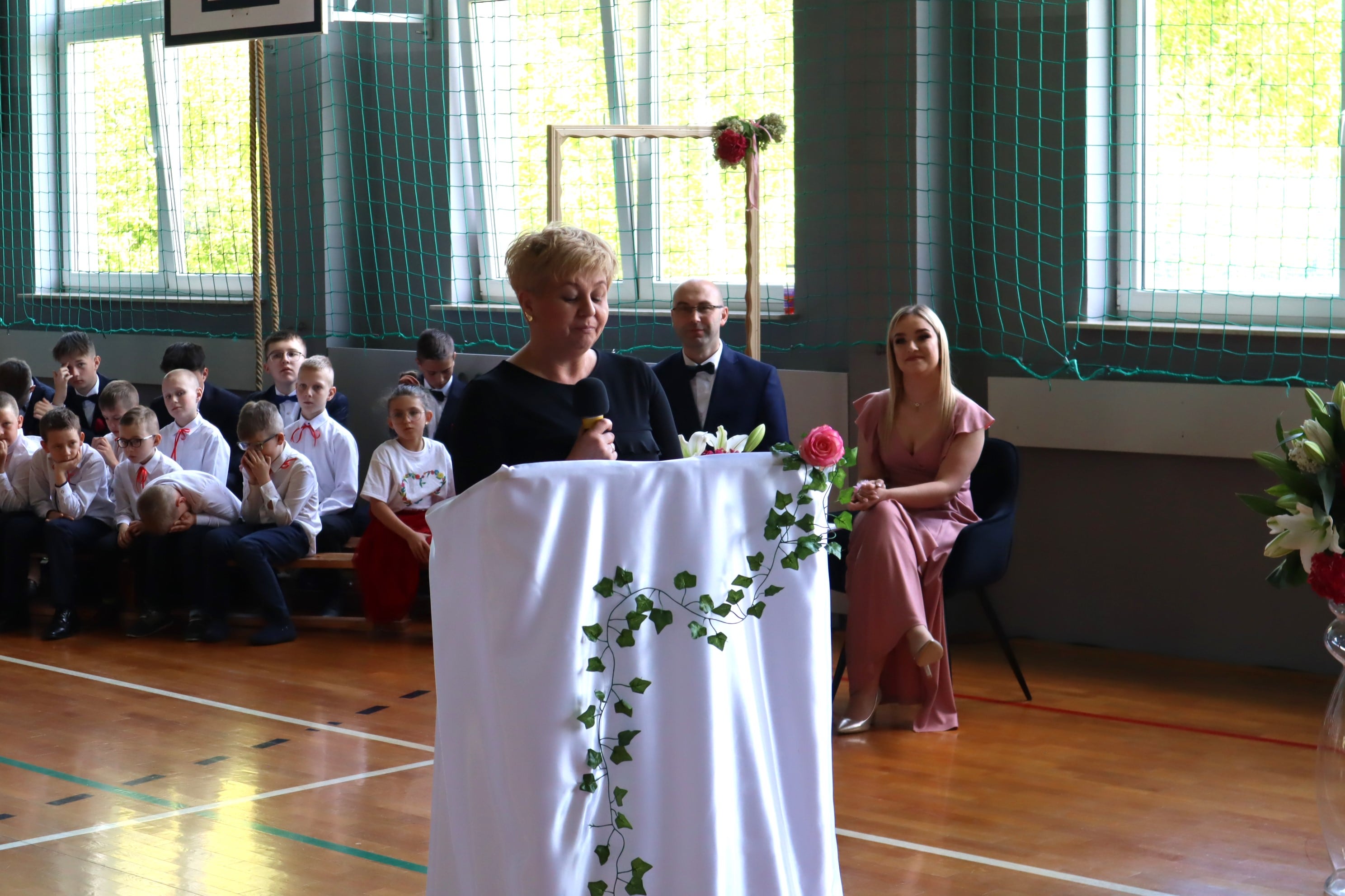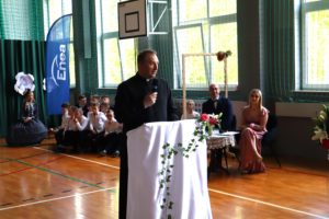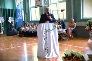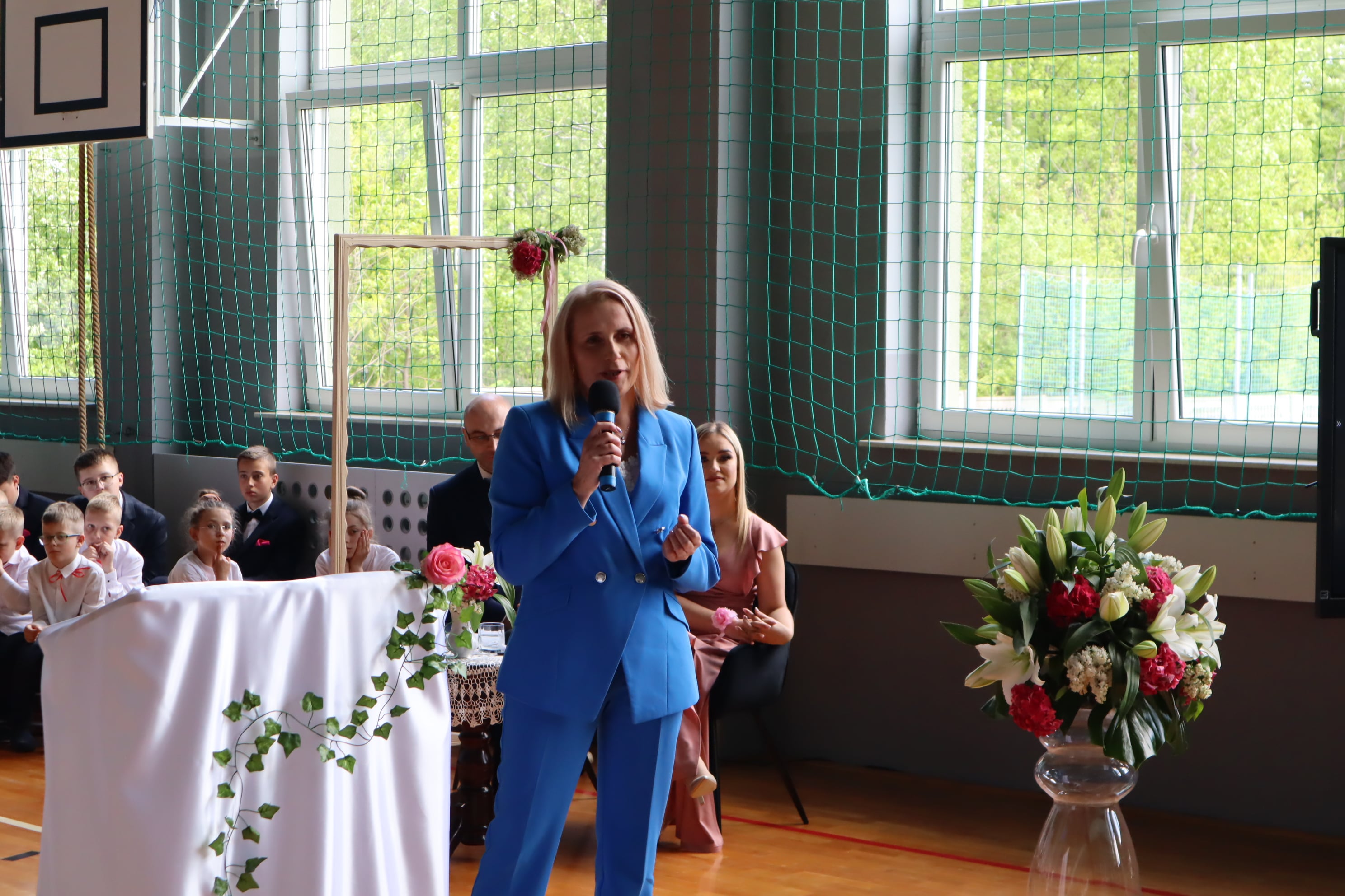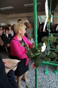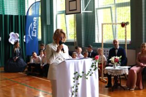 Po mszy przeszliśmy do szkoły. Jak przystało na gospodarza Jubilatki, wszystkich zebranych gości z wielką radością powitała Pani Dyrektor Małgorzata Trelka, która w swoim wystąpieniu zwróciła uwagę na wspaniałą tradycję szkoły i podkreśliła rangę jubileuszu. Nie zabrakło także jej osobistych wspomnień związanych ze szkołą, których przywołanie wywołało nutkę wzruszenia. Słowa Pani Dyrektor, pełne refleksji i zadumy, wprowadziły zebranych w klimat niecodziennej uroczystości.