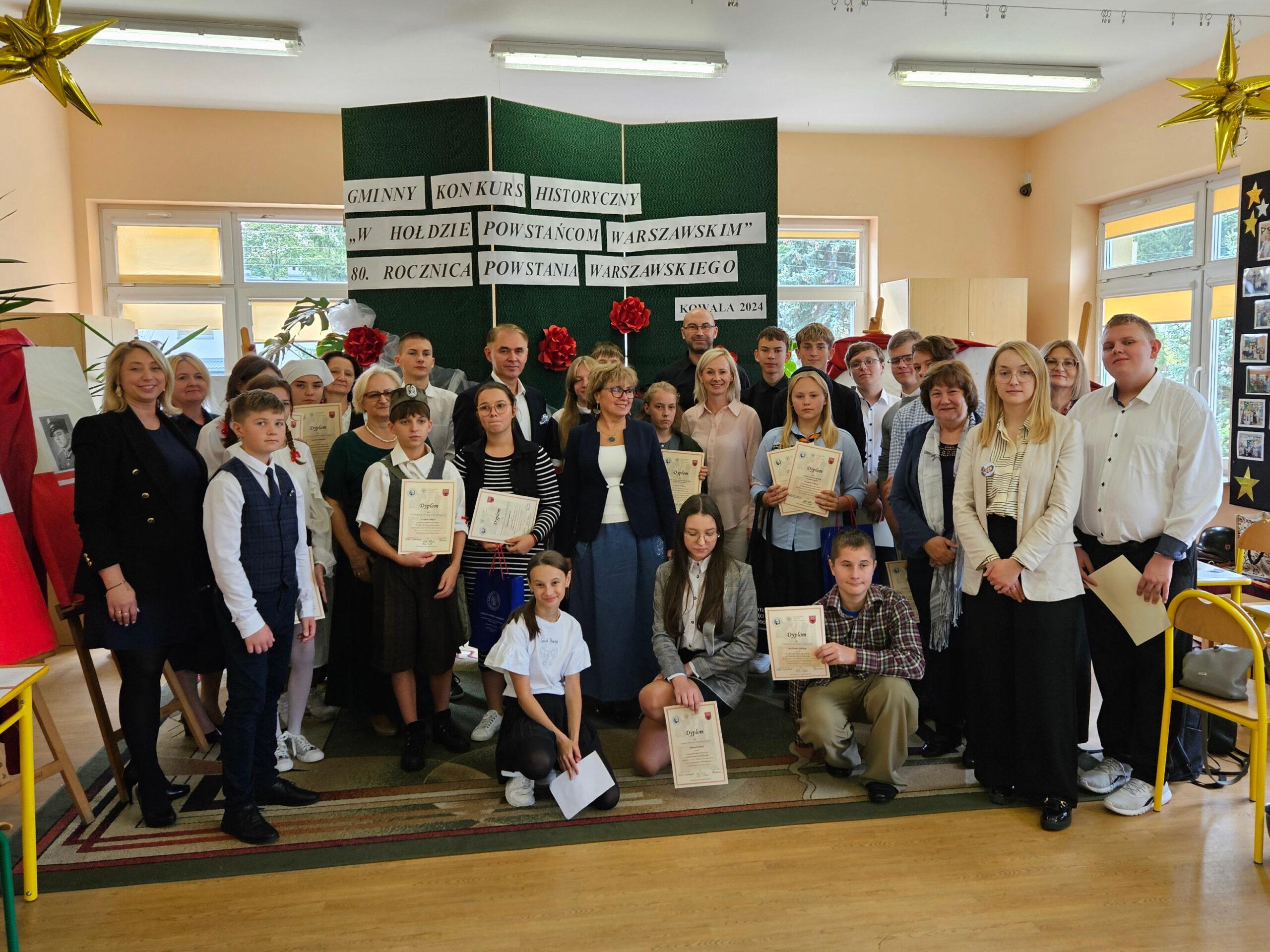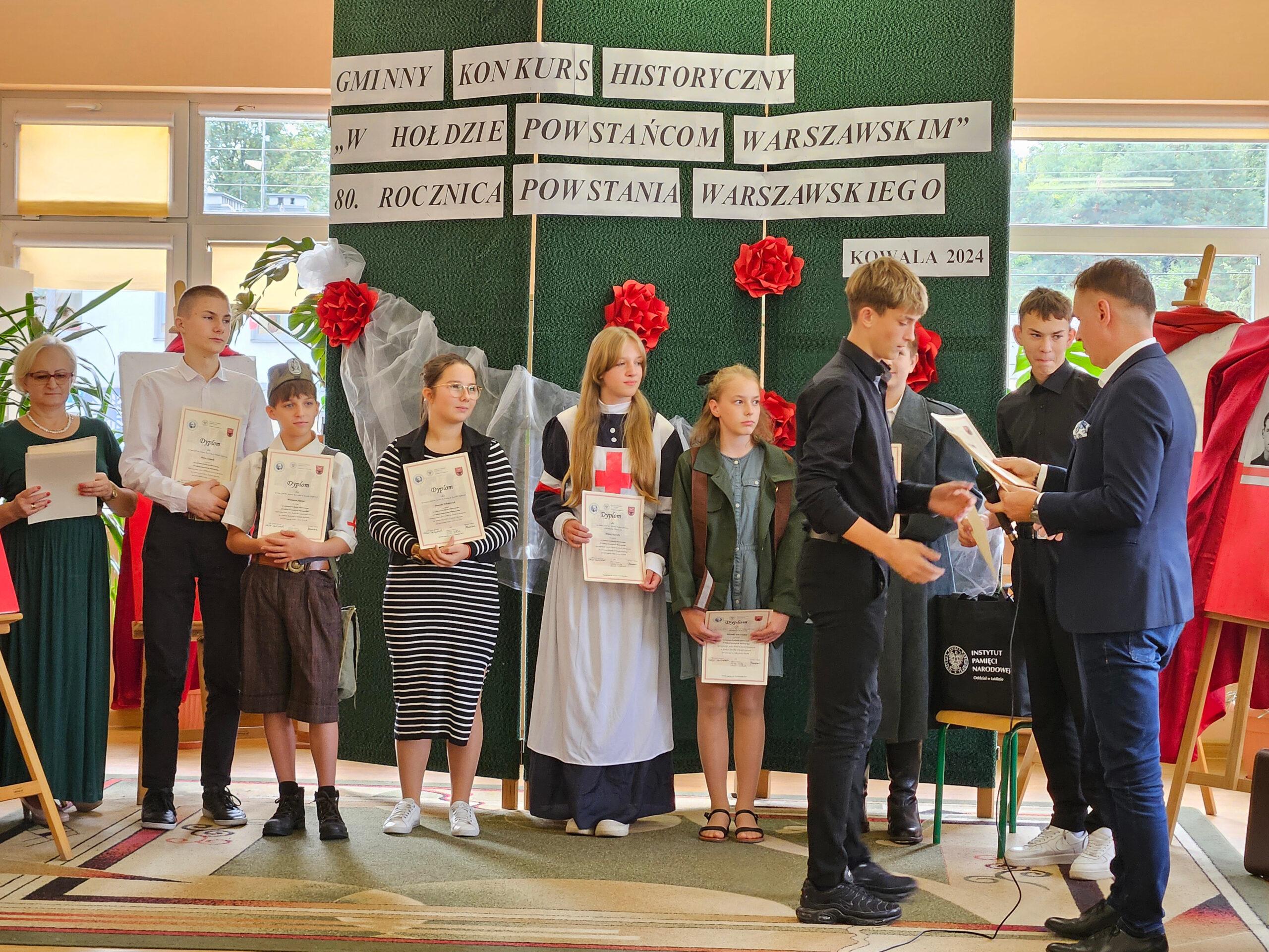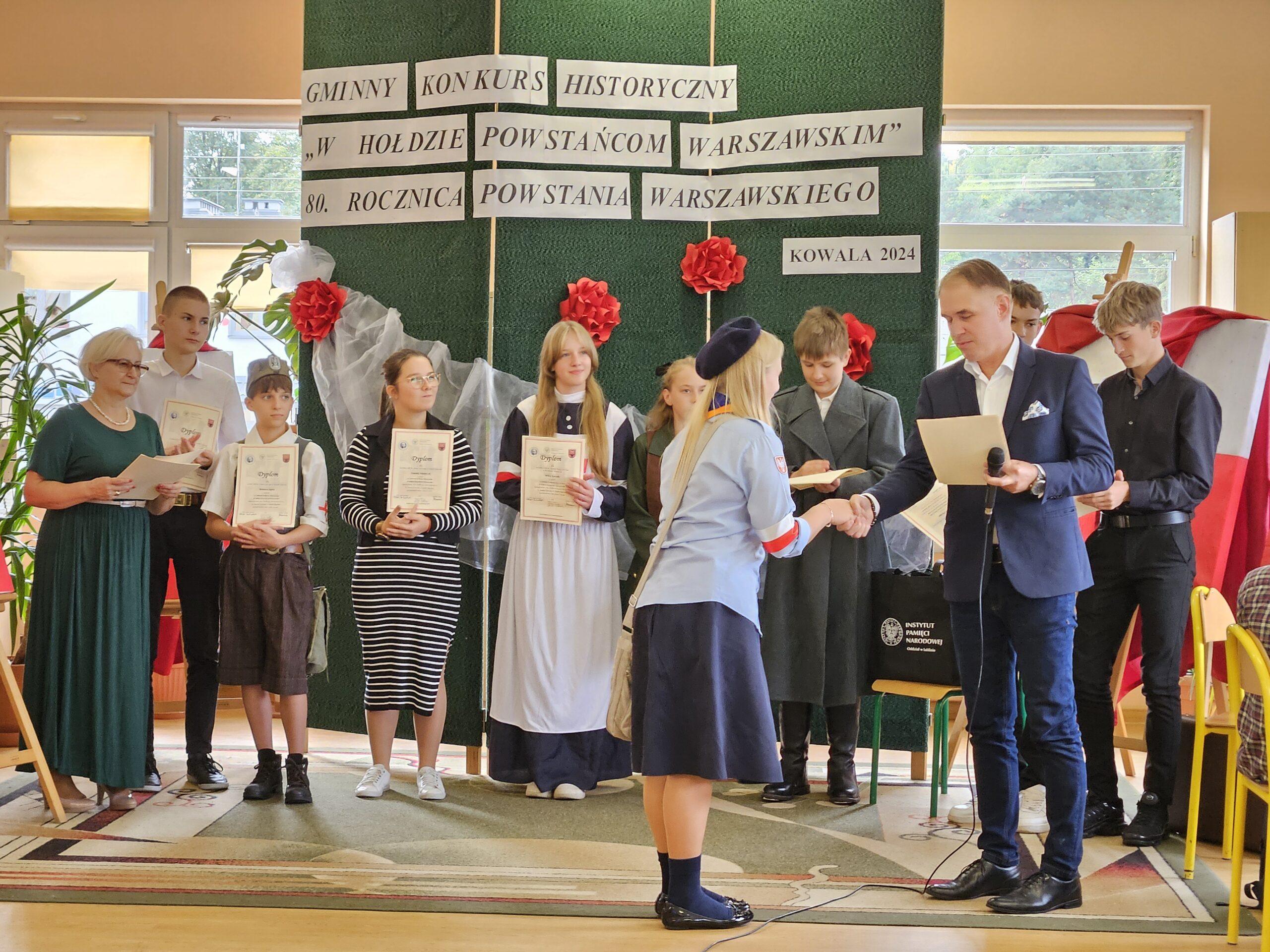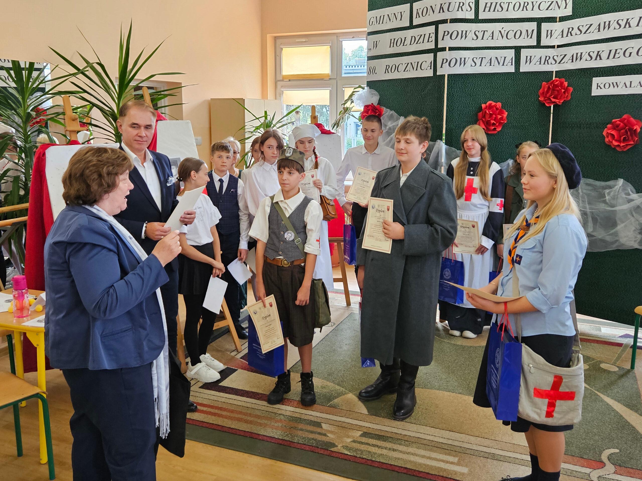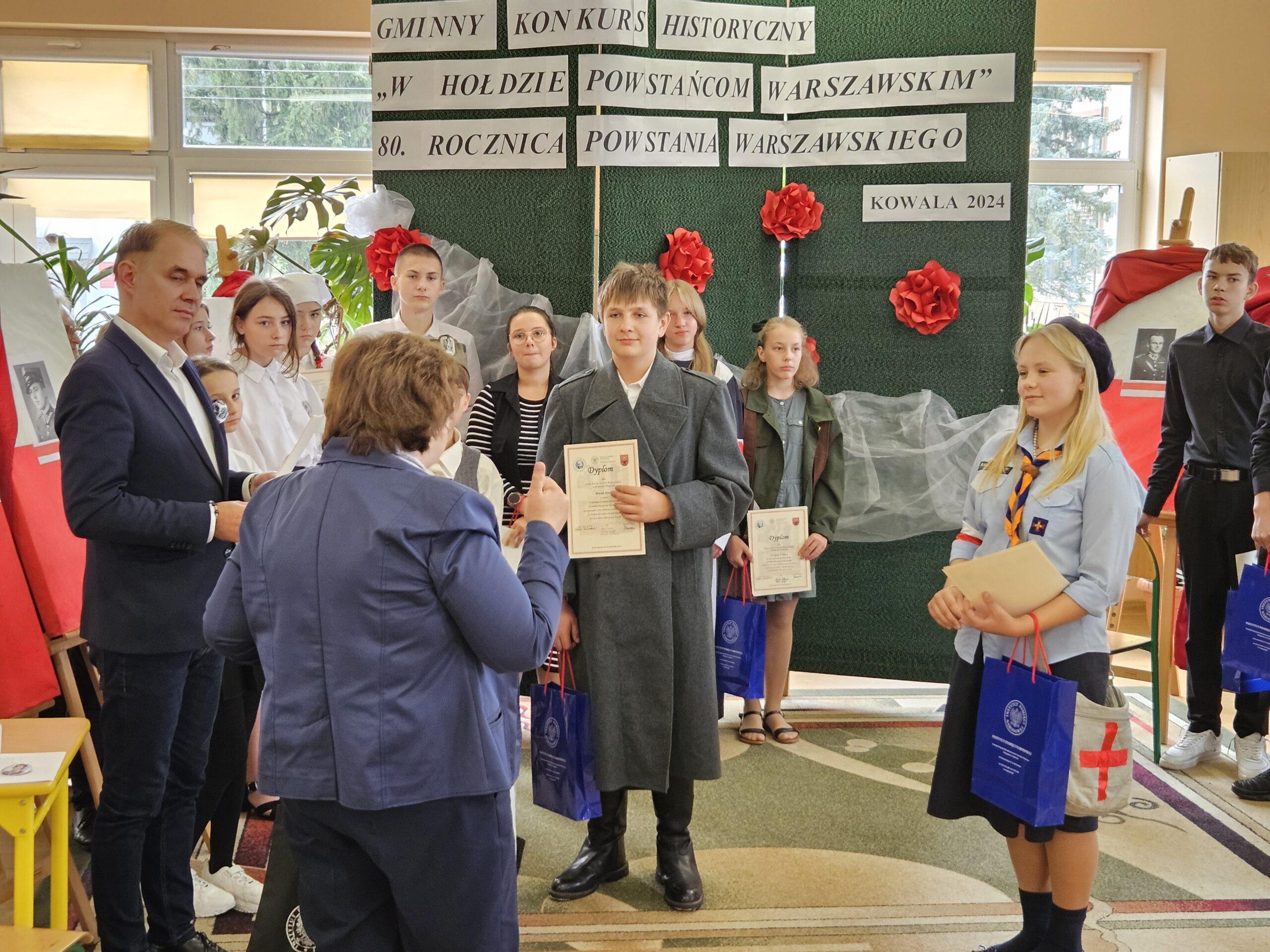 02 października w Publicznej Szkole Podstawowej w Kowali odbył się Gminny Konkurs Historyczny „W hołdzie Powstańcom Warszawskim” zorganizowany z okazji 80. rocznicy wybuchu Powstania Warszawskiego. Jego celem było, m. in. rozbudzanie zainteresowania młodego pokolenia walką Polaków o niepodległość podczas II wojny światowej.Naszą szkołę reprezentowali uczniowie z klasy 8a: Lena Jastrzębska, Adam Maciąg i Igor Szot, zajmując w zmaganiach drużynowych III miejsce. Nagrodę specjalną otrzymała Lena Jastrzębska. Jury doceniło jej umiejętności aktorskie podczas prezentacji monodramu opartego na wspomnieniach sanitariuszki Barbary Bobrownickiej – Fricze ps. Oleńka.