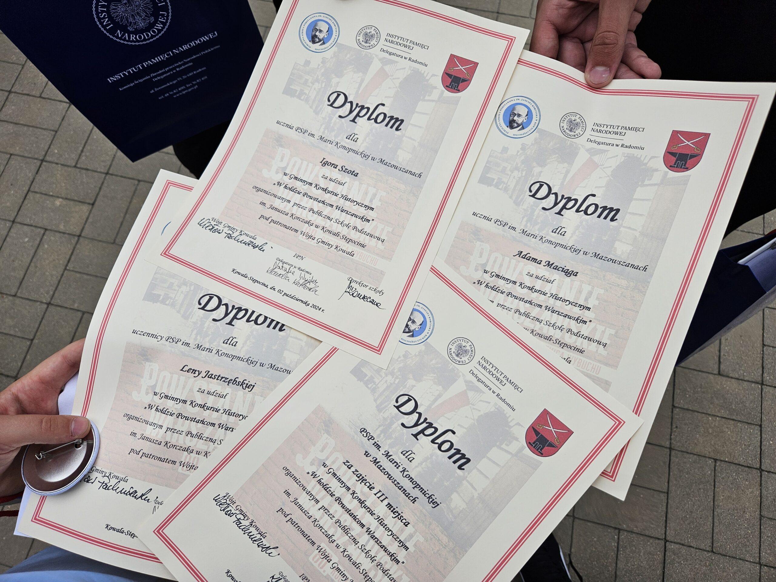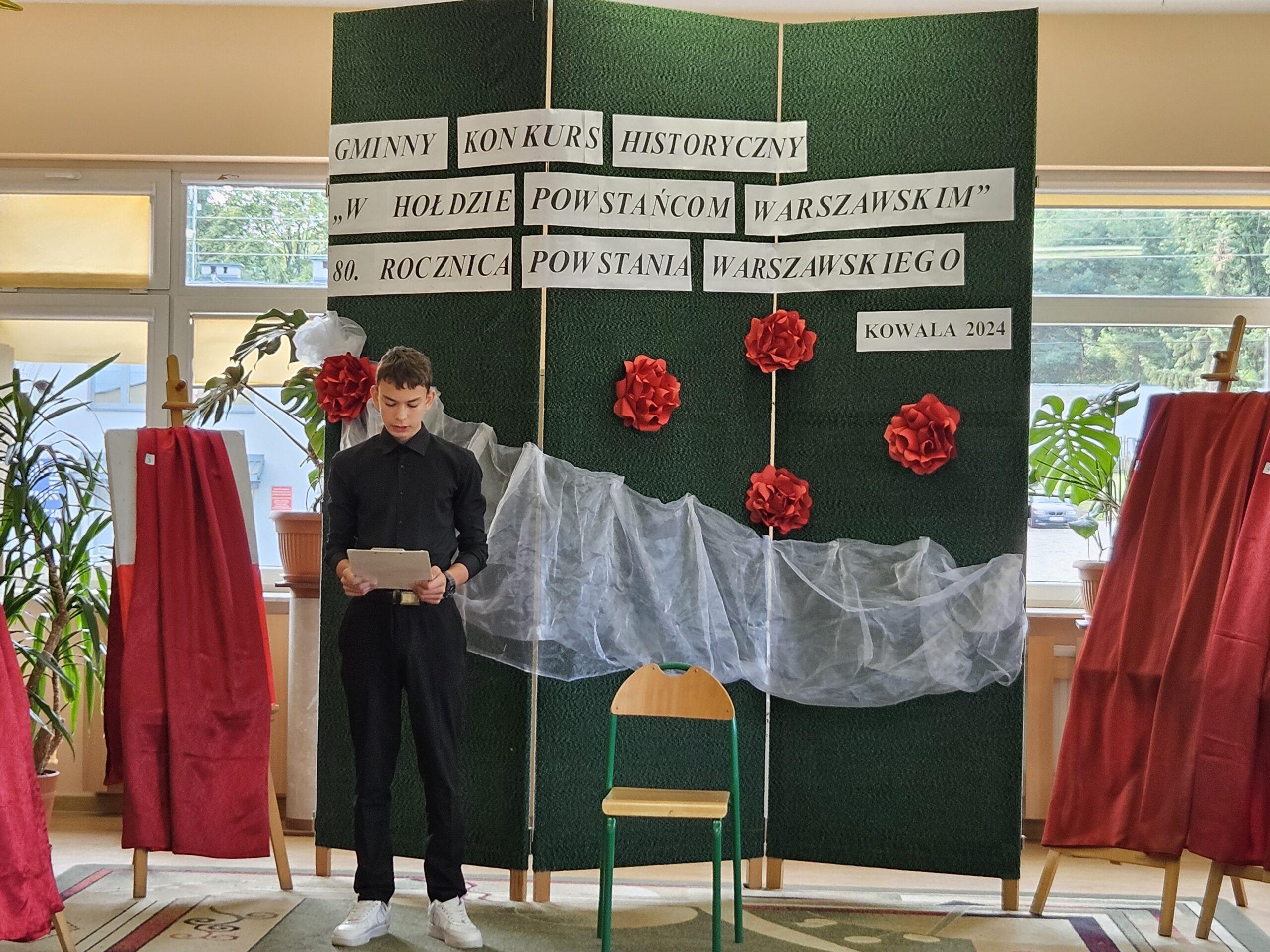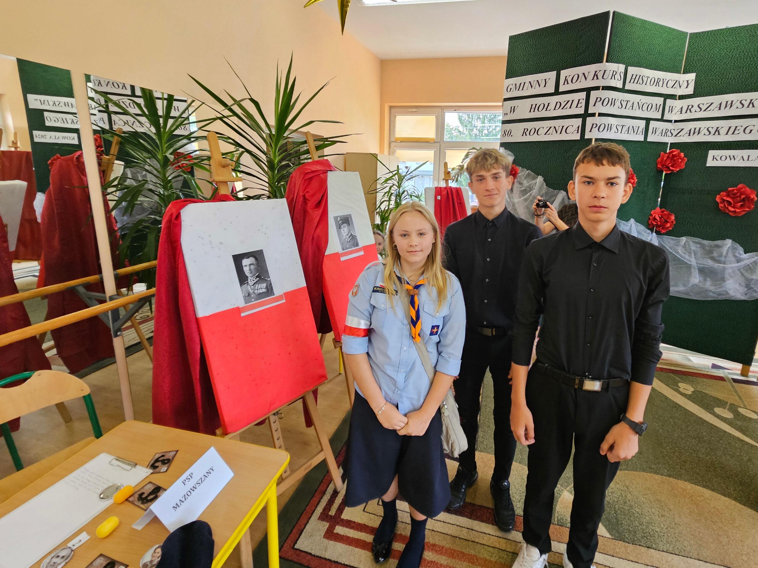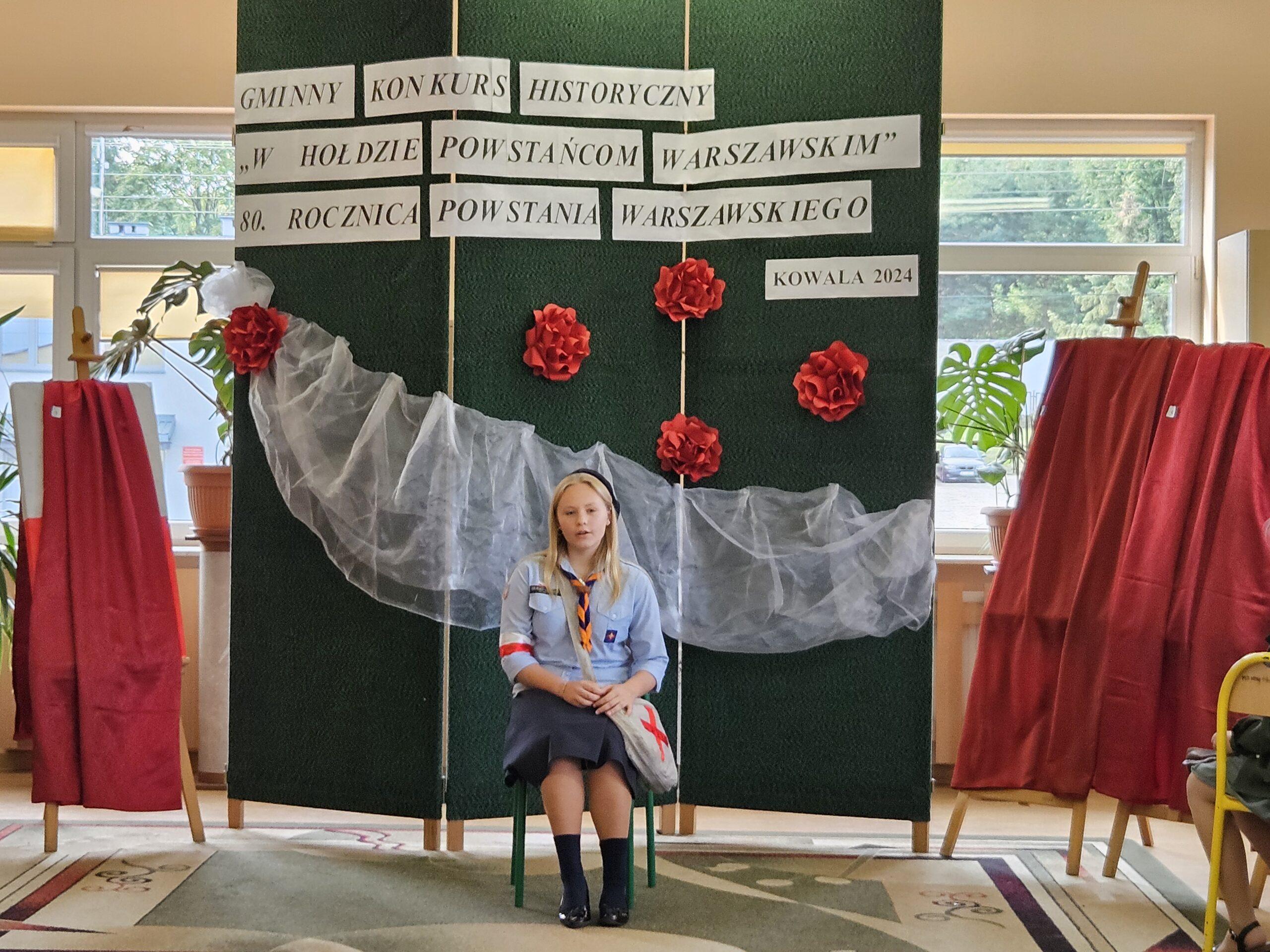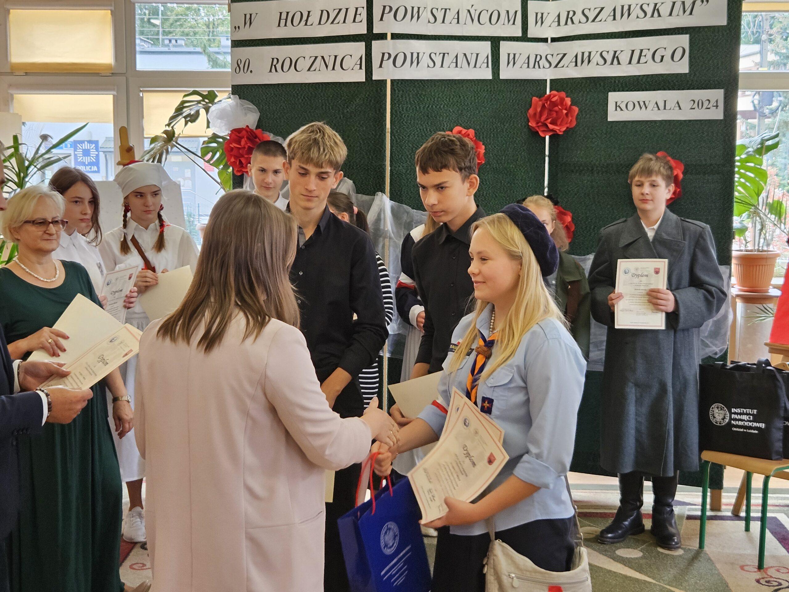 02 października w Publicznej Szkole Podstawowej w Kowali odbył się Gminny Konkurs Historyczny „W hołdzie Powstańcom Warszawskim” zorganizowany z okazji 80. rocznicy wybuchu Powstania Warszawskiego. Jego celem było, m. in. rozbudzanie zainteresowania młodego pokolenia walką Polaków o niepodległość podczas II wojny światowej.Naszą szkołę reprezentowali uczniowie z klasy 8a: Lena Jastrzębska, Adam Maciąg i Igor Szot, zajmując w zmaganiach drużynowych III miejsce. Nagrodę specjalną otrzymała Lena Jastrzębska. Jury doceniło jej umiejętności aktorskie podczas prezentacji monodramu opartego na wspomnieniach sanitariuszki Barbary Bobrownickiej – Fricze ps. Oleńka.