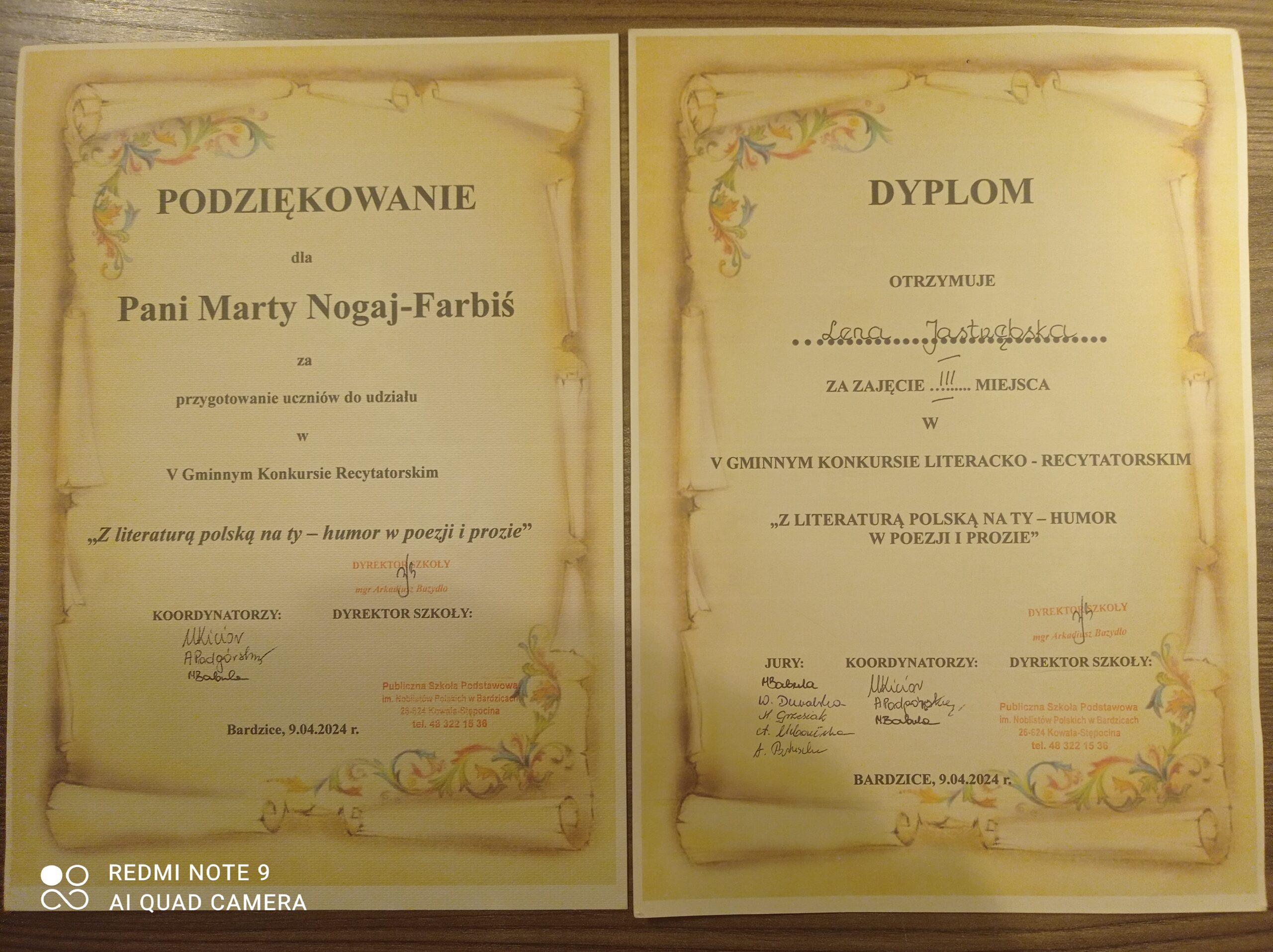 9 kwietnia w Publicznej Szkole Podstawowej im. Noblistów Polskich w Bardzicach odbył się V Gminny Konkurs Literacko-Recytatorski „Z literaturą na ty – humor w poezji i prozie”. Udział w wydarzeniu wzięło pięć szkół z terenu gminy Kowala. Naszą szkołę reprezentowały: Amelia Dujko kl. 6a w kategorii proza oraz Lena Jastrzębska kl. 7a w kategorii poezja. Uczennice wykazały się wspaniałą interpretacją przygotowanych tekstów, a Lena za występ zdobyła III miejsce. Dziękujemy Amelii i Lenie za zaangażowanie i pracę, jaką włożyły w przygotowania do konkursu. Gratulujemy i życzymy dalszych sukcesów!