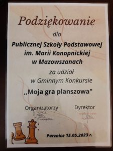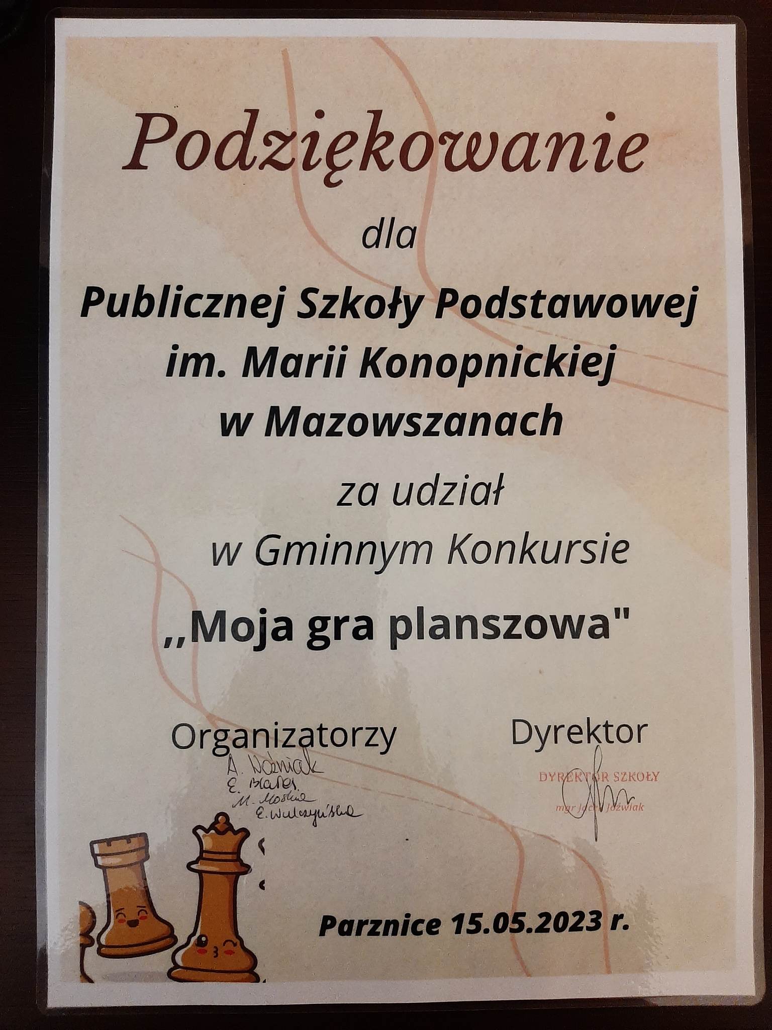 Miło nam poinformować, że Martyna Markowska i Michalina Podrygała zdobyły wyróżnienie w Gminnym Konkursie „Moja gra planszowa”. Konkurs przeznaczony był dla uczniów klas I-III. Uczniowie mieli za zadanie wykonać grę planszową, instrukcję, pionki, kostki. Uroczyste wręczenie nagród i dyplomów odbyło się w PSP w Parznicach. Serdecznie gratulujemy!