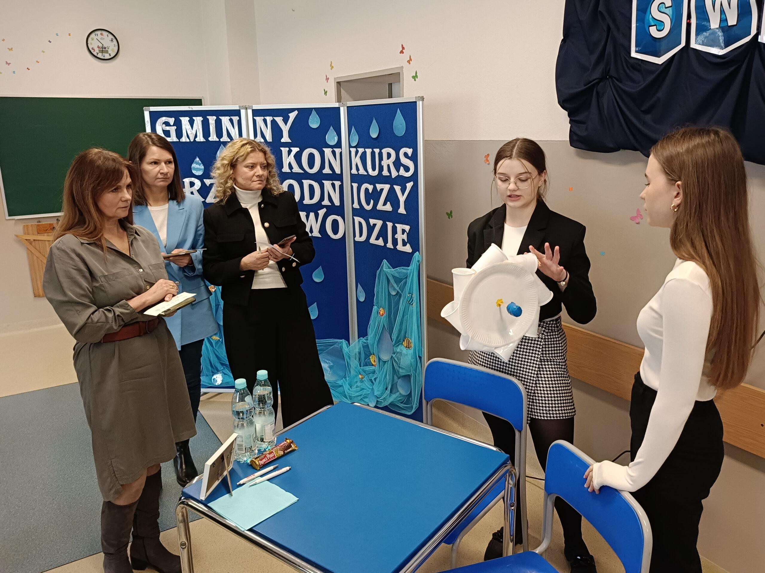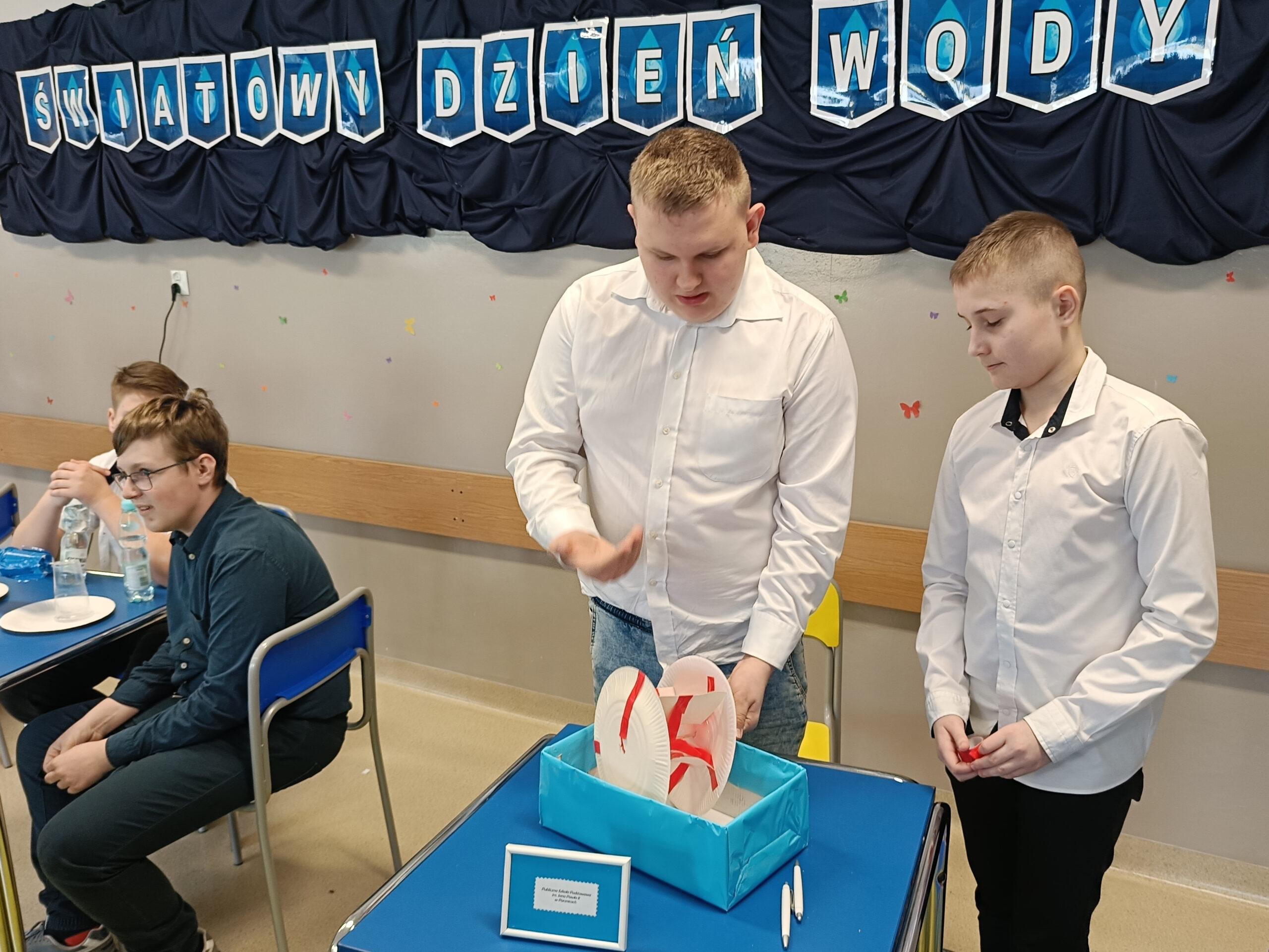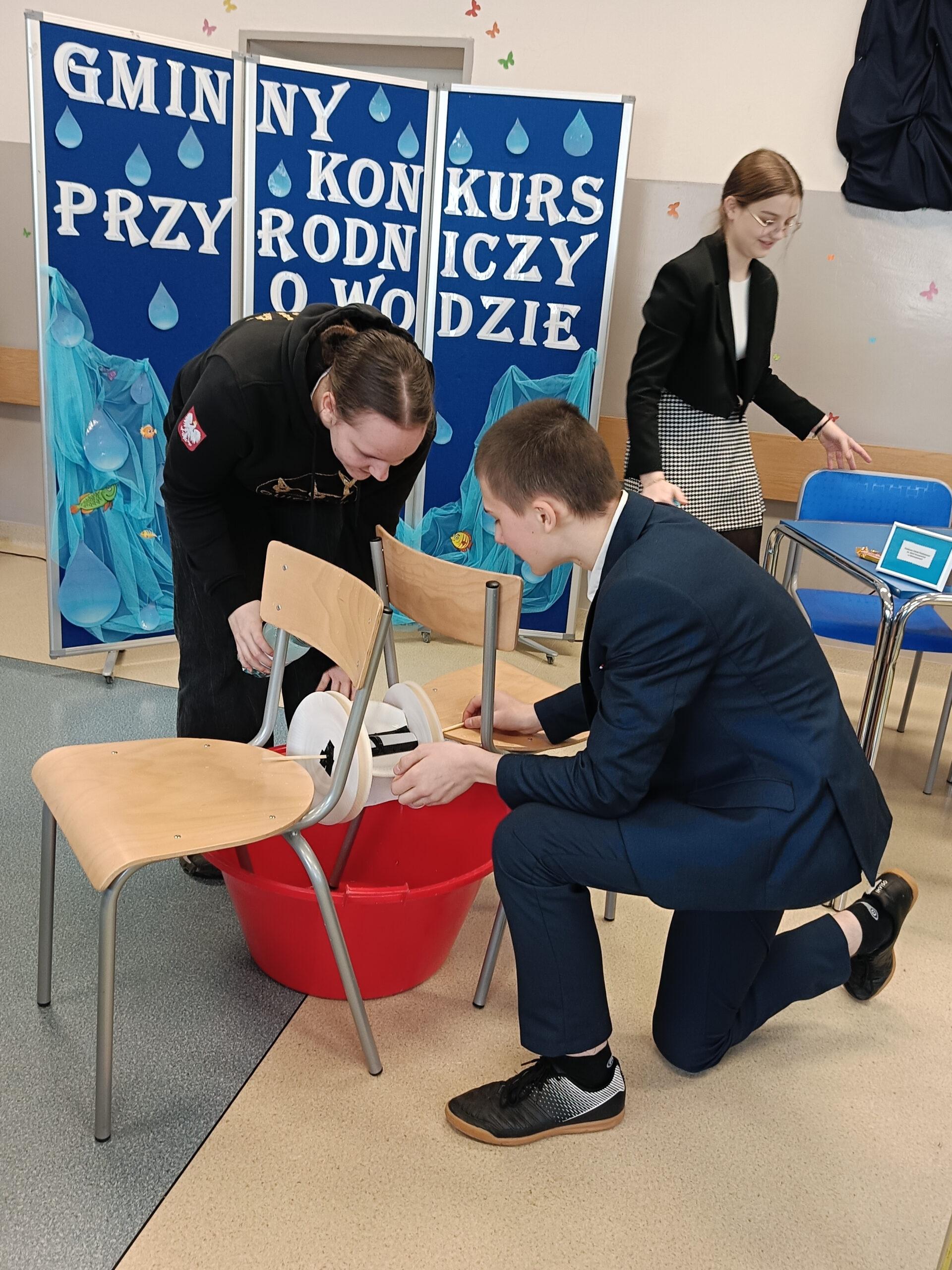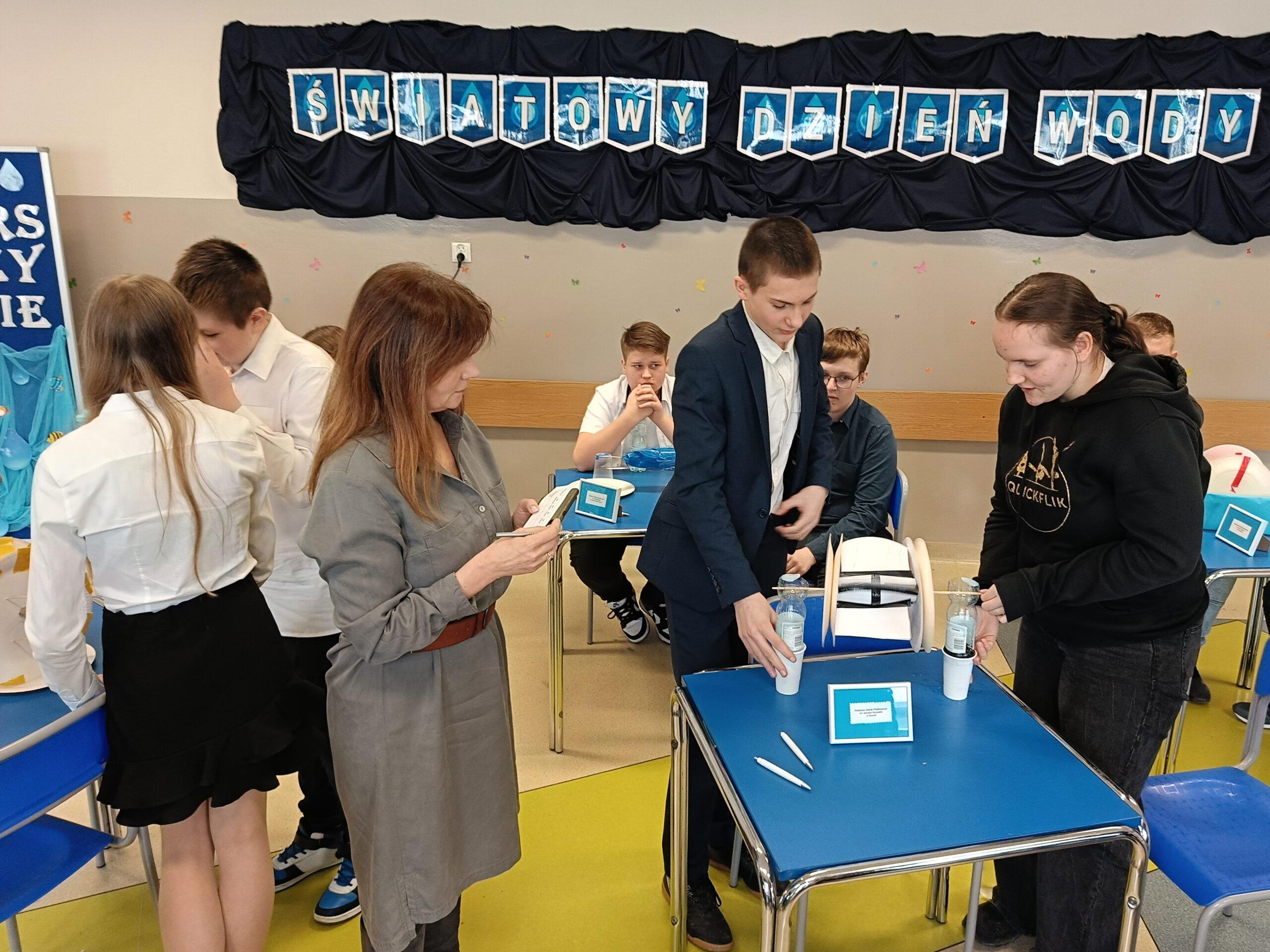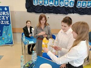 Obchodząc w naszej szkole Dzień Wody, chcemy popularyzować wiedzę o tym, jak wielką rolę odgrywa woda, że trzeba ją szanować i jak wielkie zagrożenie niesie ze sobą spadek jej zasobów. Już po raz trzeci z tej okazji zaprosiliśmy wszystkie szkoły z naszej gminy do udziału w konkursie przyrodniczym o wodzie pod hasłem Woda źródłem życia. W zmaganiach konkursowych uczestniczyło pięć szkół. Po oficjalnym otwarciu spotkania przez panią dyrektor Małgorzatę Trelkę uczniowie sprawdzali swoją wiedzę, rozwiązując w dwuosobowych zespołach Wodny Quiz. ,,Zamień Energię Wody na Pracę i Zbuduj Koło Wodne! – to tytuł kolejnego zadania, jakie postawiono przed uczestnikami tegorocznej III edycji konkursu. Przed przystąpieniem do pracy uczniowie obejrzeli film na temat odnawialnych źródeł energii, m.in. energii wody oraz prezentację o pracy koła wodnego. Następnie z dowolnie wybranych, przygotowanych przez organizatora materiałów, reprezentanci szkół mieli skonstruować model koła wodnego. Oceniane były: kreatywność i pomysłowość, skuteczność działania, estetyka, sposób wykonania i prezentacji. Zadania konstrukcyjne okazały się wyzwaniem, ale jak co roku mogliśmy podziwiać fantazję i kreatywność małych inżynierów. Praca w zespole ułatwiała działanie, szczególnie, że czasu nie było zbyt dużo, co mobilizowało do skutecznej pracy. Wyobraźnia i pomysłowość pozwoliły zbudować całkiem sprawnie działające koła wodne. Zadanie, by ujarzmić energię wody, zostało wykonane. Po umysłowych szaradach wszyscy zasłużyli na słodki poczęstunek. Konkurs przebiegał w bardzo miłej i radosnej atmosferze, wpisując się już na stałe do kalendarza uroczystości szkolnych.
