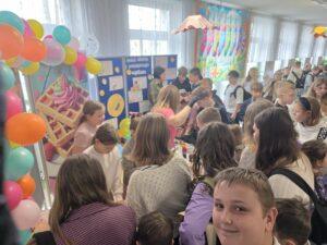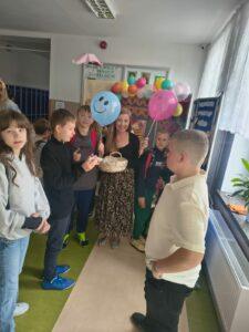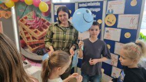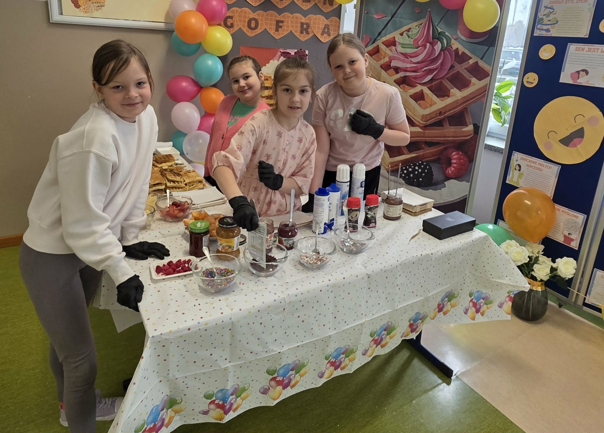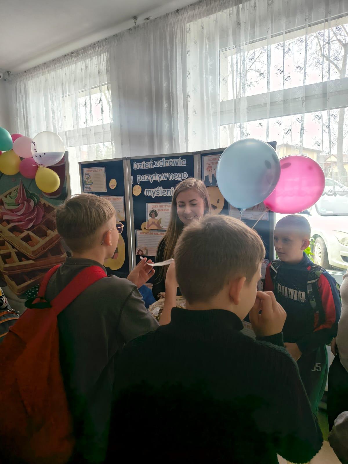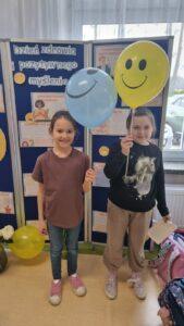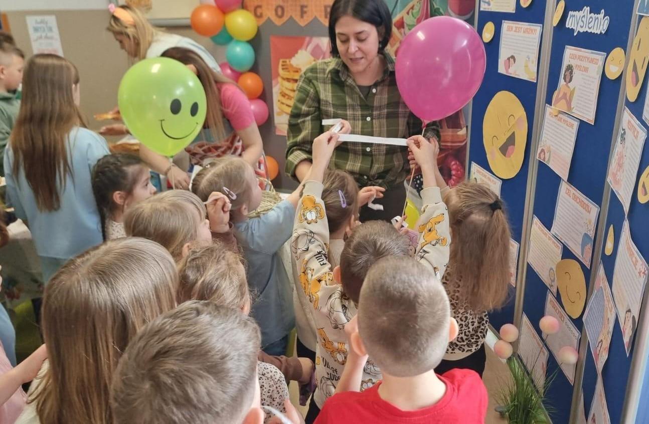 Uczniowie mogli skosztować pysznych, świeżo przygotowanych gofrów, które umilały dzień i dodawały energii. Dużym powodzeniem cieszyło się również losowanie afirmacji – każde dziecko mogło wybrać dla siebie pozytywne hasło lub myśl na dobry dzień, które inspirowały i motywowały. Na uczestników czekała także miła niespodzianka – szczęśliwcy otrzymywali kolorowe, uśmiechnięte balony, które wywoływały radość i uśmiech na twarzach dzieci. Dodatkowo na terenie całej szkoły rozwieszono pozytywne hasła, przypominające o sile dobrego słowa, życzliwości i wierze w siebie.
