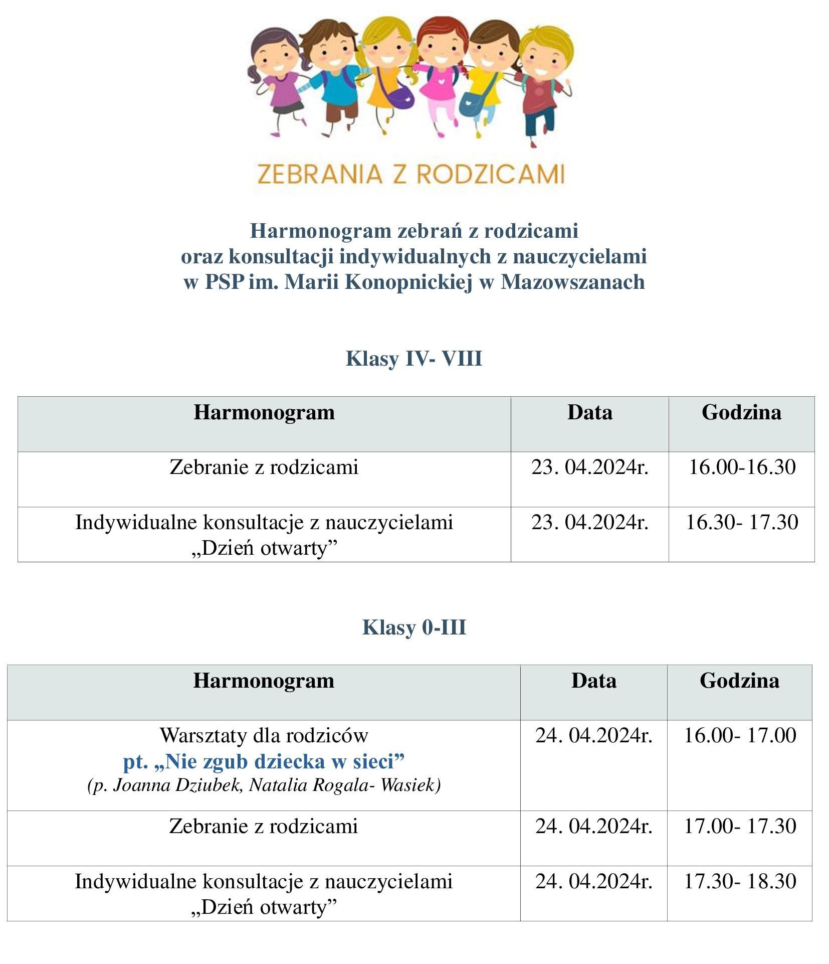 Harmonogram zebrań z rodzicami oraz konsultacji indywidualnych z nauczycielami w PSP im. Marii Konopnickiej w Mazowszanach.