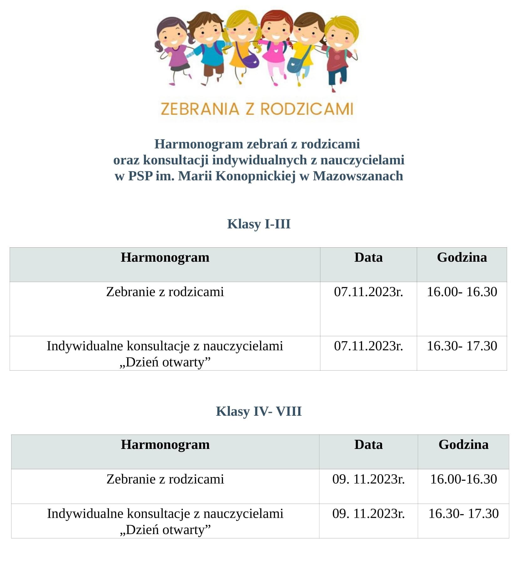 Harmonogram zebrań z rodzicami oraz konsultacji indywidualnych z nauczycielami w PSP im. Marii Konopnickiej w Mazowszanach.