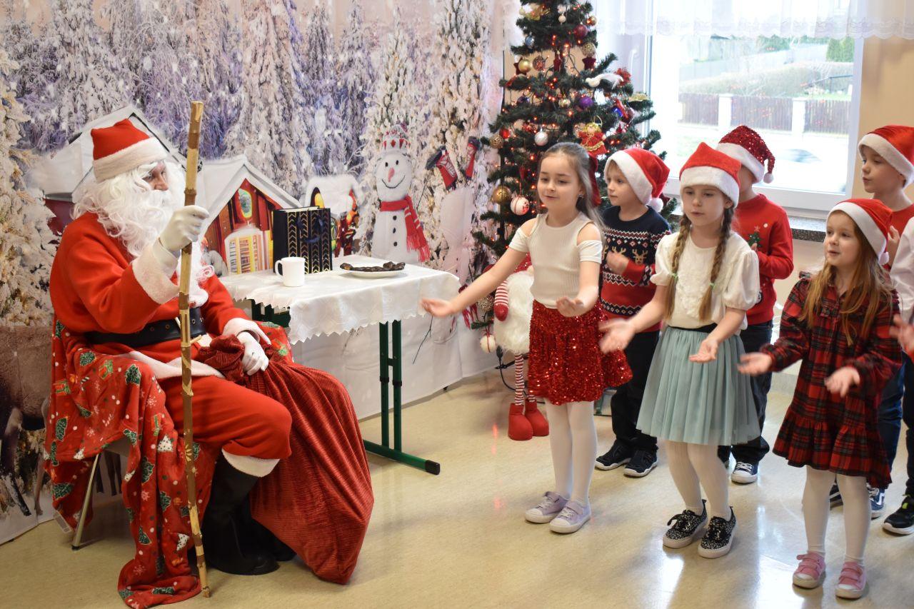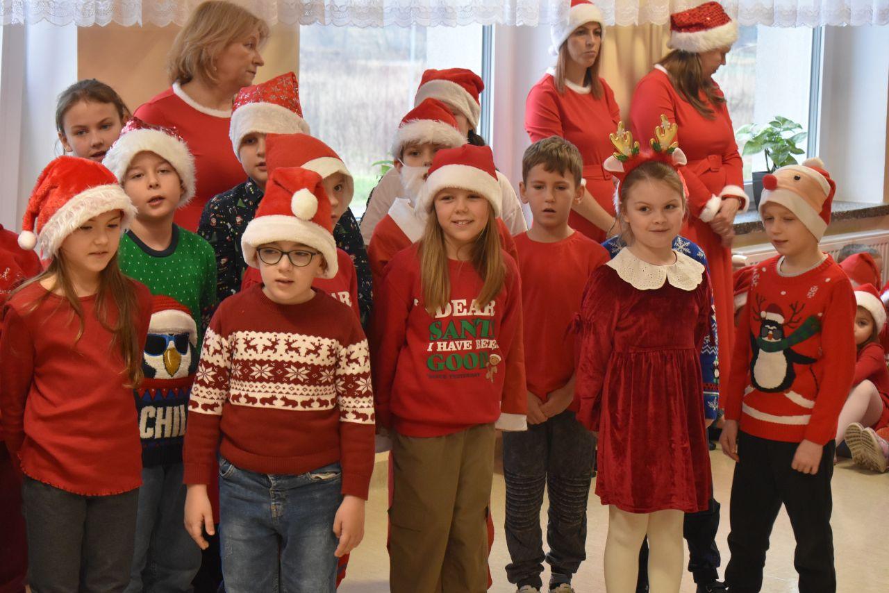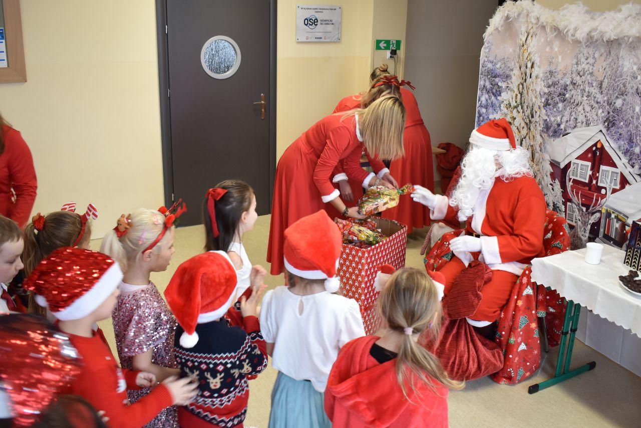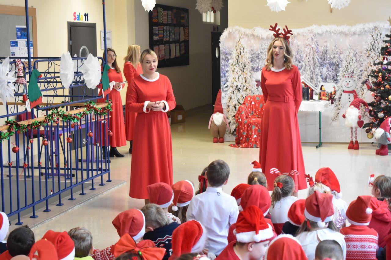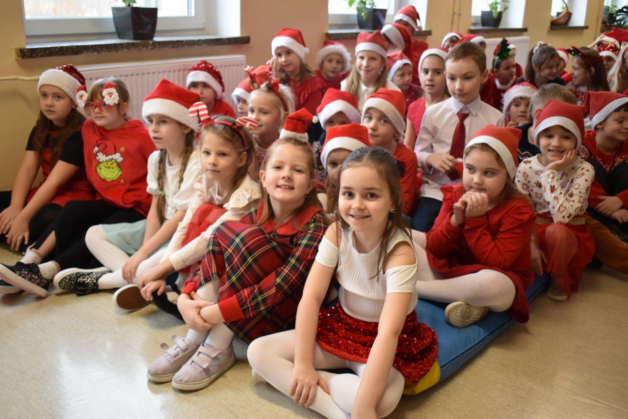 Spotkanie zostało podzielone na dwie tury: poranną i popołudniową, żeby każdy mógł spokojnie zaprezentować Mikołajowi to, co przygotował. A było co oglądać! Dzieci recytowały specjalnie ułożone wierszyki, śpiewały świąteczne piosenki, a niektóre klasy pokazały nawet wesołe tańce, które od razu wprawiły wszystkich w mikołajkowy nastrój.