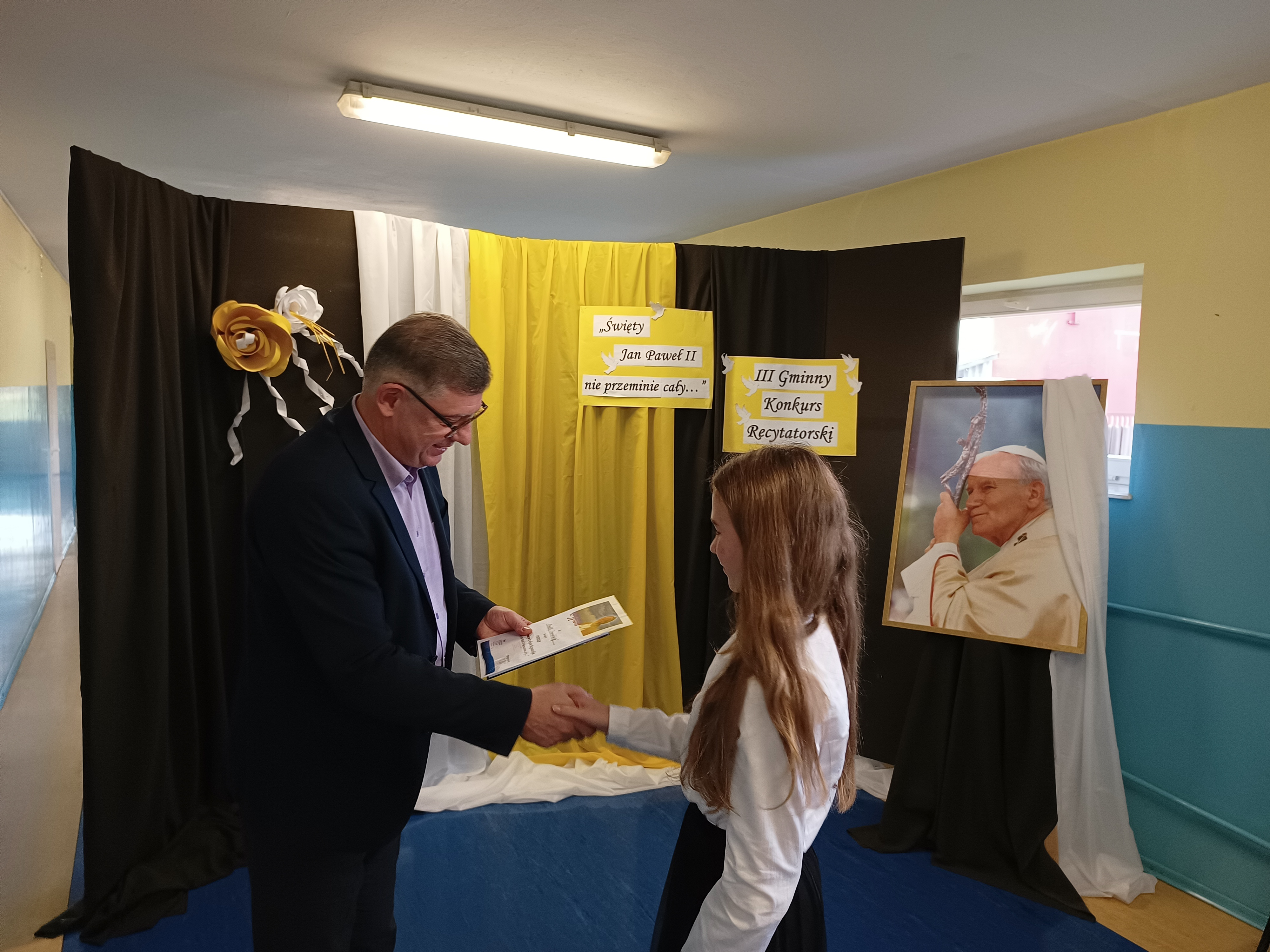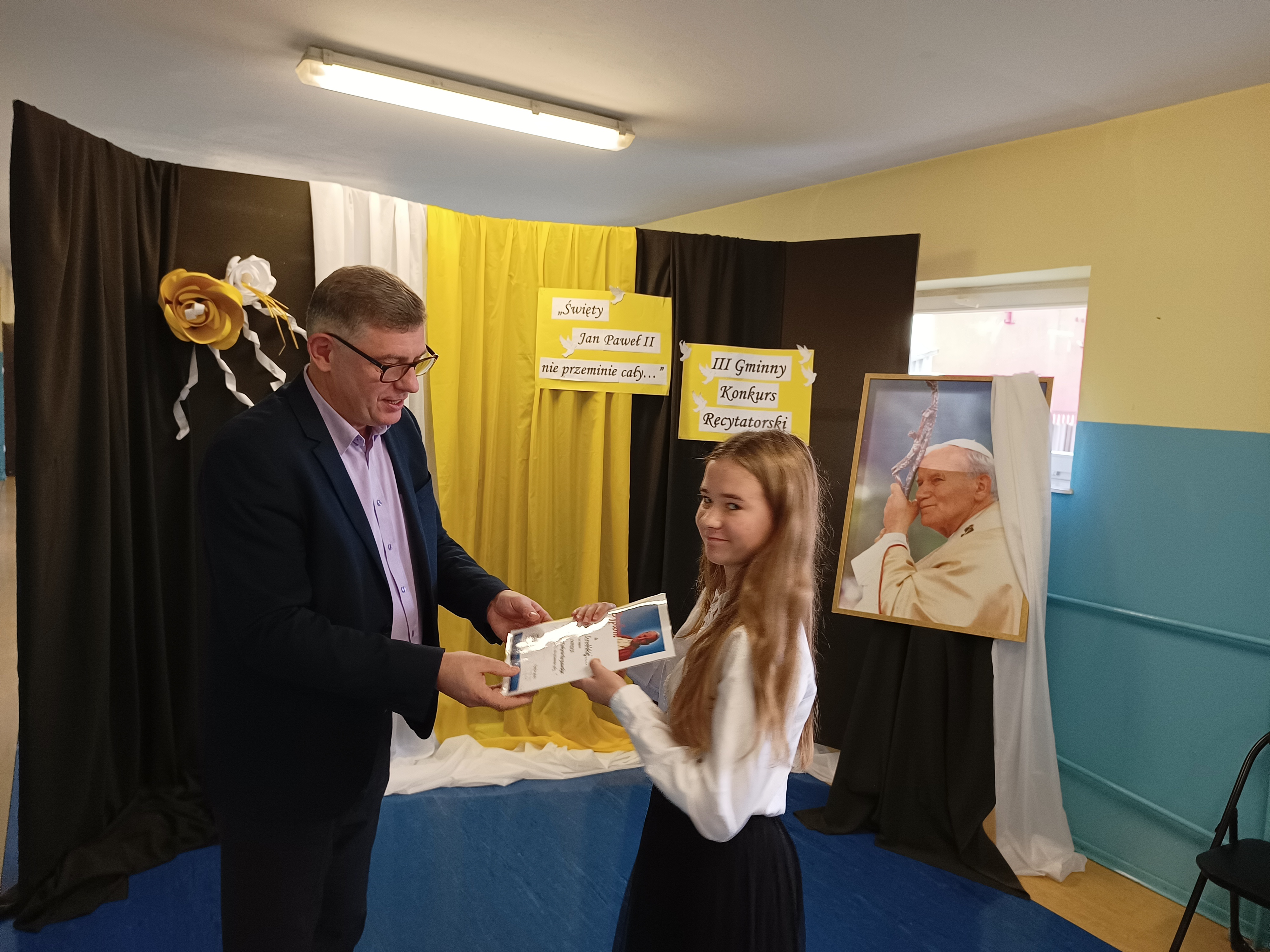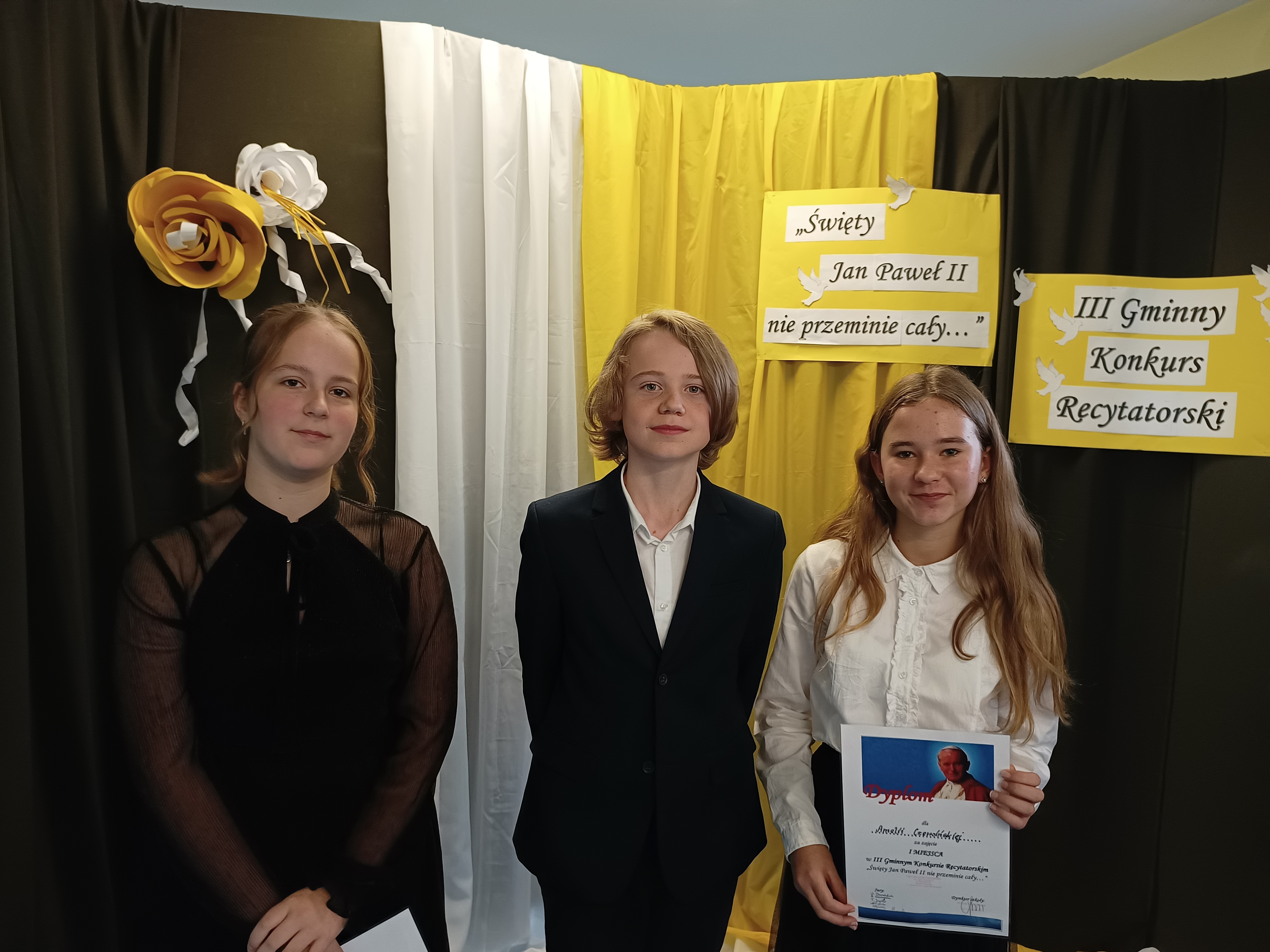 Z ogromną przyjemnością informujemy, że Amelia Czerwińska – uczennica klasy 6a zdobyła I miejsce w III Gminnym Konkursie Recytatorskim „Święty Jan Paweł II nie przeminie cały…”