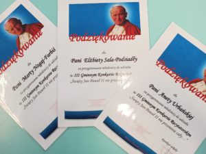 Konkurs odbywał się w Publicznej Szkole Podstawowej im. Jana Pawła II w Parznicach w miłej, nastrojowej atmosferze, przy kawiarnianych stolikach, gdzie serwowane były ulubione ciastka Papieża Polaka – słynne kremówki. Organizatorzy za główny cel konkursu przyjęli popularyzację poezji Jana Pawła II, pielęgnowanie wartości estetycznych języka ojczystego, a także rozwijanie uzdolnień artystycznych młodzieży. Naszą szkołę reprezentowali również uczniowie: Julia Witczak oraz Rafał Pszczółka. Za przygotowanie uczestników do konkursu dziękujemy paniom Marcie Nogaj- Farbiś, Elżbiecie Sali -Podsiadły i Anecie Urbańskiej.