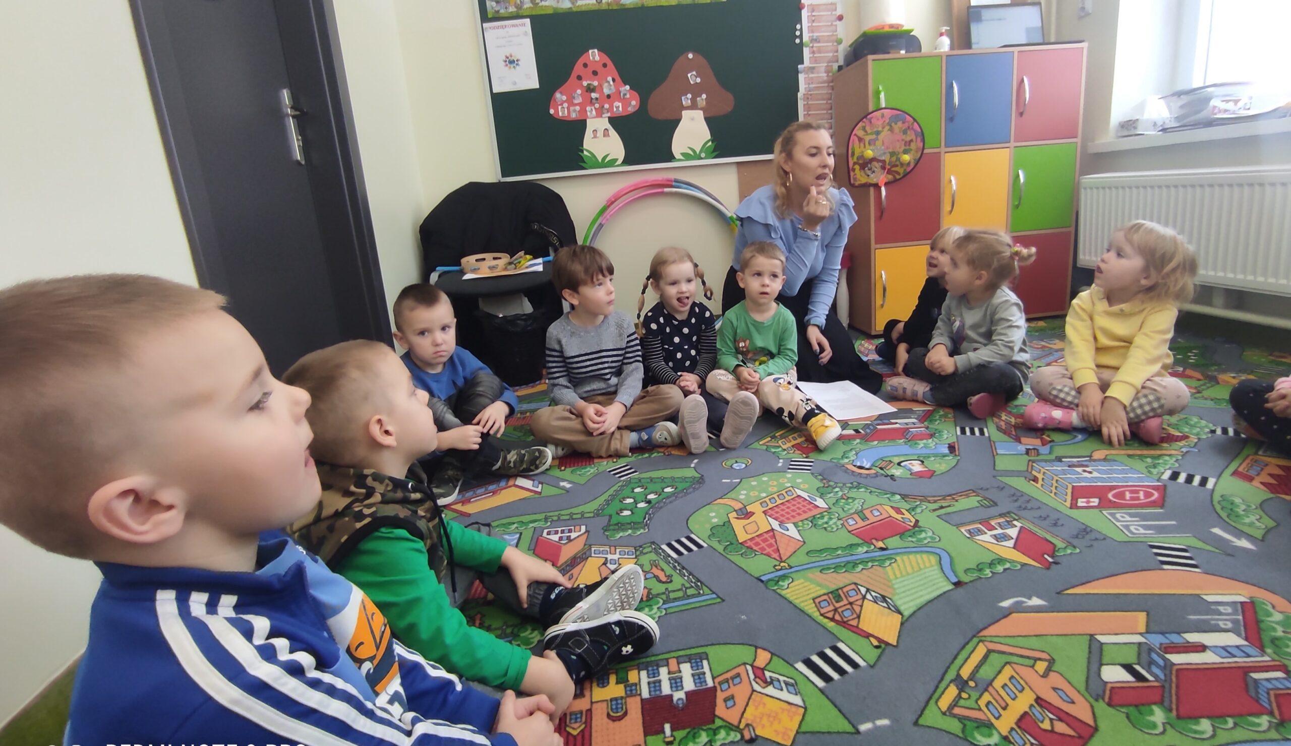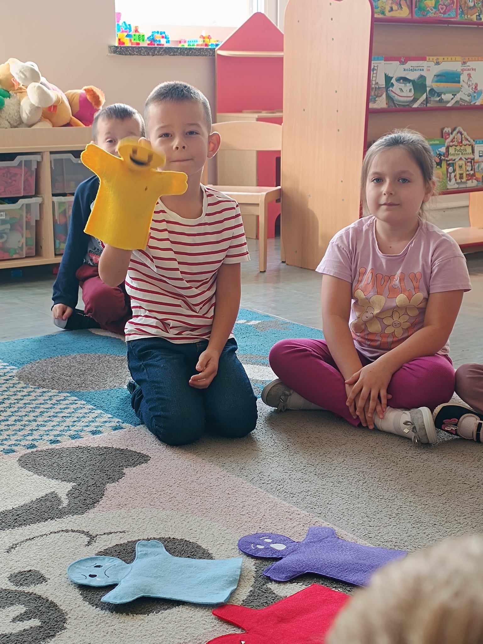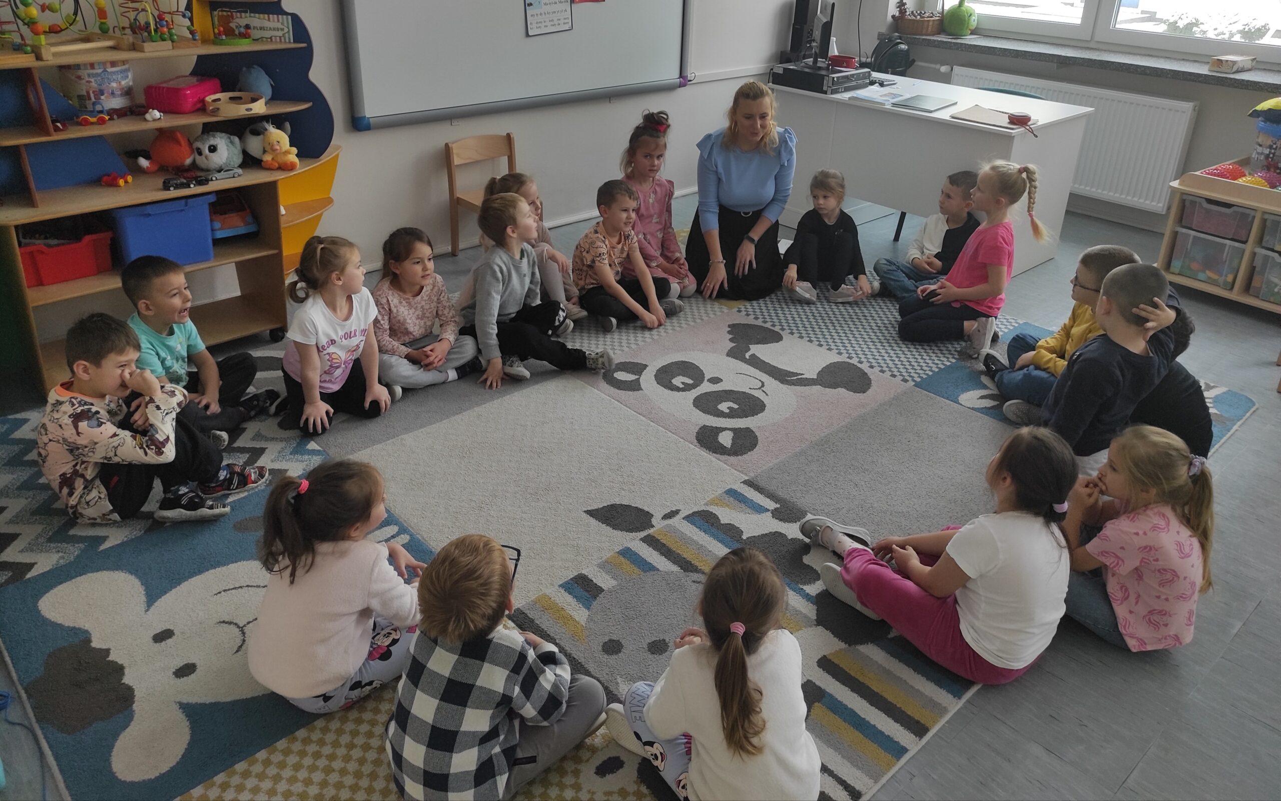 Od października 2023r. dzieci z oddziałów przedszkolnych 0a, 0b oraz z Krasnoludków uczestniczyły w zajęciach, prowadzonych przez pedagoga, psychologa i logopedę szkolnego, w ramach innowacji pedagogicznej “Emocjonalny LogoRytm: słyszę, mówię, czuję”.