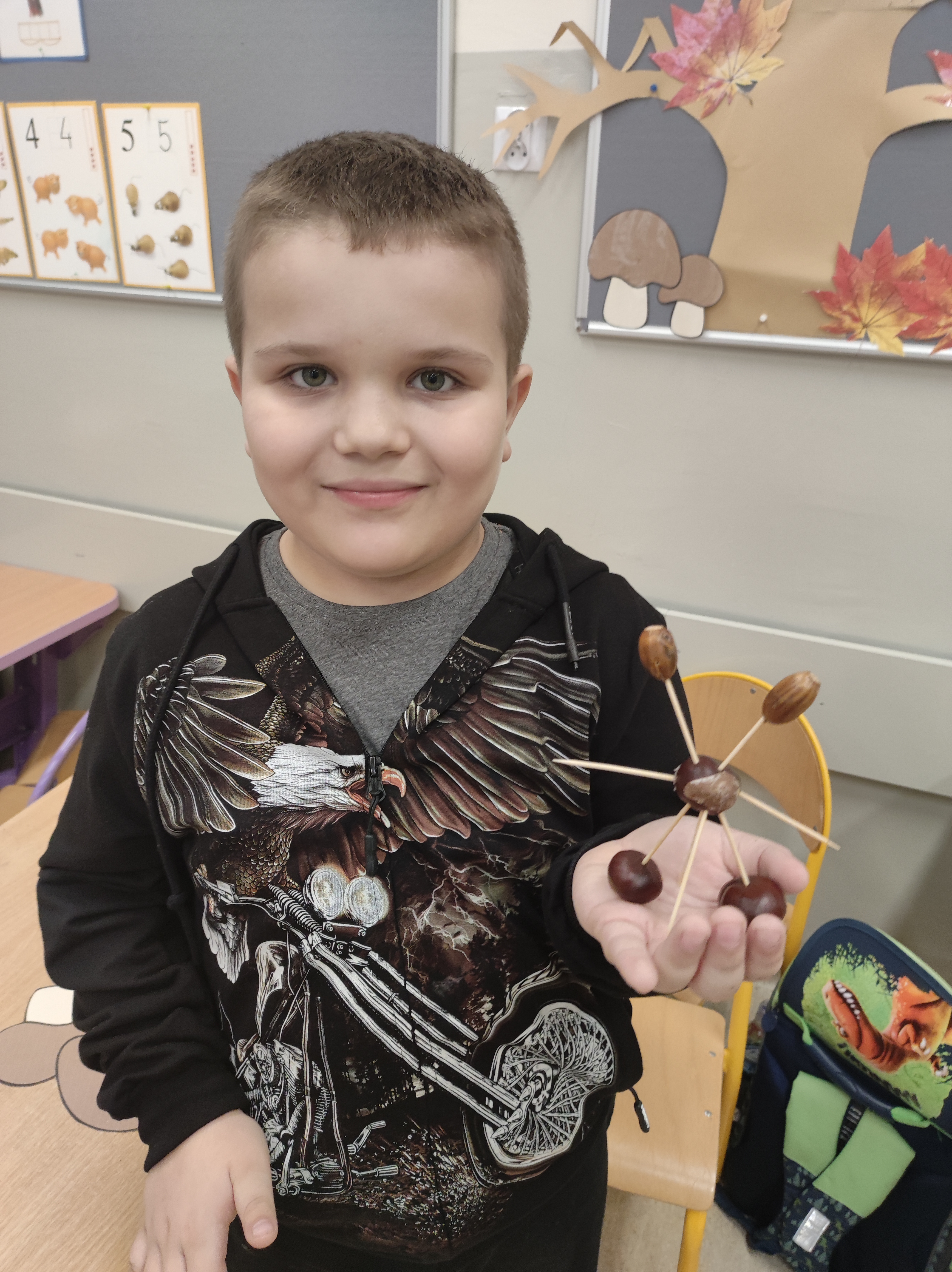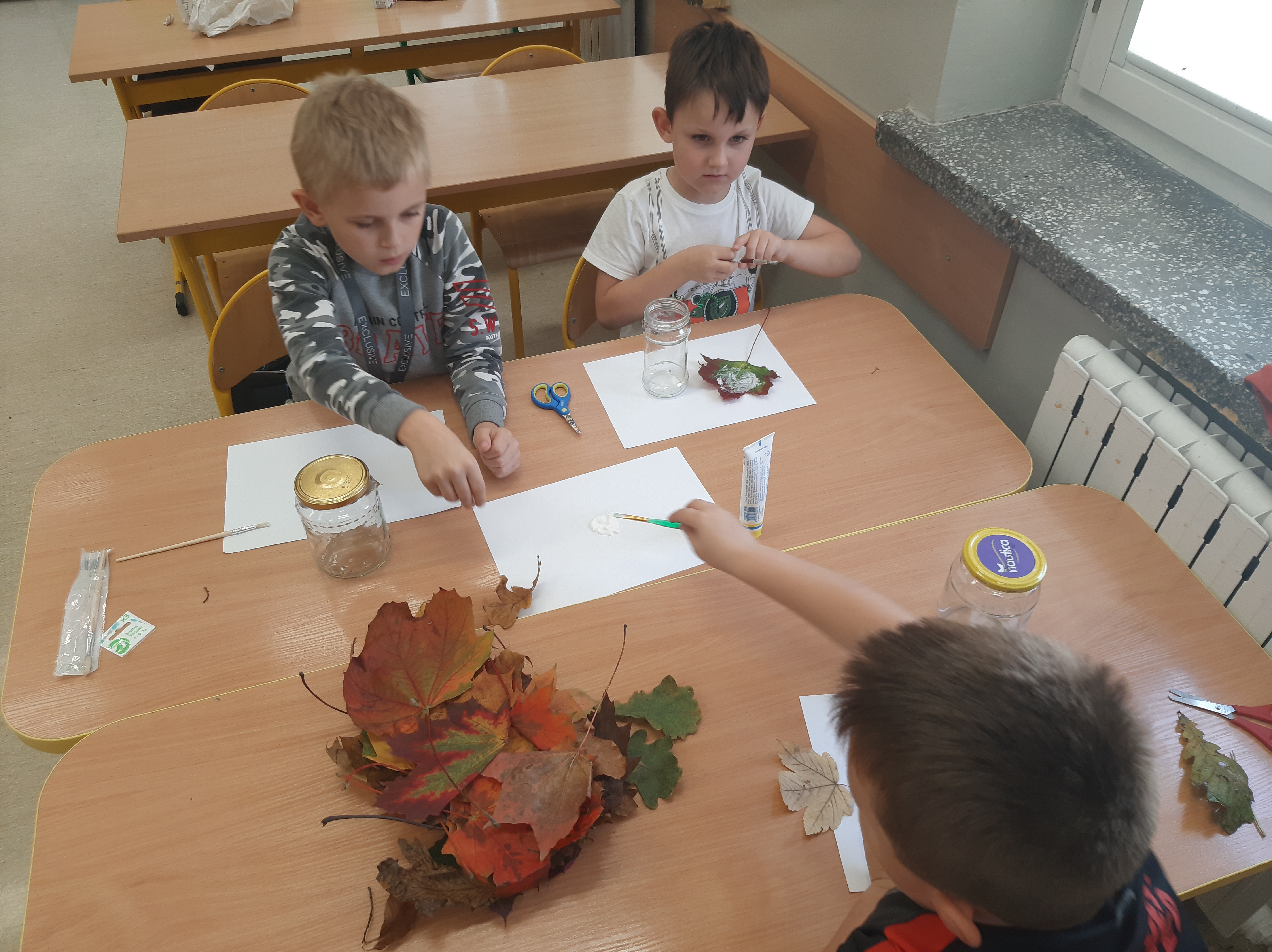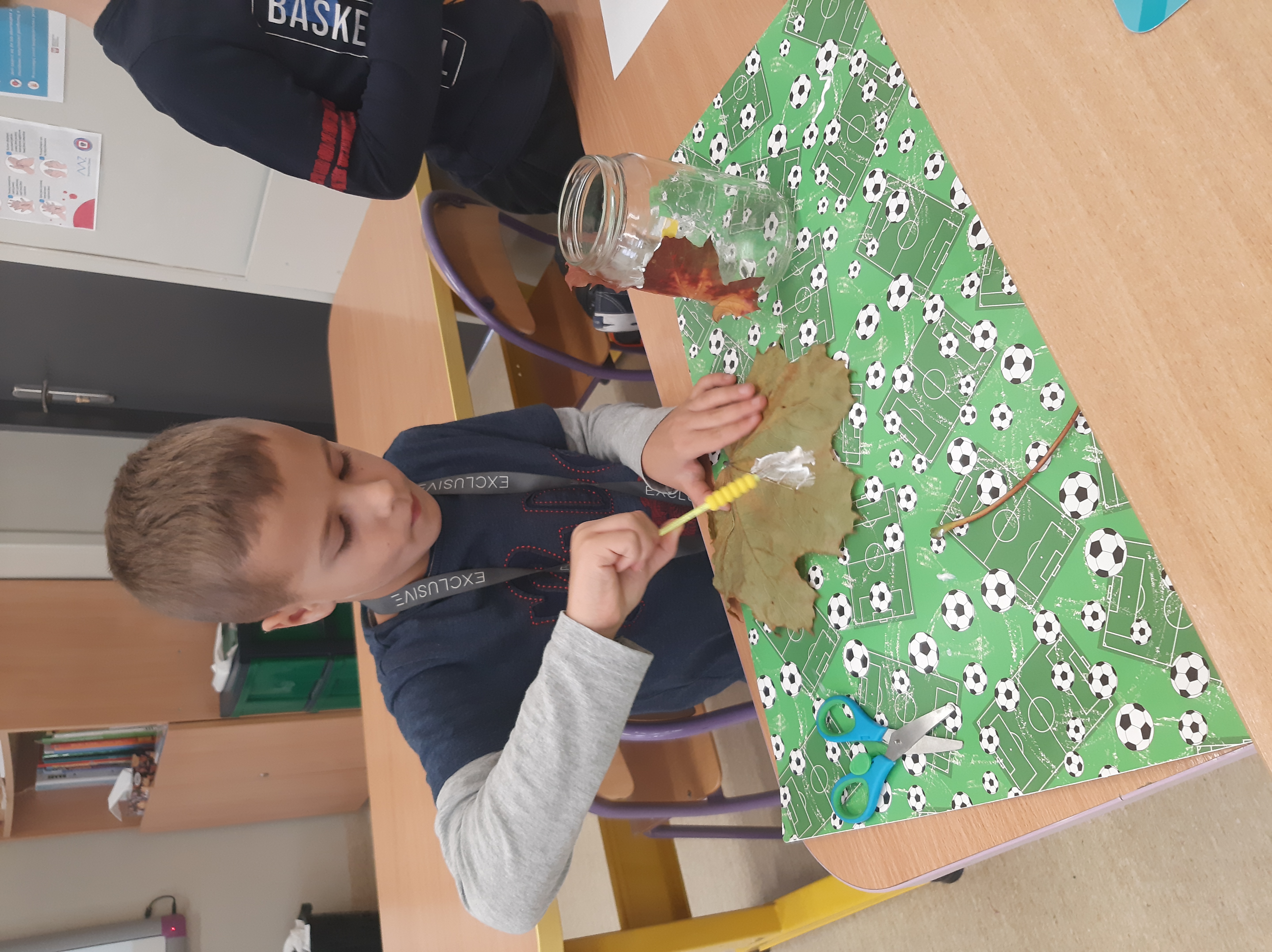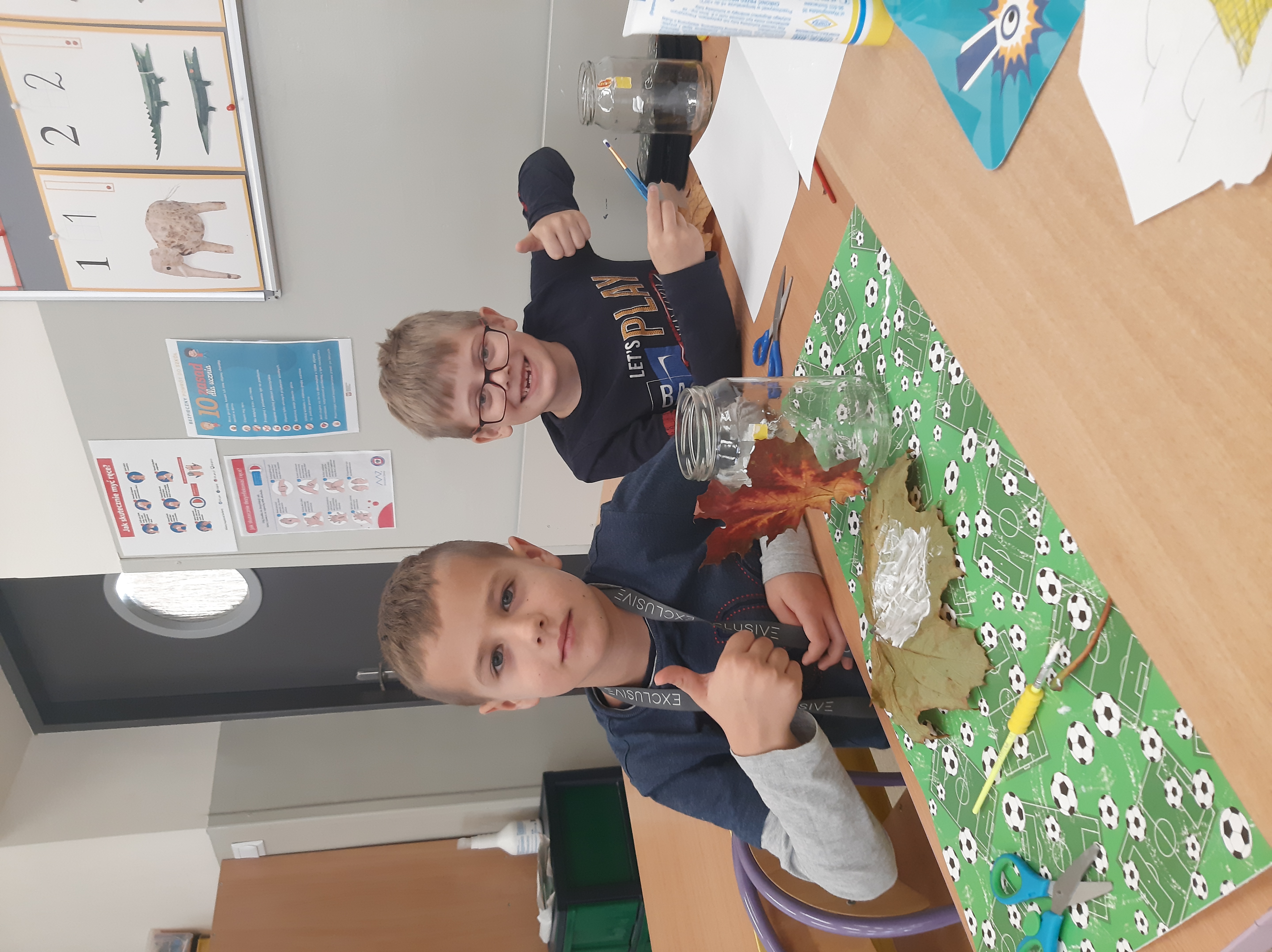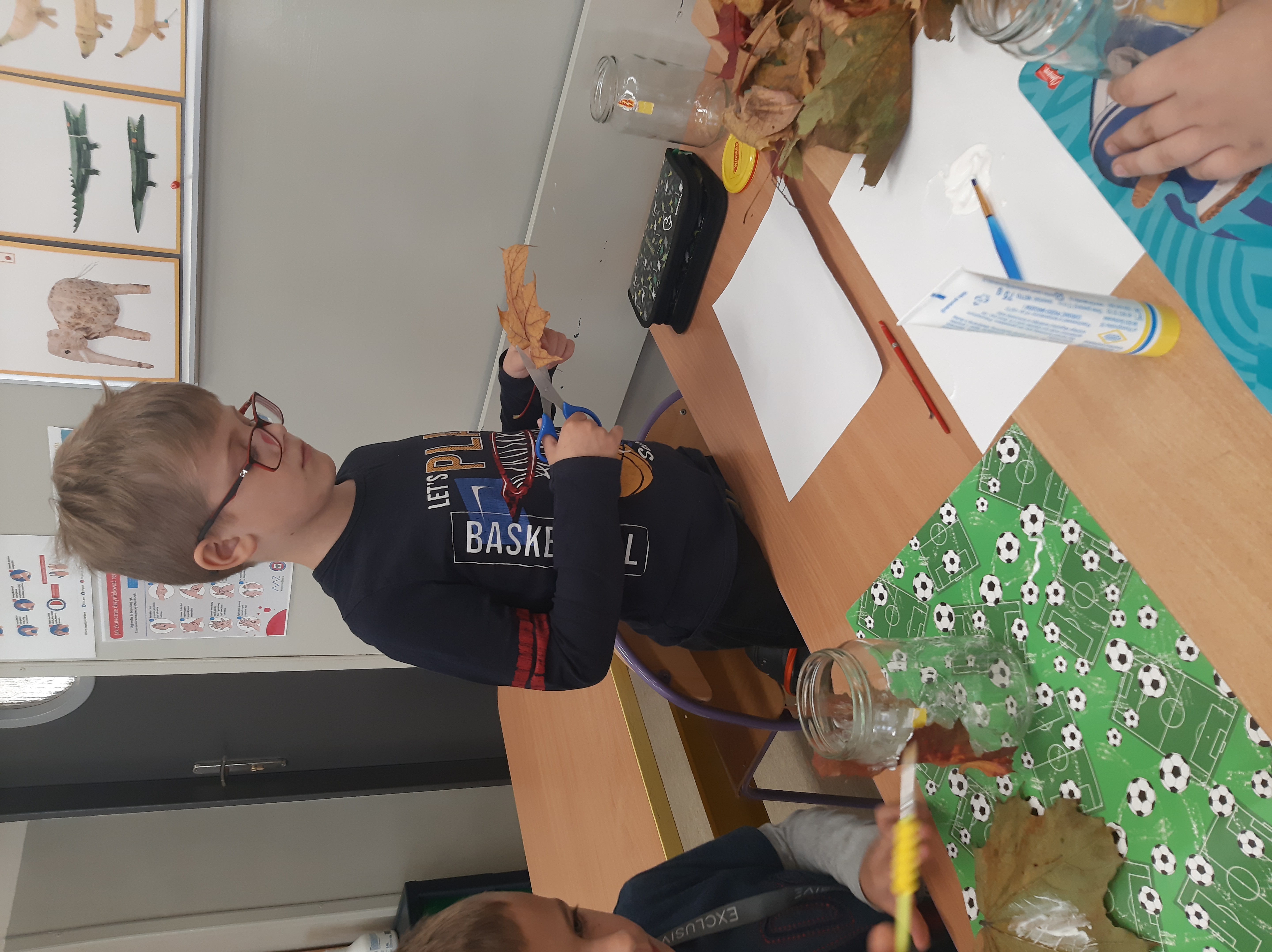 Jesień to pora roku, podczas której słoneczko coraz rzadziej zagląda do okien naszej sali i w związku z tym uczniowie klasy Ib wykonali bardzo efektowne lampiony z liści. Musieli się przy tym wykazać pomysłowością i kreatywnością. Dzieci zauważyły, że wieczory są coraz krótsze, coraz wcześniej robi się ciemno… miło jest usiąść razem, z gorącą herbatką i patrzeć na ciepłe światełko naszych lampionów. Kolejnym zadaniem naszych Pierwszaków były radosna twórczość na kartce papieru. Dzieci tworzyły kompozycje, mozaiki z liści, a nawet próbowały stworzyć „liściowe zwierzątka”. Nieodzownym elementem aktualnej pory roku są także ludziki z kasztanów, żołędzi i innych darów jesieni. Takie „jesienne stworki” także wykonywaliśmy w klasie. Mamy jeszcze mnóstwo planów na działania w ramach innowacji, które systematycznie będziemy umieszczać na stronie internetowej naszej szkoły. Należy podkreślić, że wszystkie działania uczą nasze Pierwszaki współpracy w grupie, twórczego myślenia i kreatywności oraz zrozumienia potrzeby dbania o przyrodę i najbliższe środowisko.