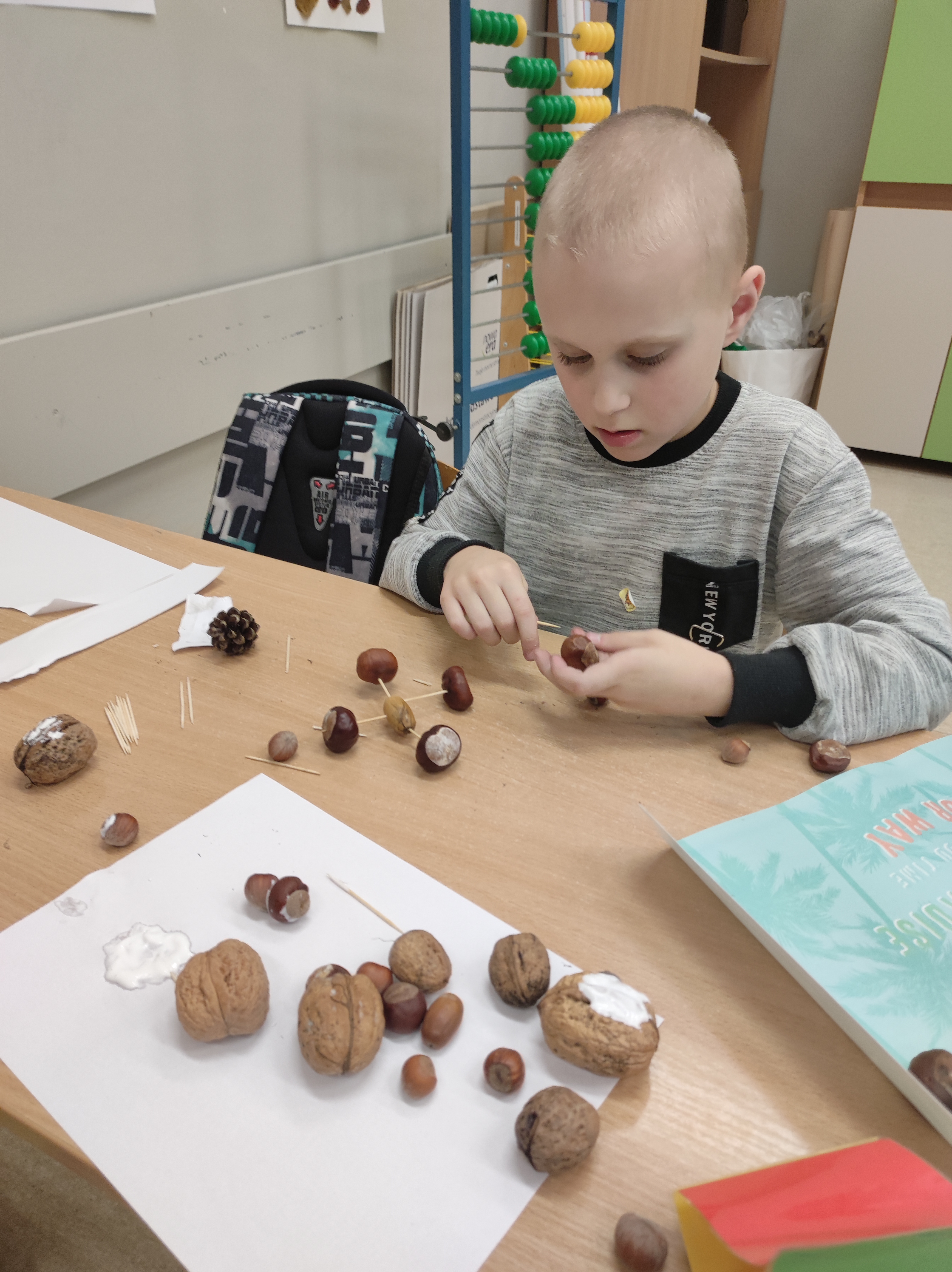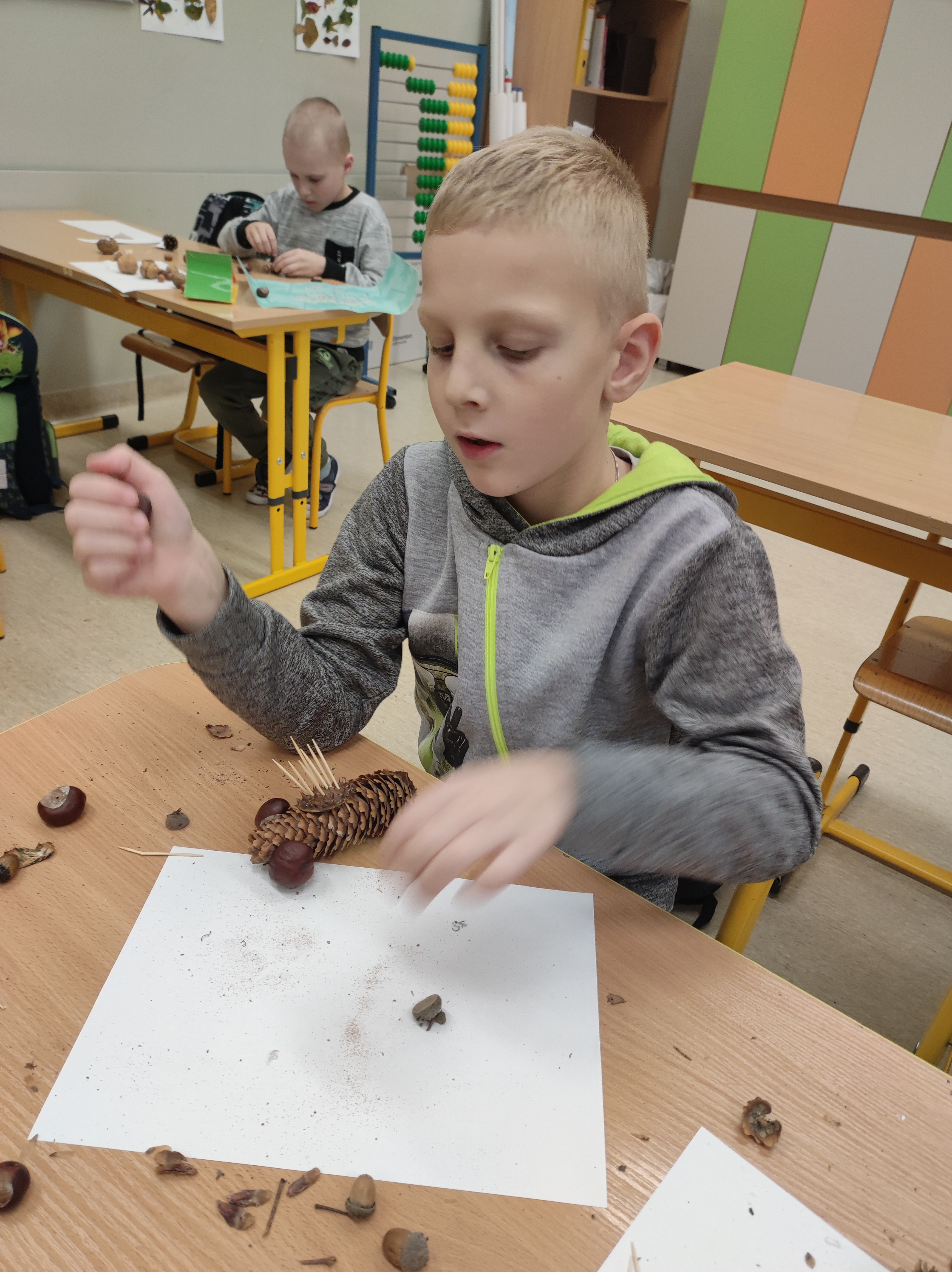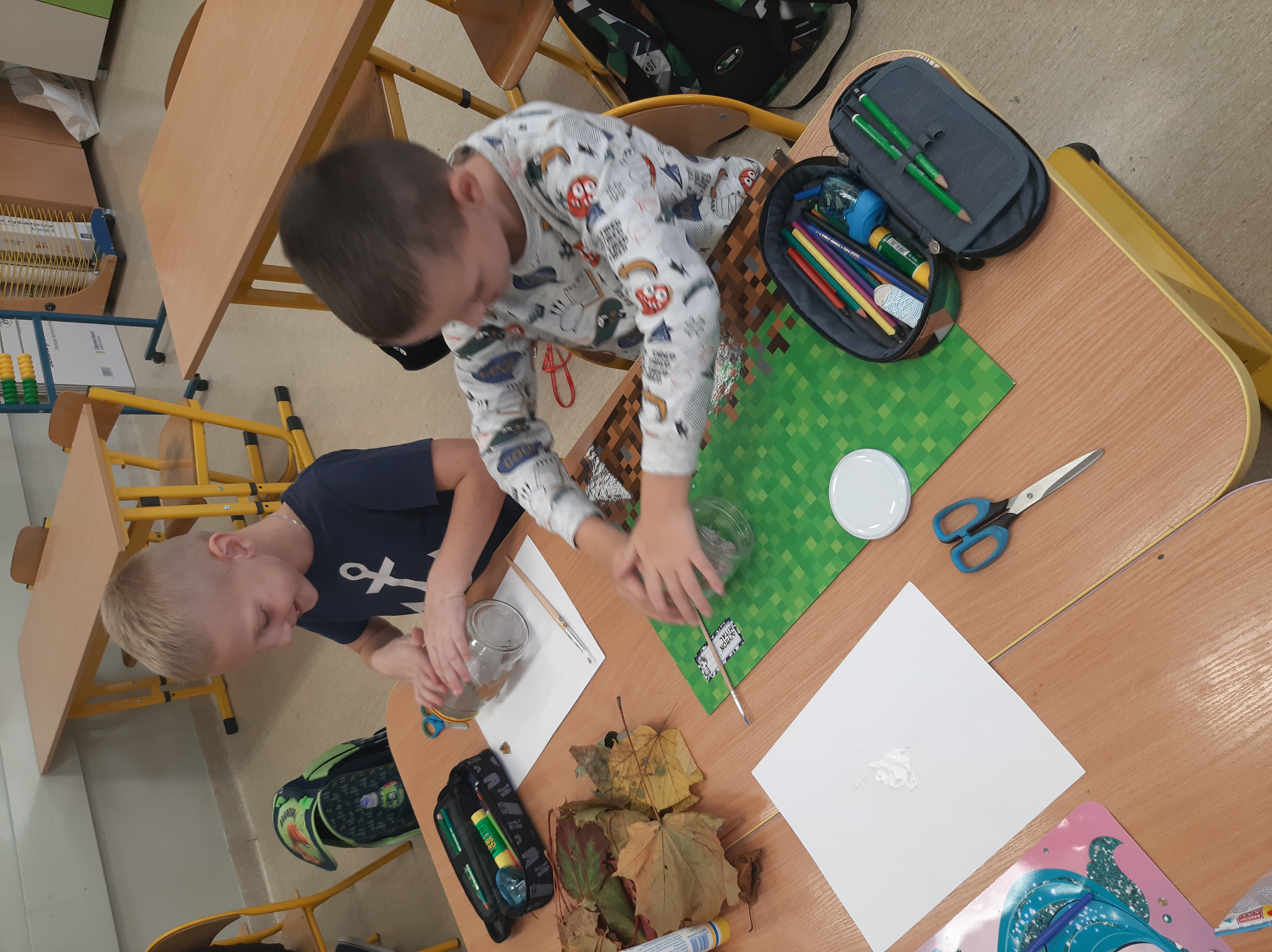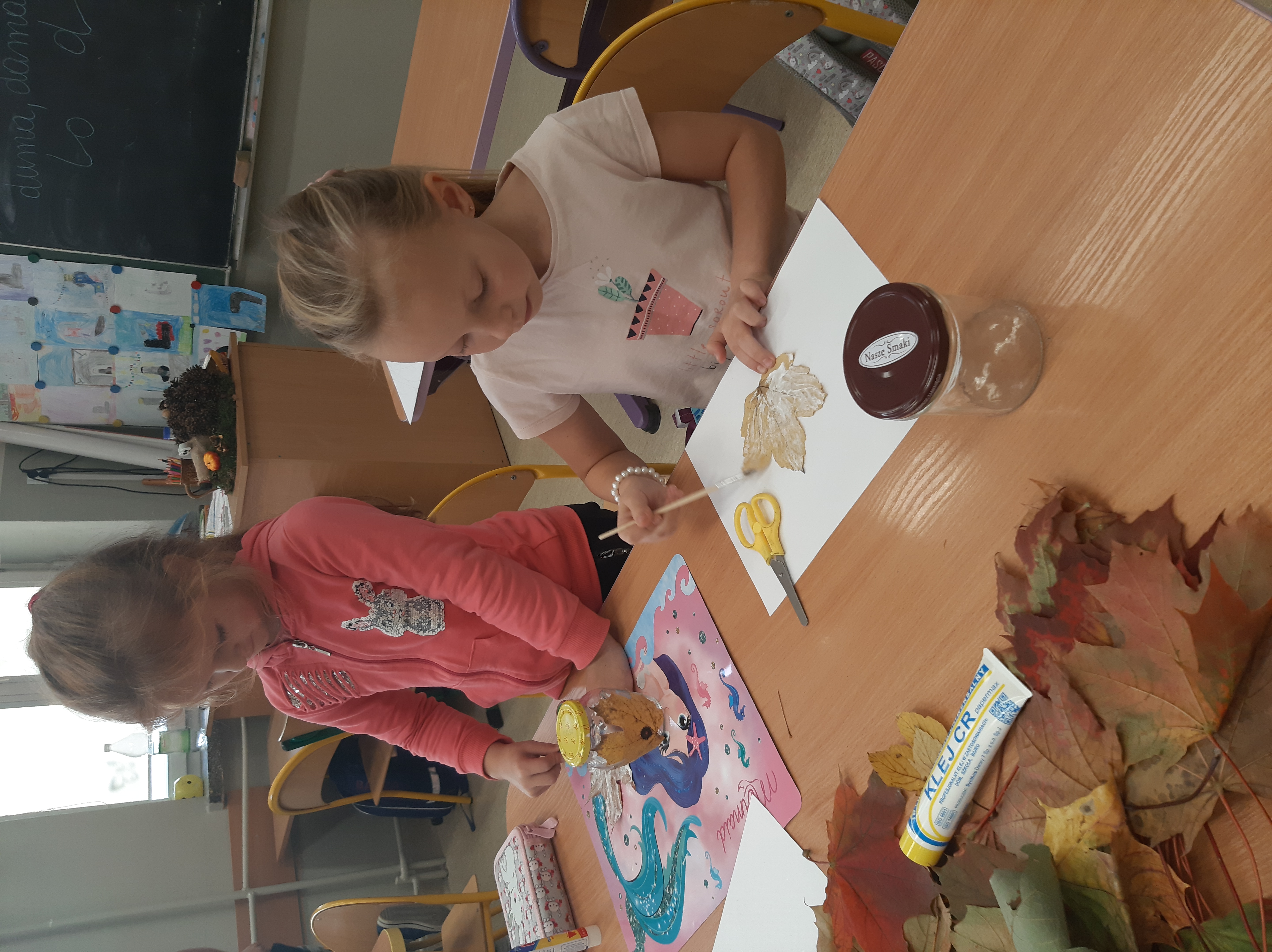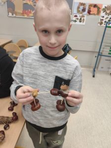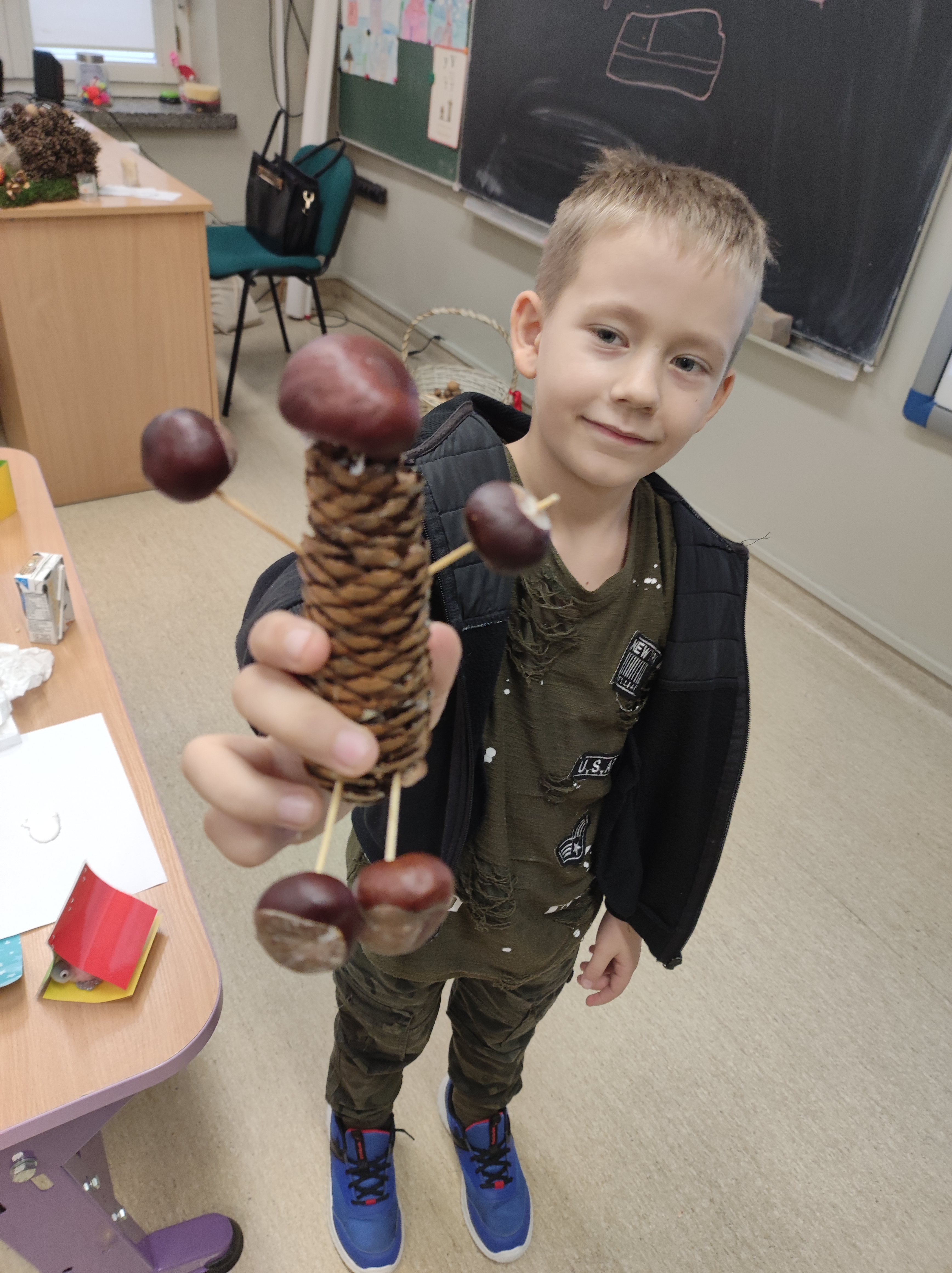 Jesień to pora roku, podczas której słoneczko coraz rzadziej zagląda do okien naszej sali i w związku z tym uczniowie klasy Ib wykonali bardzo efektowne lampiony z liści. Musieli się przy tym wykazać pomysłowością i kreatywnością. Dzieci zauważyły, że wieczory są coraz krótsze, coraz wcześniej robi się ciemno… miło jest usiąść razem, z gorącą herbatką i patrzeć na ciepłe światełko naszych lampionów. Kolejnym zadaniem naszych Pierwszaków były radosna twórczość na kartce papieru. Dzieci tworzyły kompozycje, mozaiki z liści, a nawet próbowały stworzyć „liściowe zwierzątka”. Nieodzownym elementem aktualnej pory roku są także ludziki z kasztanów, żołędzi i innych darów jesieni. Takie „jesienne stworki” także wykonywaliśmy w klasie. Mamy jeszcze mnóstwo planów na działania w ramach innowacji, które systematycznie będziemy umieszczać na stronie internetowej naszej szkoły. Należy podkreślić, że wszystkie działania uczą nasze Pierwszaki współpracy w grupie, twórczego myślenia i kreatywności oraz zrozumienia potrzeby dbania o przyrodę i najbliższe środowisko.