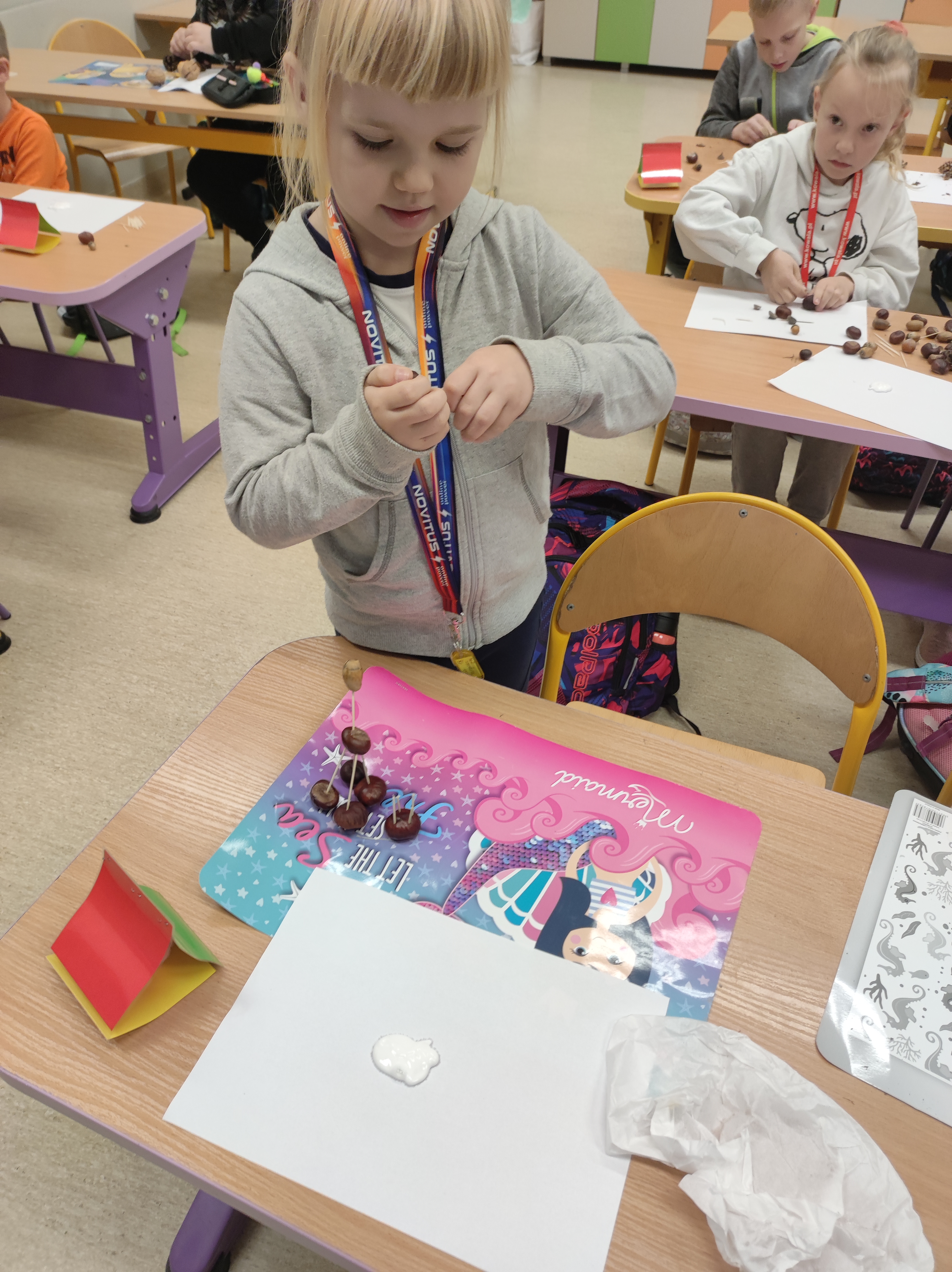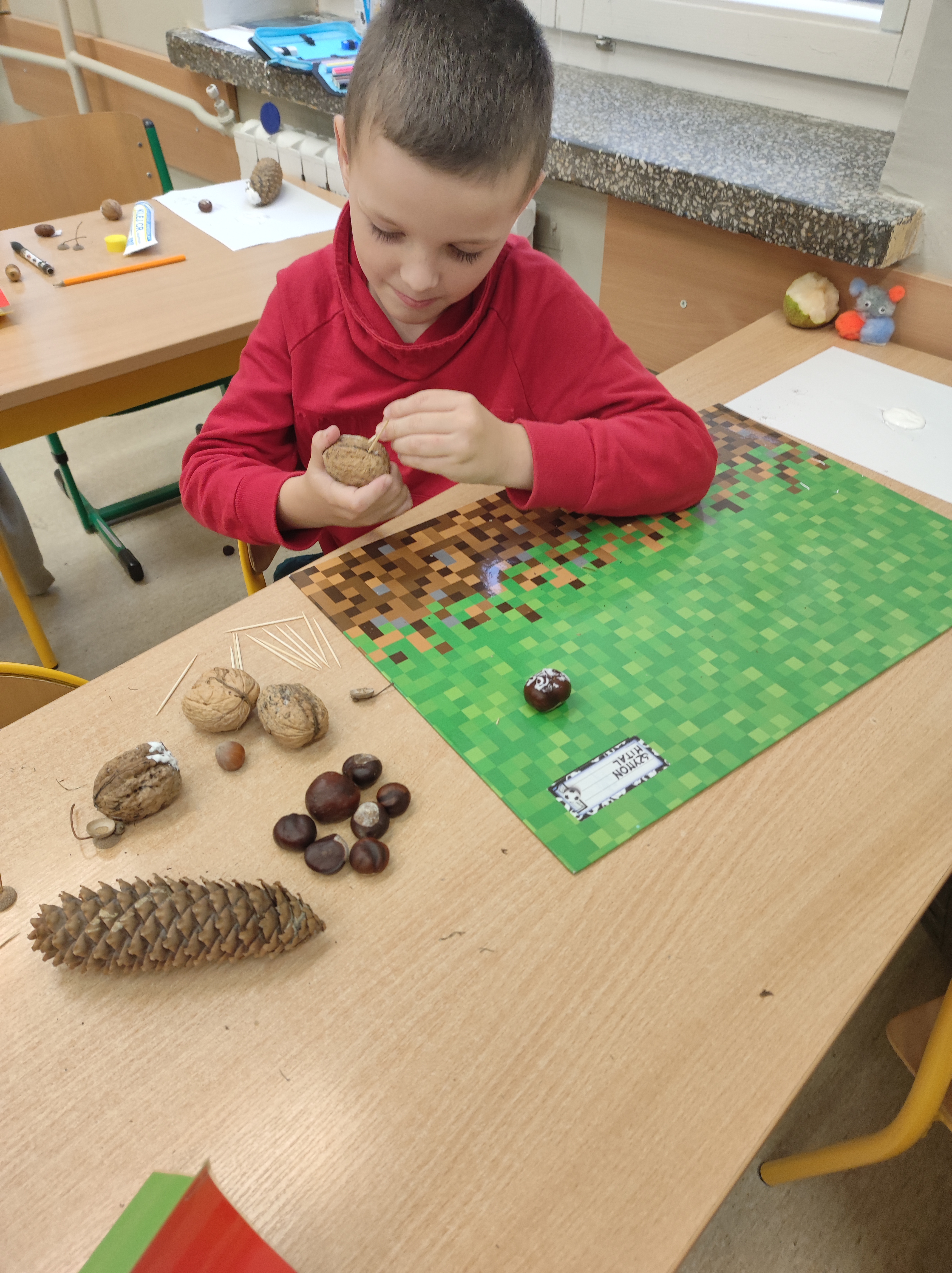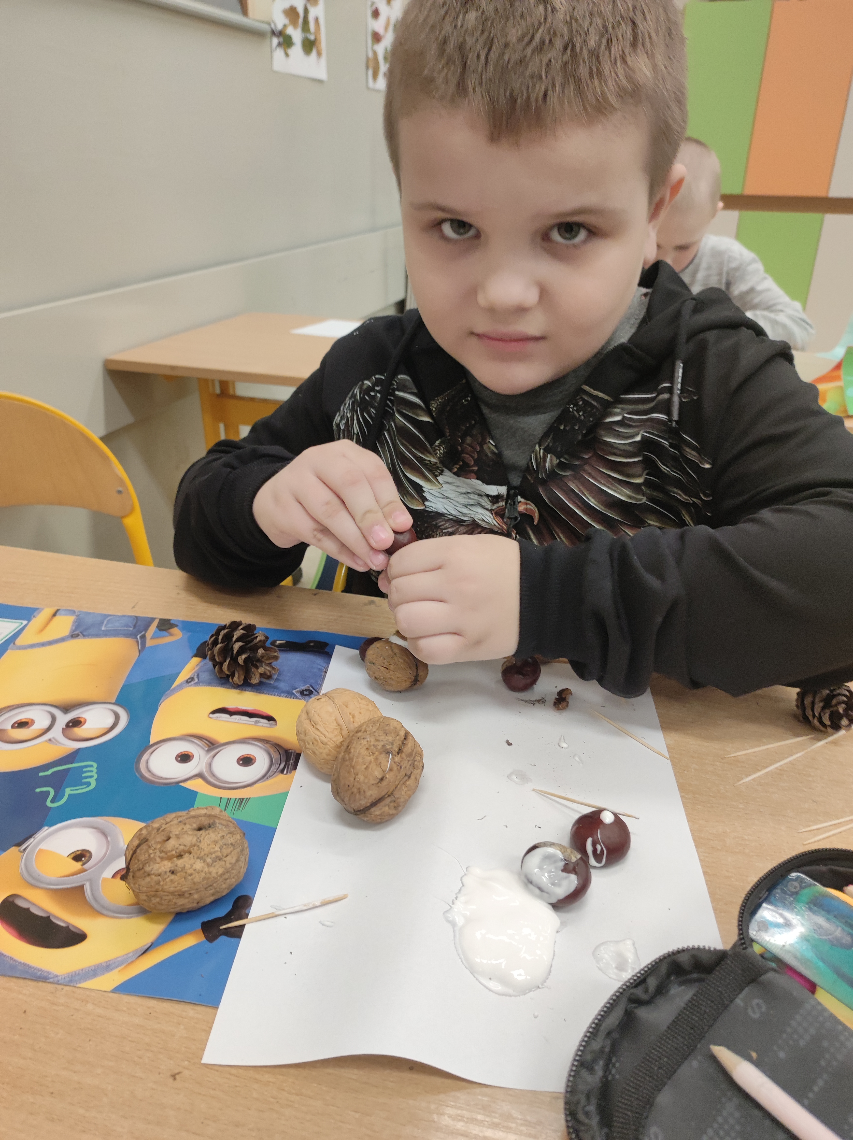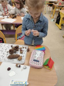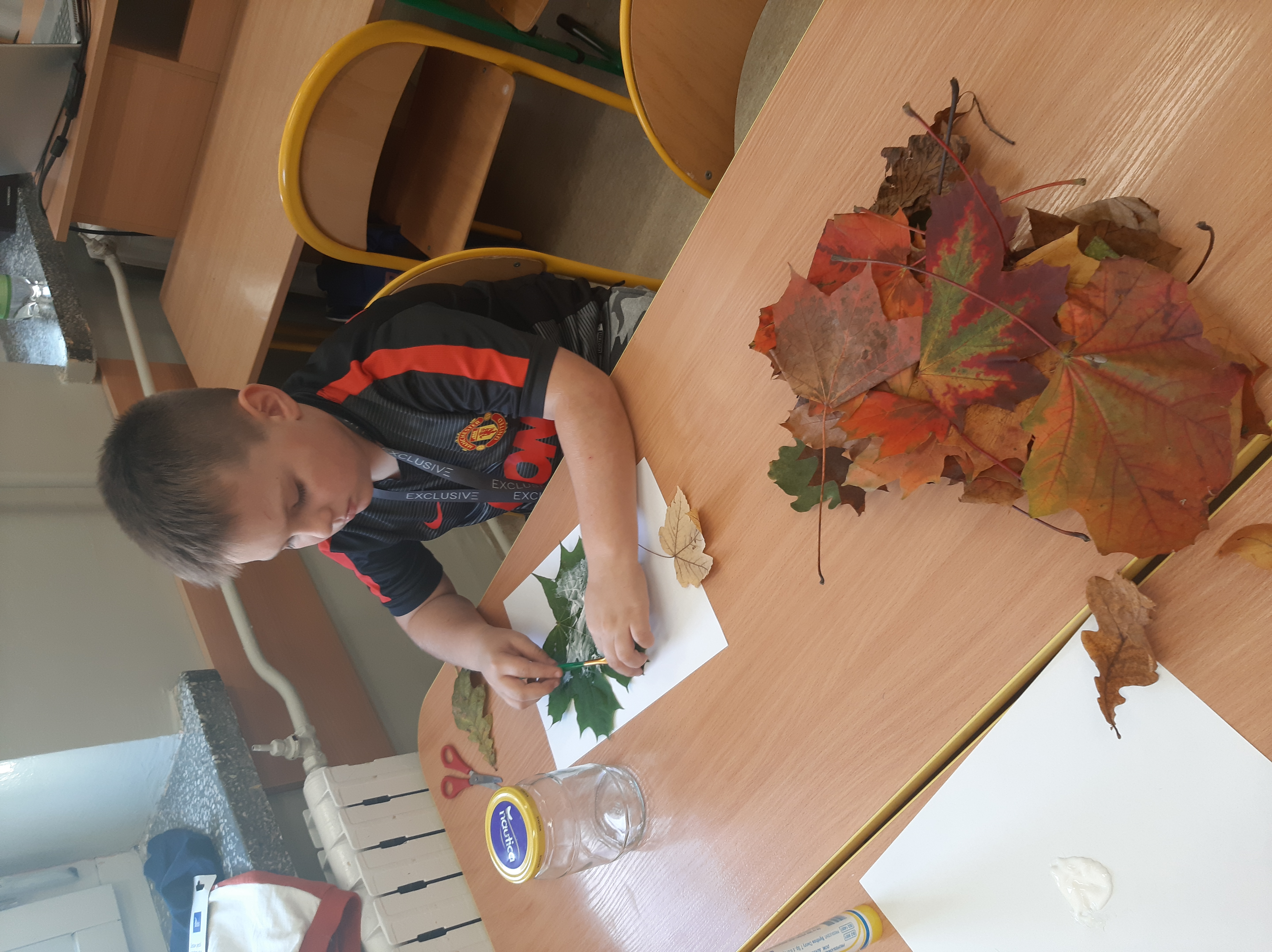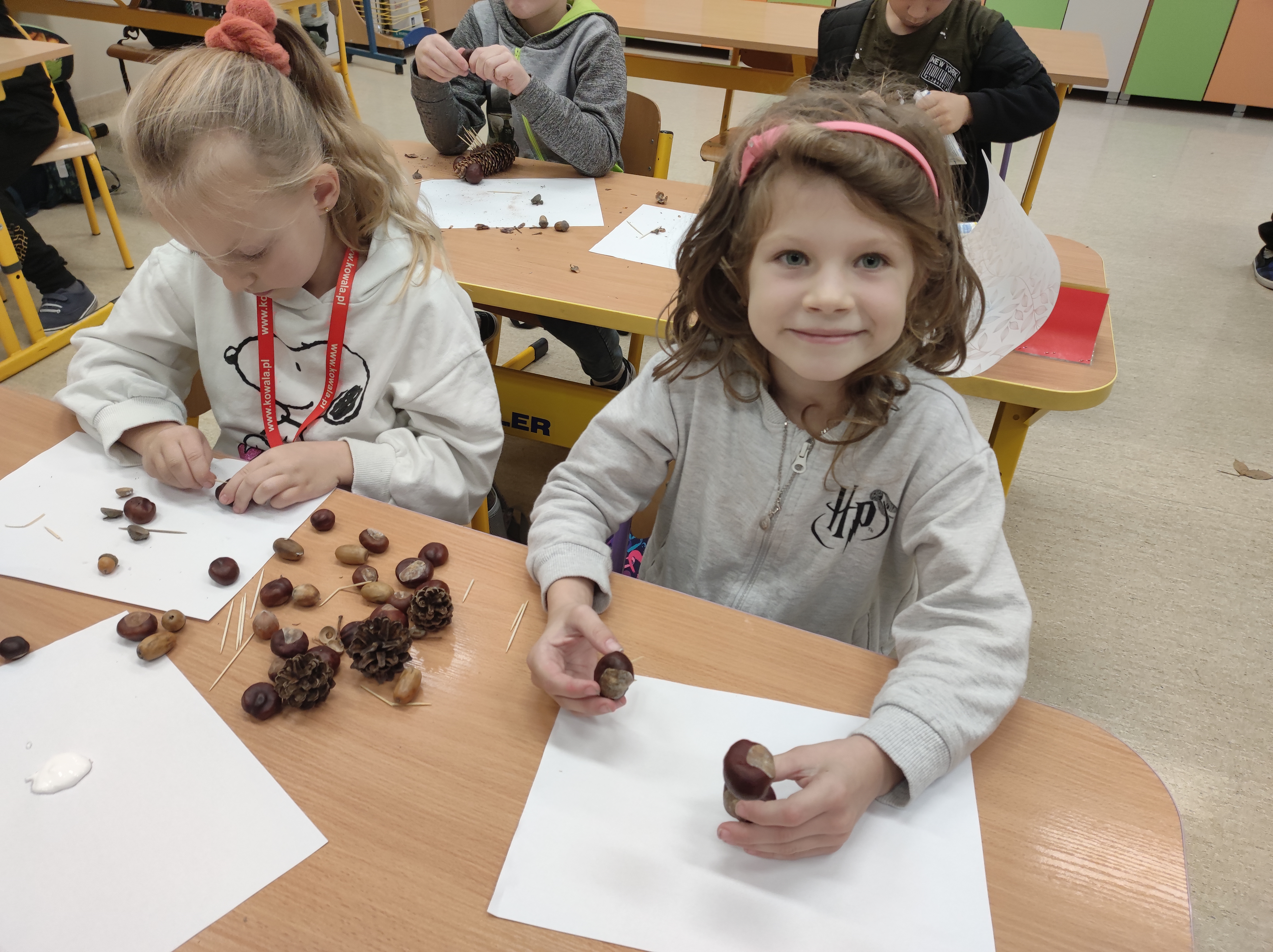 Jesień to pora roku, podczas której słoneczko coraz rzadziej zagląda do okien naszej sali i w związku z tym uczniowie klasy Ib wykonali bardzo efektowne lampiony z liści. Musieli się przy tym wykazać pomysłowością i kreatywnością. Dzieci zauważyły, że wieczory są coraz krótsze, coraz wcześniej robi się ciemno… miło jest usiąść razem, z gorącą herbatką i patrzeć na ciepłe światełko naszych lampionów. Kolejnym zadaniem naszych Pierwszaków były radosna twórczość na kartce papieru. Dzieci tworzyły kompozycje, mozaiki z liści, a nawet próbowały stworzyć „liściowe zwierzątka”. Nieodzownym elementem aktualnej pory roku są także ludziki z kasztanów, żołędzi i innych darów jesieni. Takie „jesienne stworki” także wykonywaliśmy w klasie. Mamy jeszcze mnóstwo planów na działania w ramach innowacji, które systematycznie będziemy umieszczać na stronie internetowej naszej szkoły. Należy podkreślić, że wszystkie działania uczą nasze Pierwszaki współpracy w grupie, twórczego myślenia i kreatywności oraz zrozumienia potrzeby dbania o przyrodę i najbliższe środowisko.