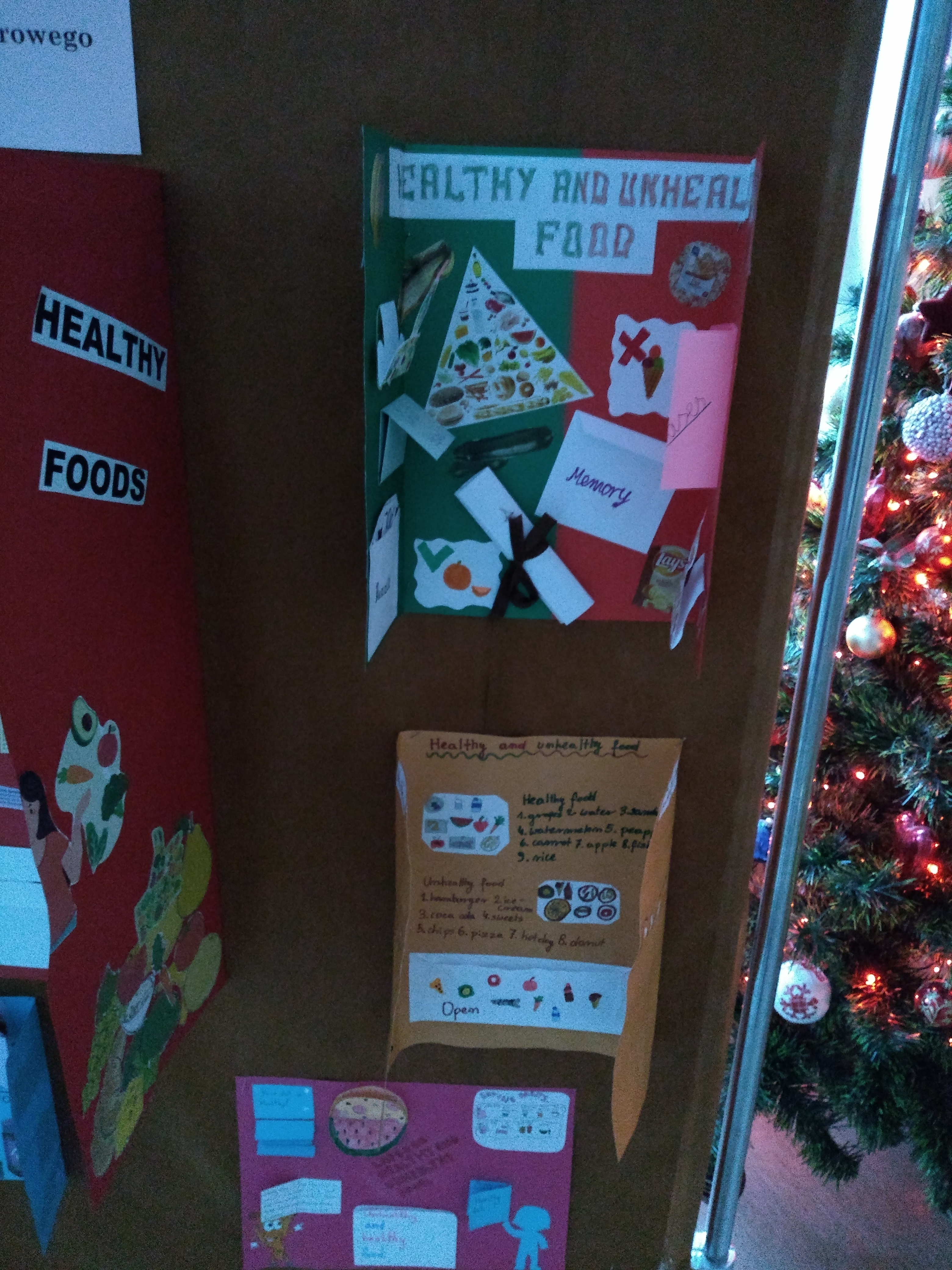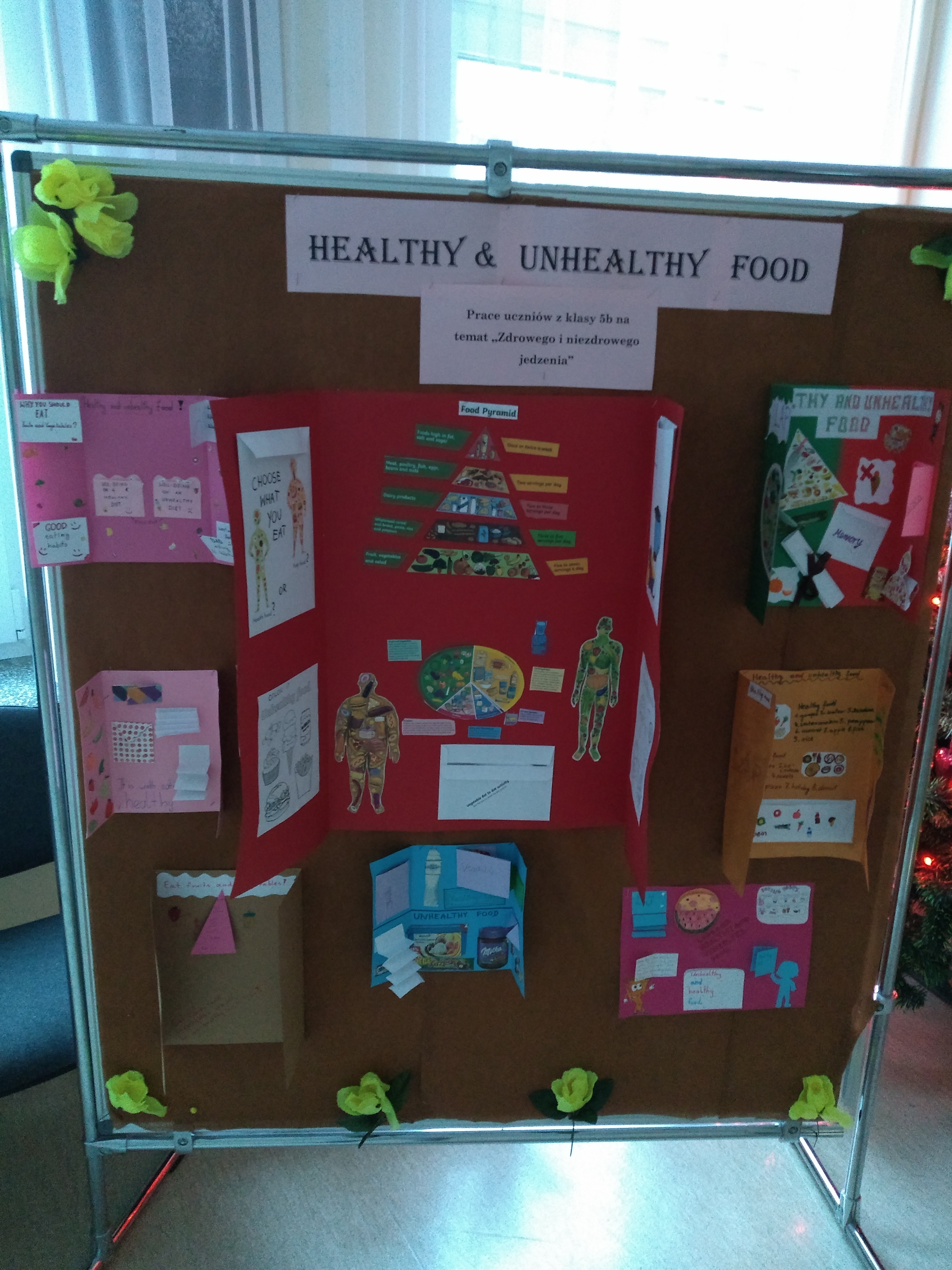 Zdrowe żywienie z jego pięcioma posiłkami dziennie, porcją świeżych warzyw i owoców, wypijaną odpowiednią ilością wody, a także towarzyszącej temu aktywności fizycznej – to gwarancja zdrowia, odpowiedniej pracy mózgu i właściwego rozwoju. Efektem kilku zajęć na temat zdrowego żywienia było przygotowanie projektów – lapbooków, zaprezentowanych następnie na forum klasy w języku angielskim. Klasa 5b dołożyła wszelkich starań, by oprócz prezentacji słownictwa i zwrotów leksykalnych umieścić w swoich pracach także puzzle, gry, wykreślanki, zagadki, krzyżówki i wiele innych wspaniałych materiałów, które mogą służyć za bazę do pracy i nauki.