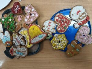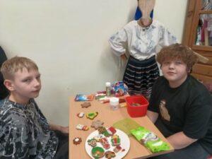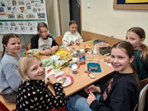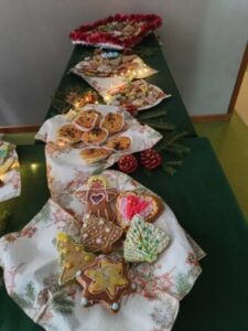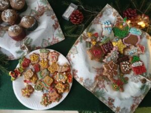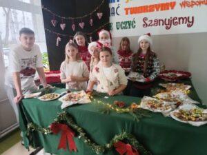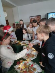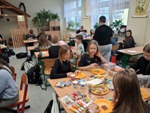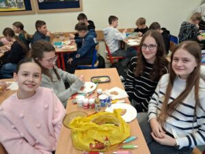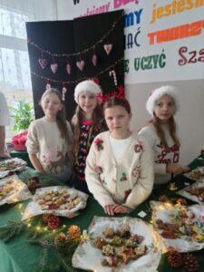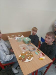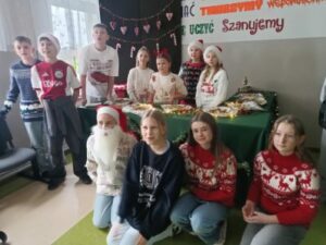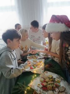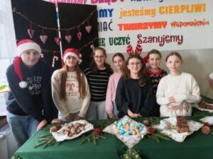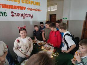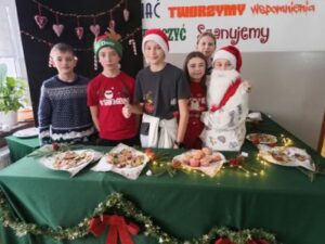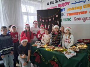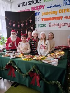 3 i 4 grudnia w naszej szkole odbył się Kiermasz Świątecznych Wypieków. Szkolny korytarz zamienił się w prawdziwą krainę zapachów i smaków, wypełnioną stołami pełnymi pysznych, domowych słodkości. Na stołach pojawiły się aromatyczne pierniki, babeczki i ciasta, które wprowadziły wszystkich w wyjątkowy, świąteczny nastrój. Przygotowania do kiermaszu poprzedziły warsztaty dekorowania pierniczków, na których uczniowie klas szóstych własnoręcznie ozdabiali przygotowane w domu ciasteczka. Kolorowe lukry, posypki i świąteczne kształty pozwoliły uczniom stworzyć prawdziwe małe dzieła sztuki. Kiermasz już od pierwszych chwil cieszył się ogromnym zainteresowaniem. Wszystkim udzieliła się ciepła, radosna przedświąteczna atmosfera. Dzięki zaangażowaniu wielu osób wydarzenie przebiegło w serdecznej i rodzinnej atmosferze, a zebrane środki ( 600zł) zostaną przeznaczone na szczytny cel: dla Mai Komorowskiej, szczegóły na siepomaga.pl/maja-komorowska. Dziękujemy uczniom i ich rodzicom za zaangażowanie, kreatywność i poświęcony czas oraz wszystkim, którzy odwiedzili nasze stoisko i wsparli wydarzenie!