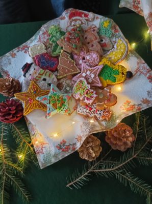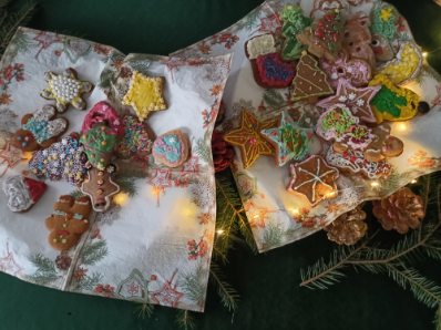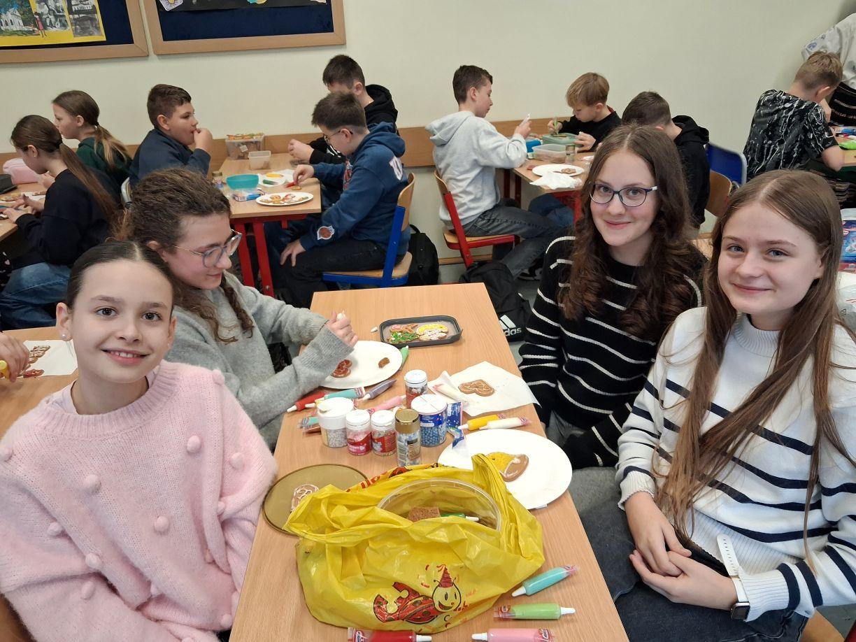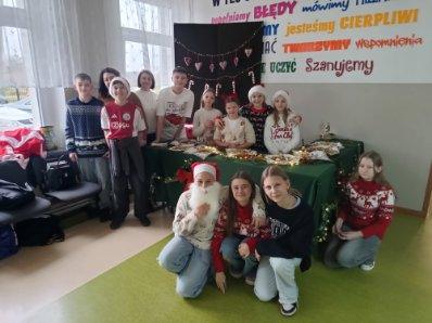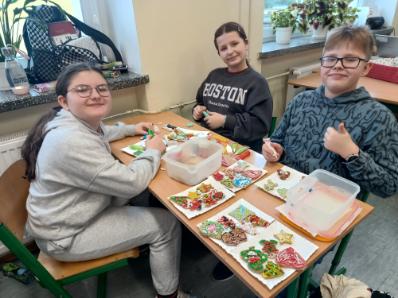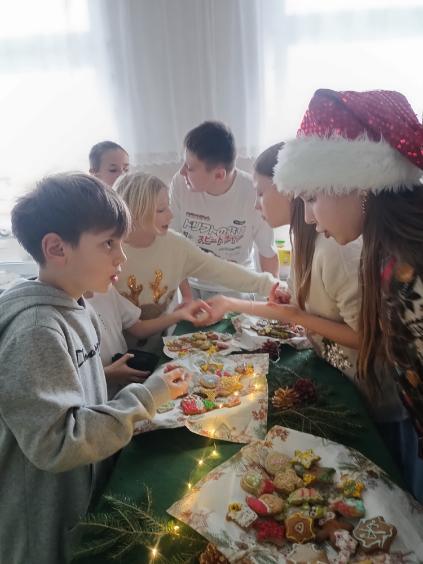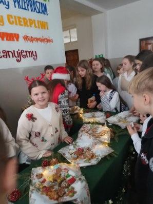 3 i 4 grudnia w naszej szkole odbył się Kiermasz Świątecznych Wypieków. Szkolny korytarz zamienił się w prawdziwą krainę zapachów i smaków, wypełnioną stołami pełnymi pysznych, domowych słodkości. Na stołach pojawiły się aromatyczne pierniki, babeczki i ciasta, które wprowadziły wszystkich w wyjątkowy, świąteczny nastrój. Przygotowania do kiermaszu poprzedziły warsztaty dekorowania pierniczków, na których uczniowie klas szóstych własnoręcznie ozdabiali przygotowane w domu ciasteczka. Kolorowe lukry, posypki i świąteczne kształty pozwoliły uczniom stworzyć prawdziwe małe dzieła sztuki. Kiermasz już od pierwszych chwil cieszył się ogromnym zainteresowaniem. Wszystkim udzieliła się ciepła, radosna przedświąteczna atmosfera. Dzięki zaangażowaniu wielu osób wydarzenie przebiegło w serdecznej i rodzinnej atmosferze, a zebrane środki ( 600zł) zostaną przeznaczone na szczytny cel: dla Mai Komorowskiej, szczegóły na siepomaga.pl/maja-komorowska. Dziękujemy uczniom i ich rodzicom za zaangażowanie, kreatywność i poświęcony czas oraz wszystkim, którzy odwiedzili nasze stoisko i wsparli wydarzenie!