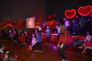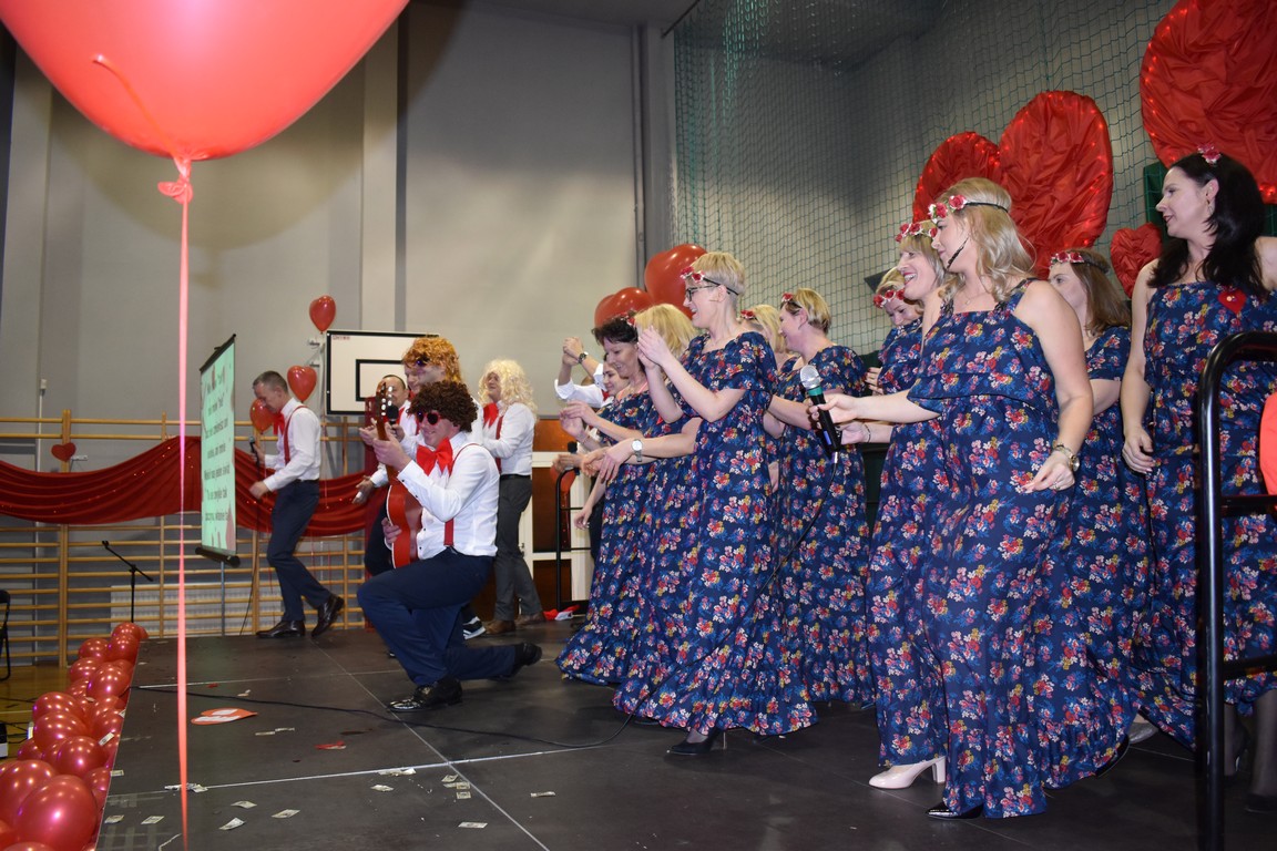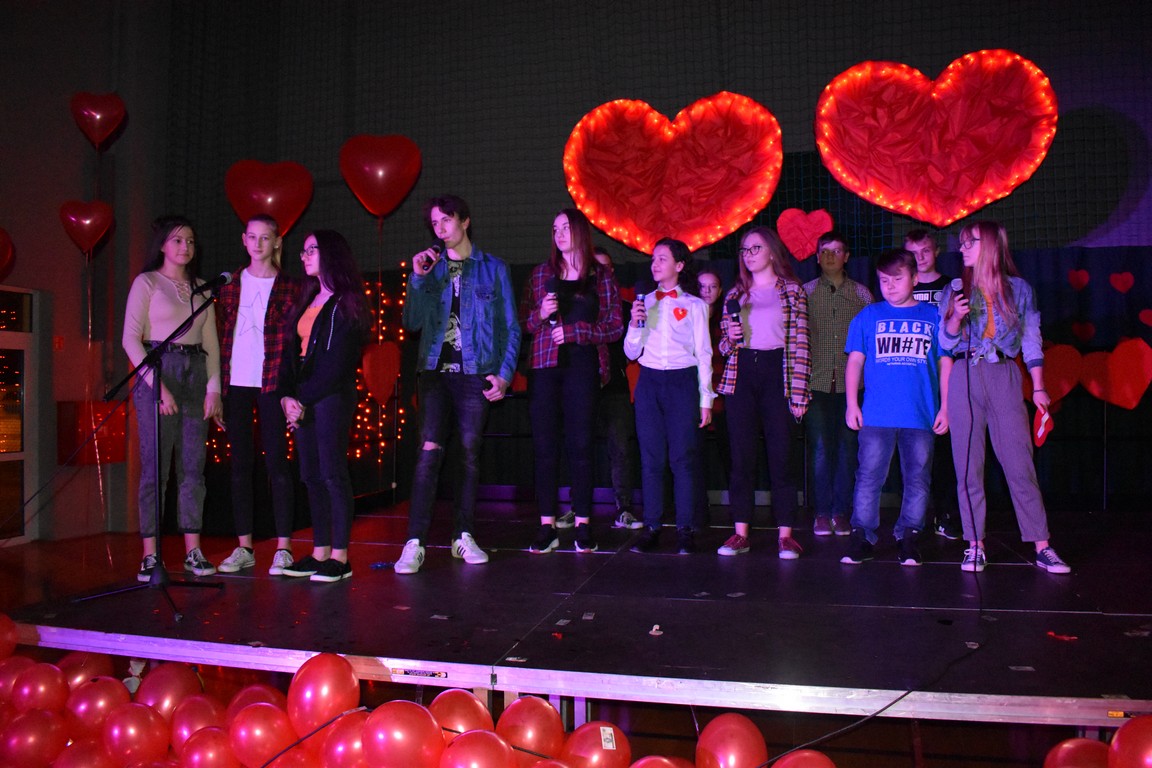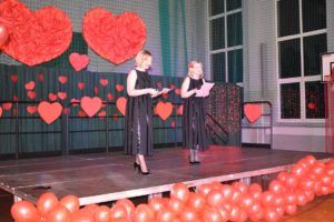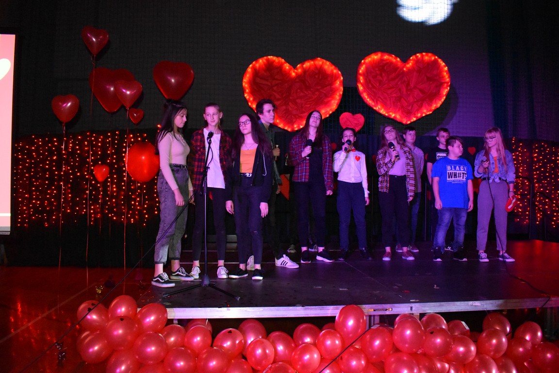 Licznie napływającą publiczność witali przedstawiciele Samorządu Uczniowskiego, wraz z ich opiekunami. Zgodnie z walentynkową tradycją, wręczania drobnych upominków, każdy przybywający otrzymywał śliczne walentynkowe serduszko.