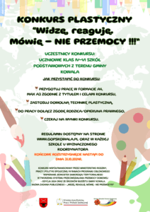 Serdecznie zapraszamy uczniów klas 4 – 6 do udziału w konkursie plastycznym “Widzę, reaguję. Mówię – NIE PRZEMOCY”, którego organizatorem jest Gminny Ośrodek Pomocy Społecznej w Kowali, w partnerstwie z Zespołem Interdyscyplinarnym i Gminną Komisją Rozwiązywania Problemów Alkoholowych.