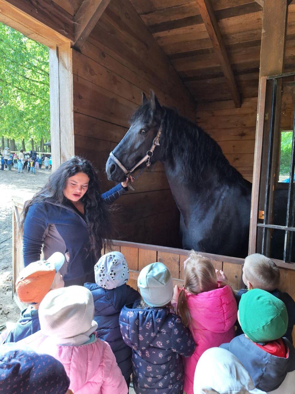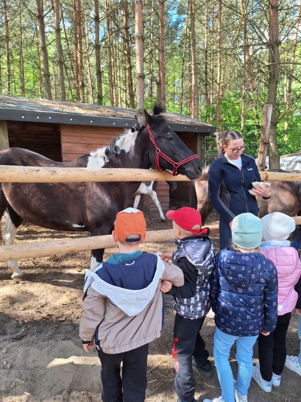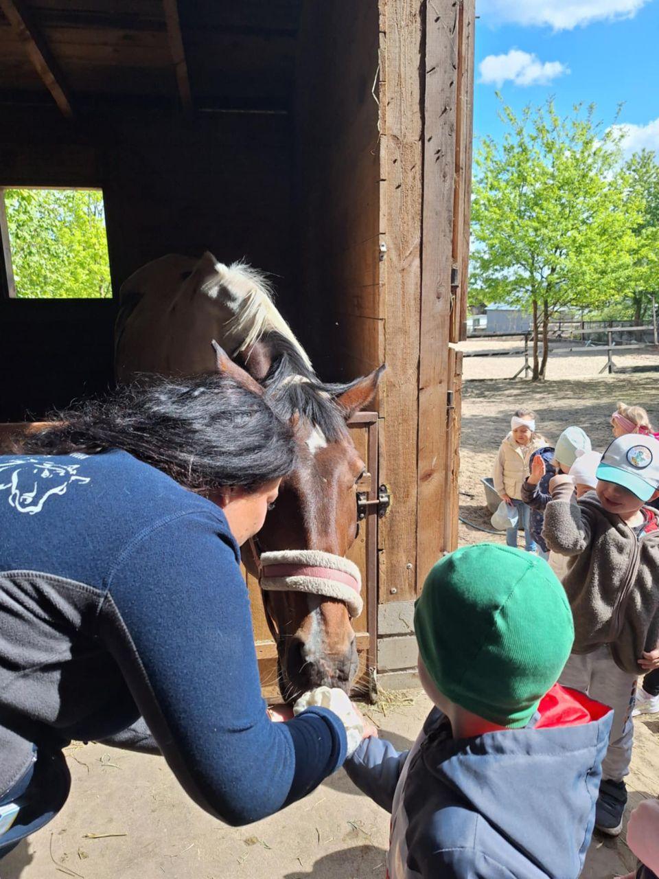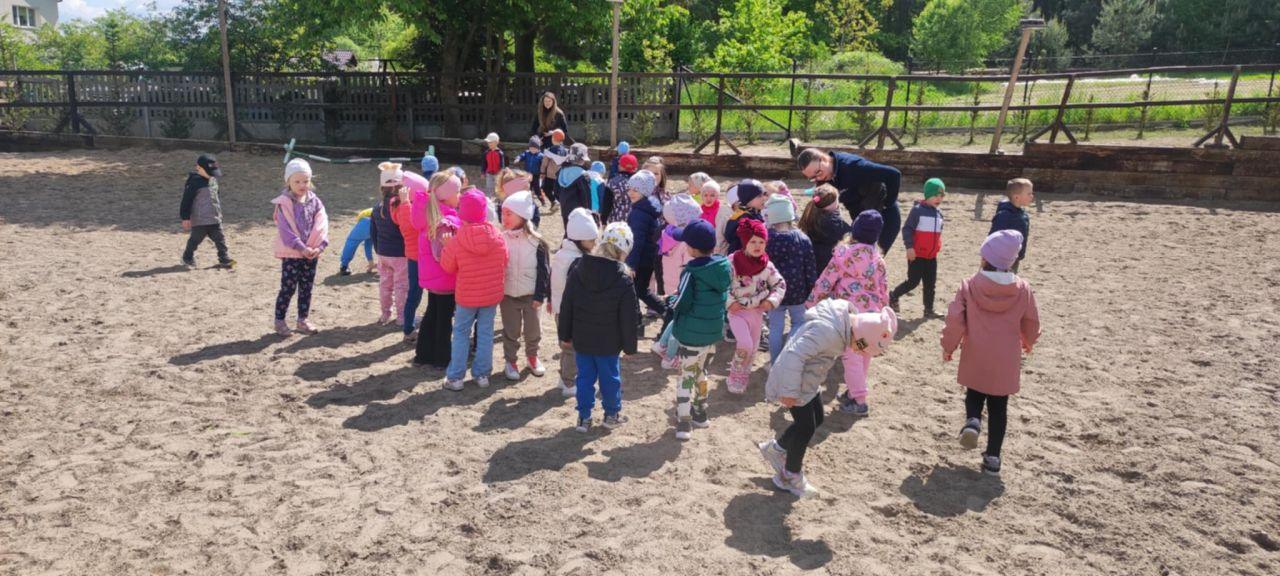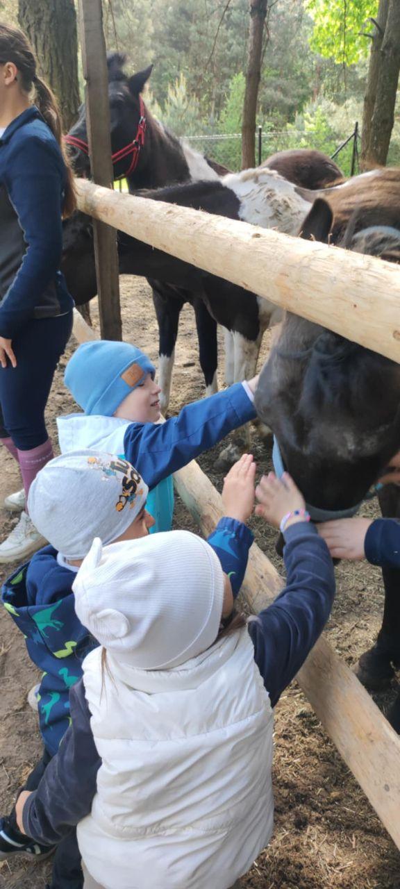 W słoneczny dzień nasze przedszkolaki wybrały się na wyjątkową, krótką wycieczkę do stajni „Konie na Nieboskłonie” w Dąbrówce Warszawskiej. Dla wielu dzieci była to pierwsza okazja, by z bliska zobaczyć majestatyczne konie- poznać ich zwyczaje, dowiedzieć się, czym się żywią i jak należy o nie dbać.