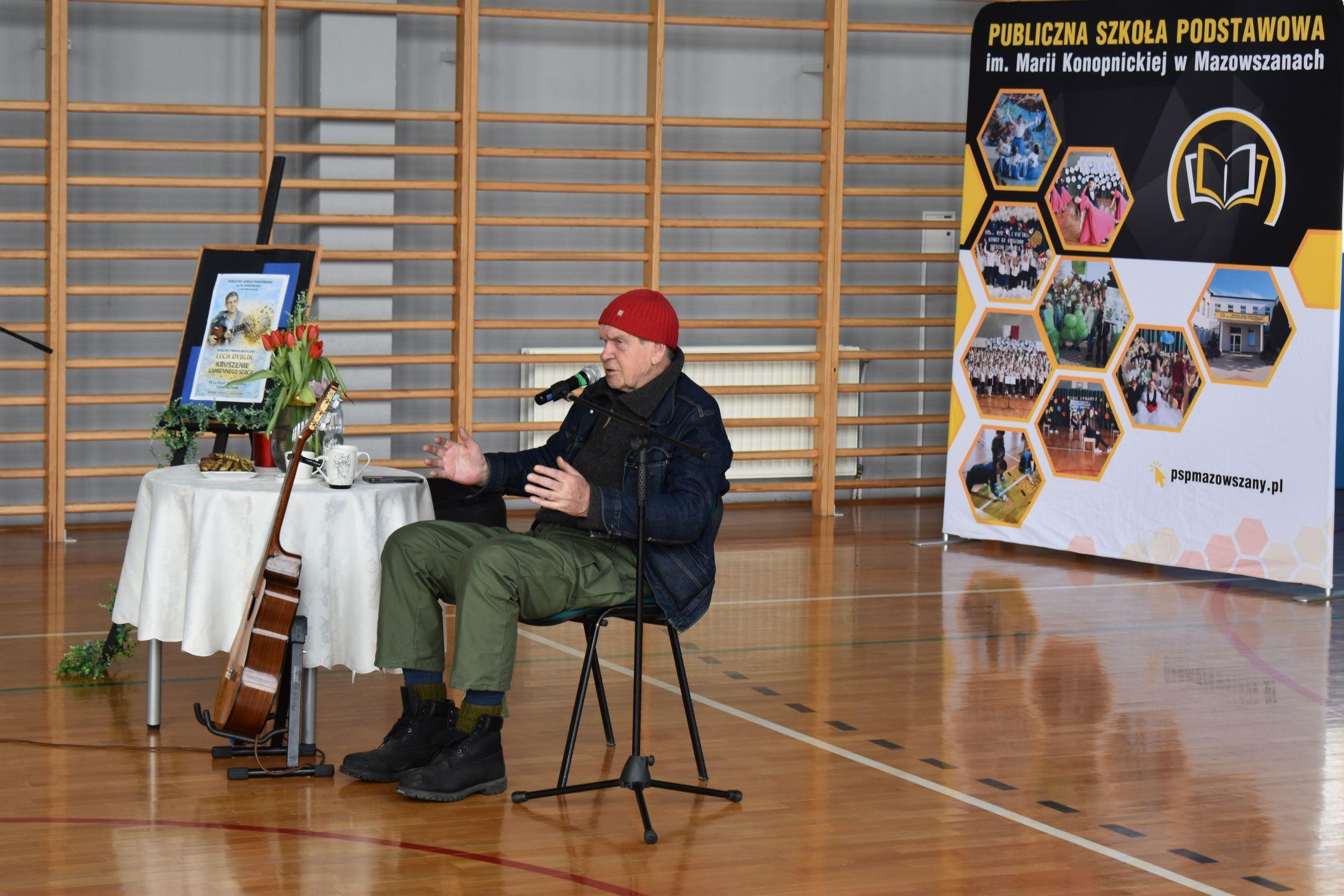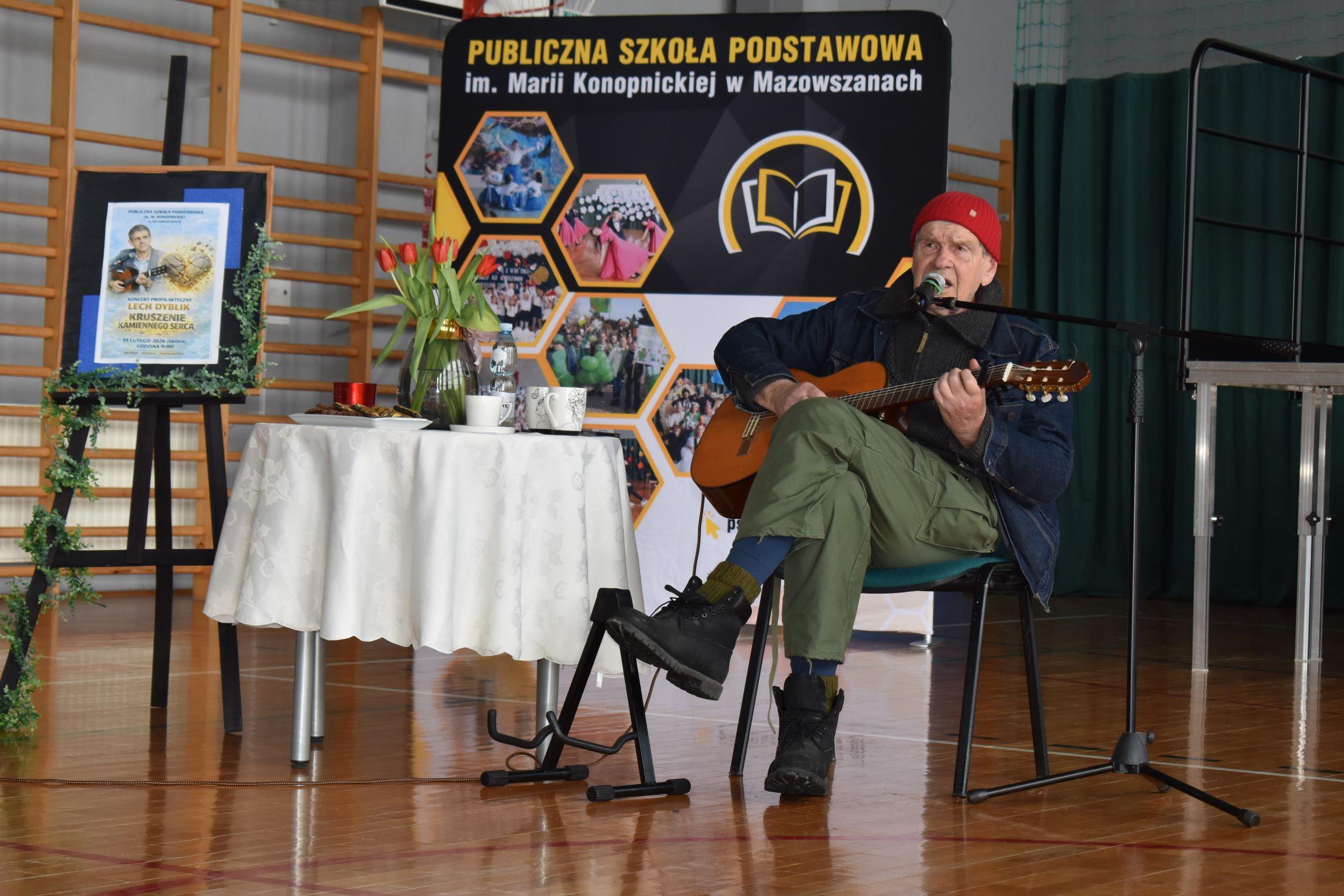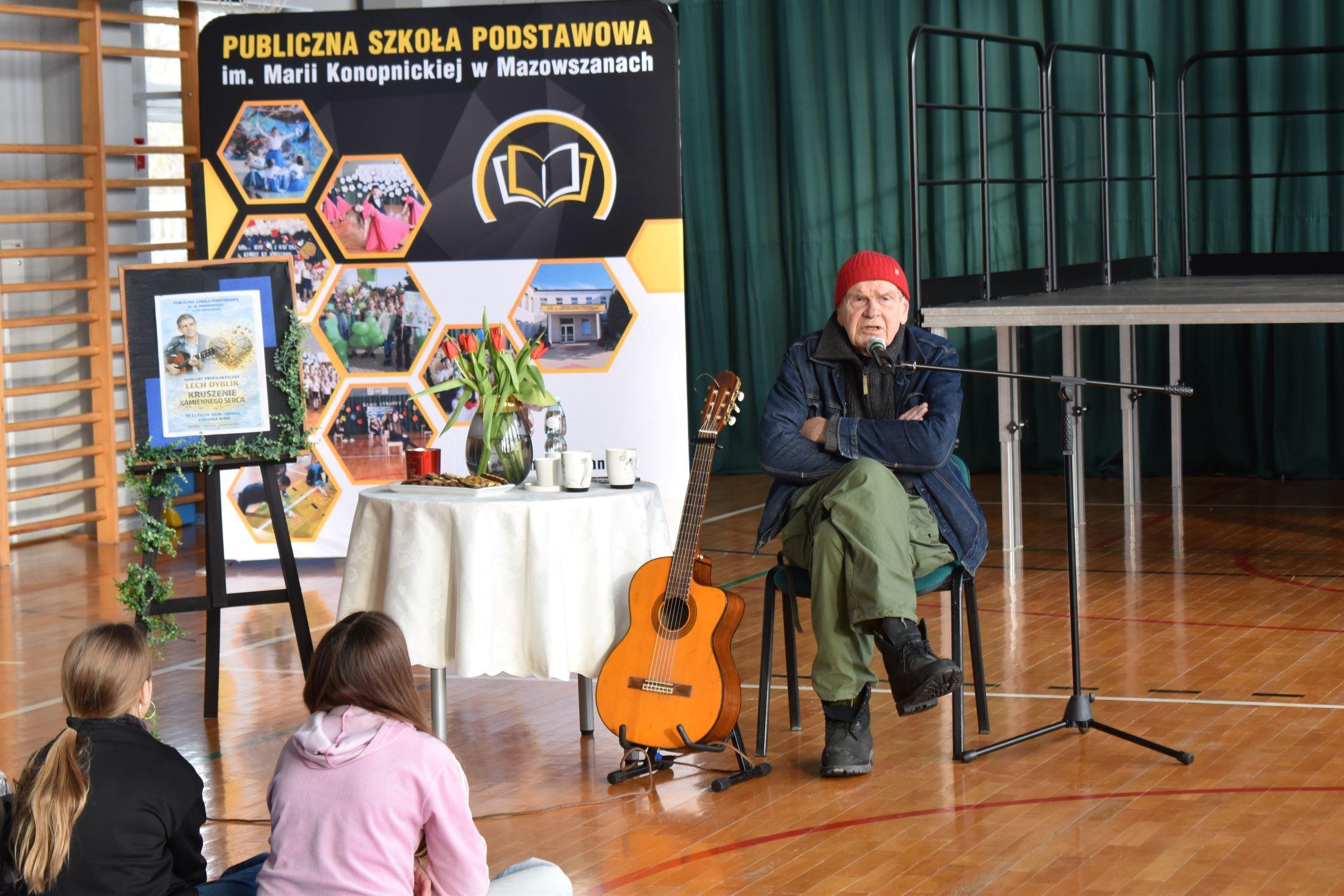 W środę (11.02.2026 r.) mieliśmy okazję gościć w naszej szkole znanego aktora, muzyka i kompozytora – Lecha Dyblika. Zaprezentował on swój program pt. „Kruszenie kamiennego serca”. To wyjątkowe wystąpienie, łączące w sobie koncert i pogadankę, miało charakter profilaktyczny. Podczas spotkania pełnego emocji i refleksji, aktor opowiadał o swoich własnych doświadczeniach, związanych z walką z nałogiem. Jego słowa wybrzmiały jak przestroga oraz dobra rada. Aktor w swoje barwne opowieści wplatał zalecenia dotyczące zdrowego stylu życia oraz umiejętności radzenia sobie z presją społeczną. Nakreślił zagrożenia, które wiążą się z nadmiernym spożywaniem alkoholu. Opisał zgubne skutki nałogu, który potrafi znacząco osłabić zdrowie, nadszarpnąć relacje międzyludzkie i być poważną przeszkodą w osiąganiu celów życiowych i sukcesów.