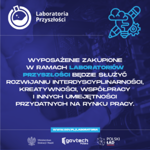 Laboratoria Przyszłości to inicjatywa edukacyjna realizowana przez Ministerstwo Edukacji i Nauki we współpracy z Centrum GovTech w Kancelarii Prezesa Rady Ministrów. Jej misją jest stworzenie nowoczesnej szkoły, w której zajęcia będą prowadzone w sposób ciekawy, angażujący uczniów oraz sprzyjający odkrywaniu ich talentów i rozwijaniu zainteresowań. Uczniowie naszej szkoły będą mieli możliwość pogłębiania swojej wiedzy i umiejętność poprzez eksperymentowanie. Zajęcia staną się atrakcyjniejsze i umożliwią rozwijanie kompetencji przyszłości, z tzw. kierunków STEAM (nauka, technologia, inżynieria, sztuka oraz matematyka).