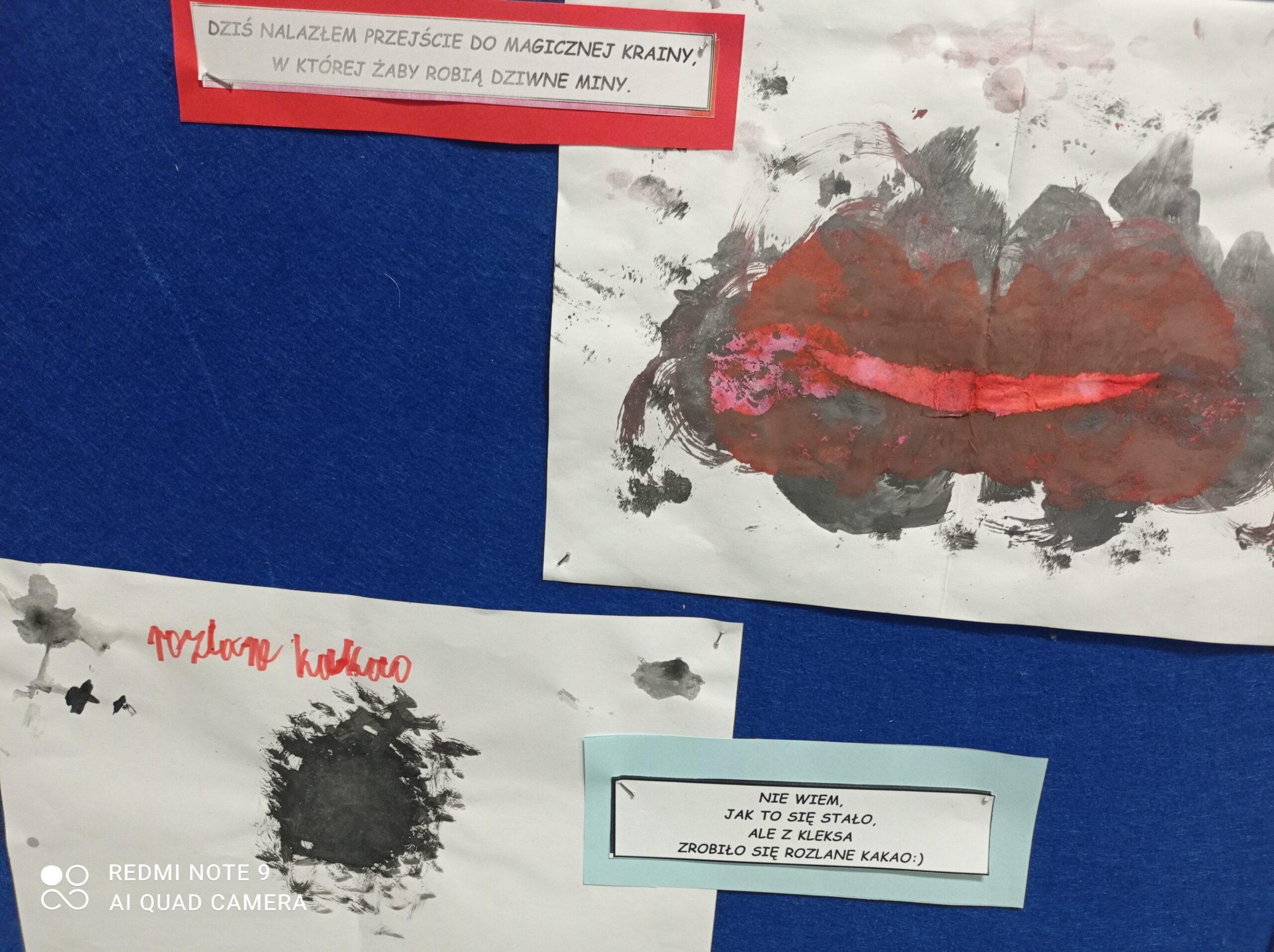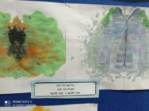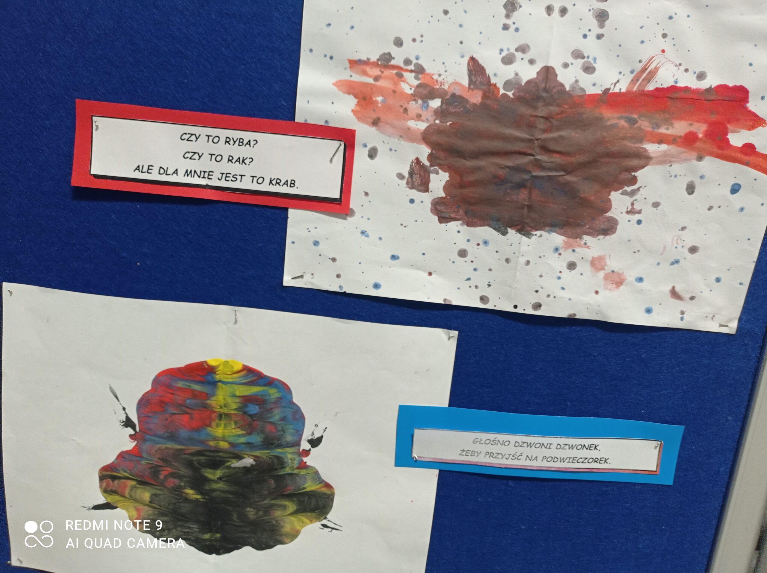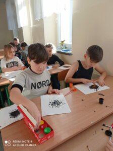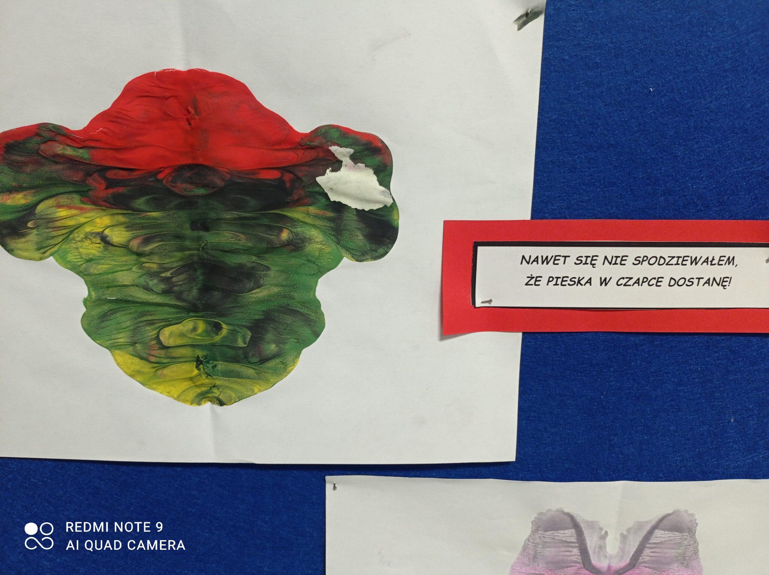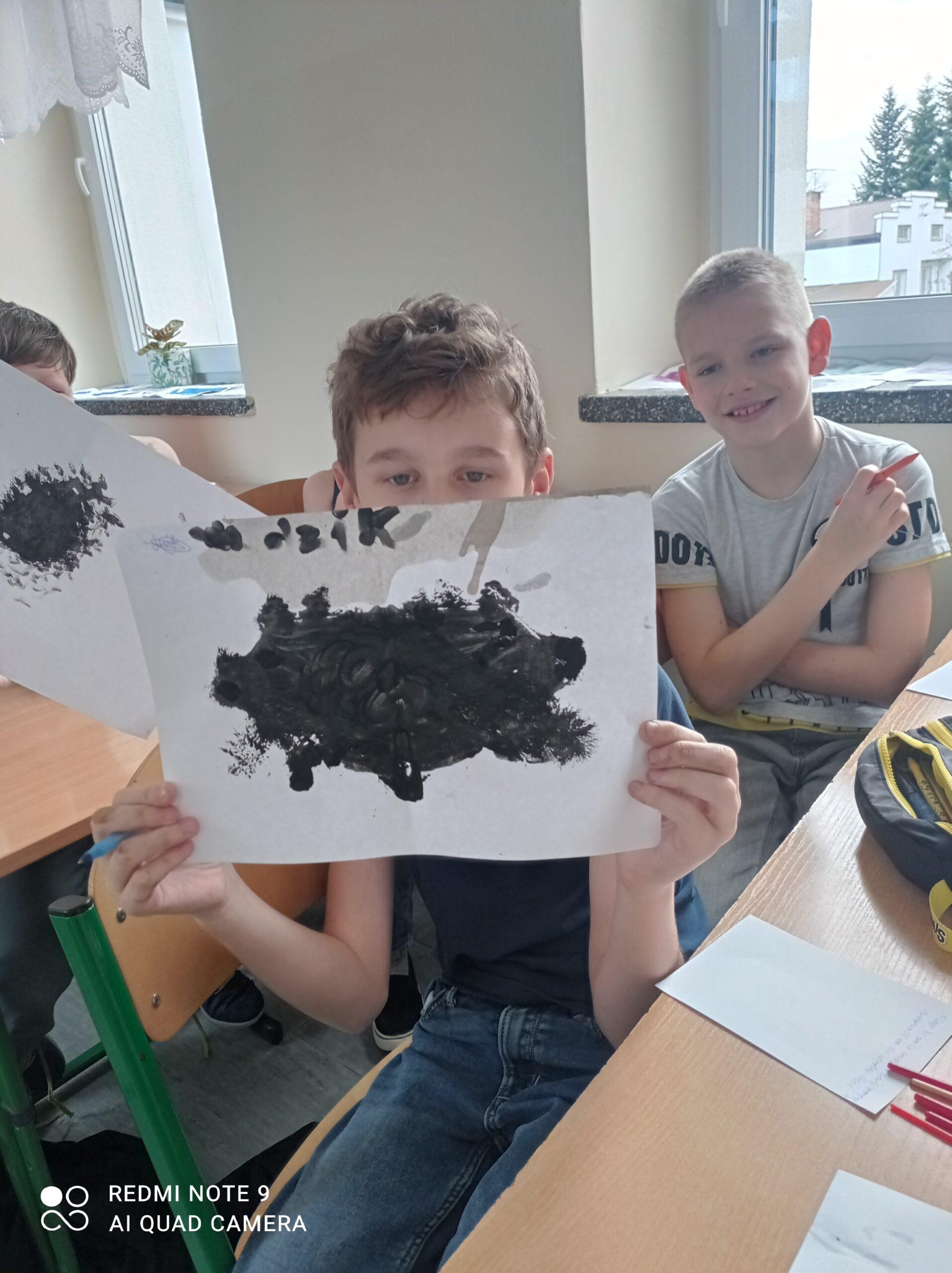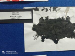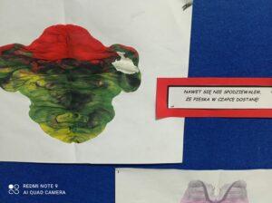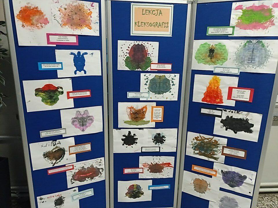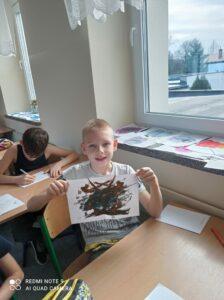 Po odczytaniu fragmentu książki uczniowie sformułowali przepis na kleksa, a następnie zabrali się do pracy. Pod kierunkiem nauczyciela j. polskiego czwartoklasiści wykonali piękne kleksy! Robili je na arkuszu papieru, który następnie składali na połowę i odczytywali różne historie z powstałych w ten sposób obrazków. Do niektórych wymyślali oryginalne rymowanki. Było niezwykle kolorowo i kreatywnie. Warto podkreślić, że każdy uczeń zdał egzamin z kleksografii celująco! Uczniowskie arcydzieła można zobaczyć na zdjęciach: