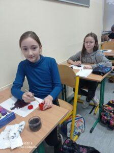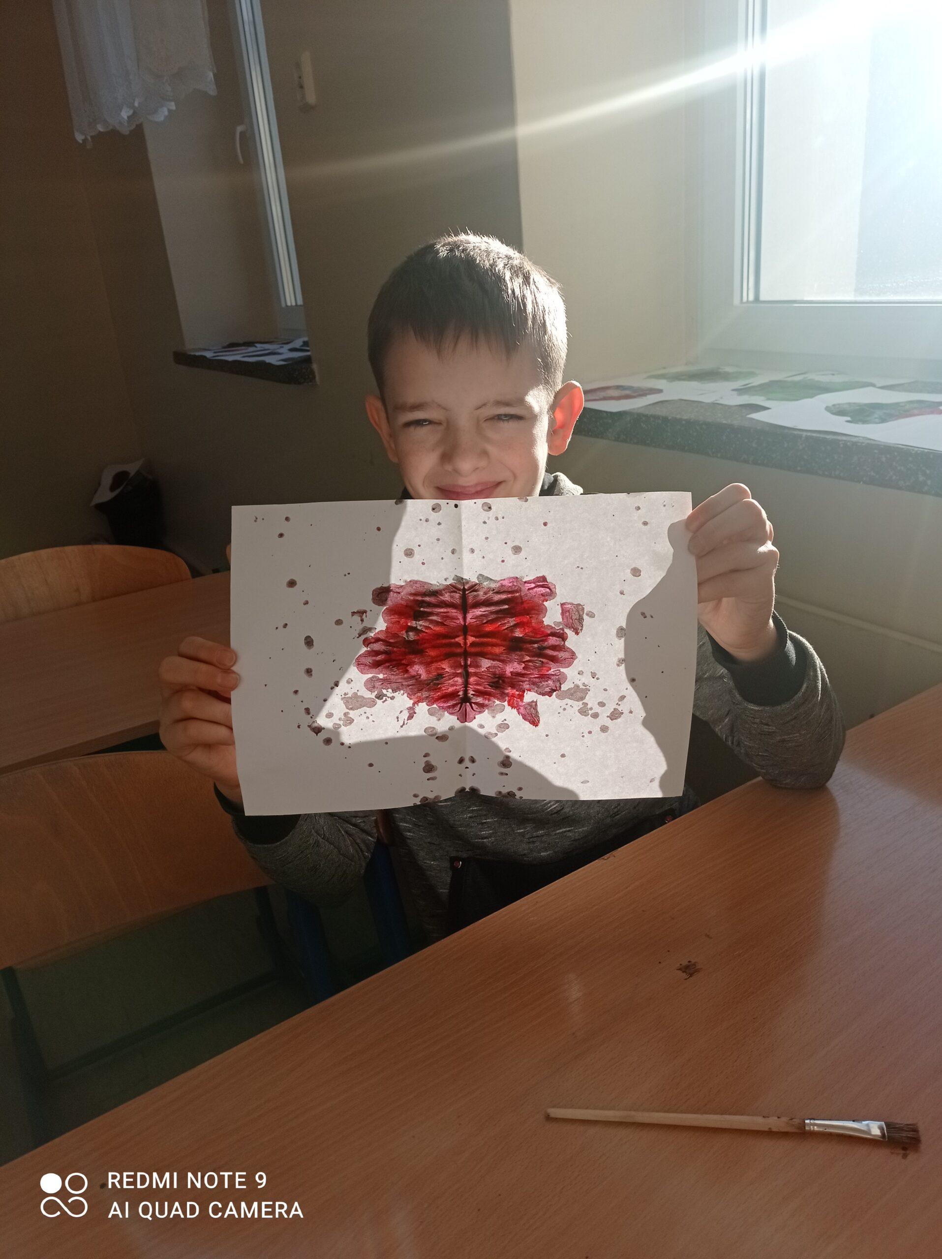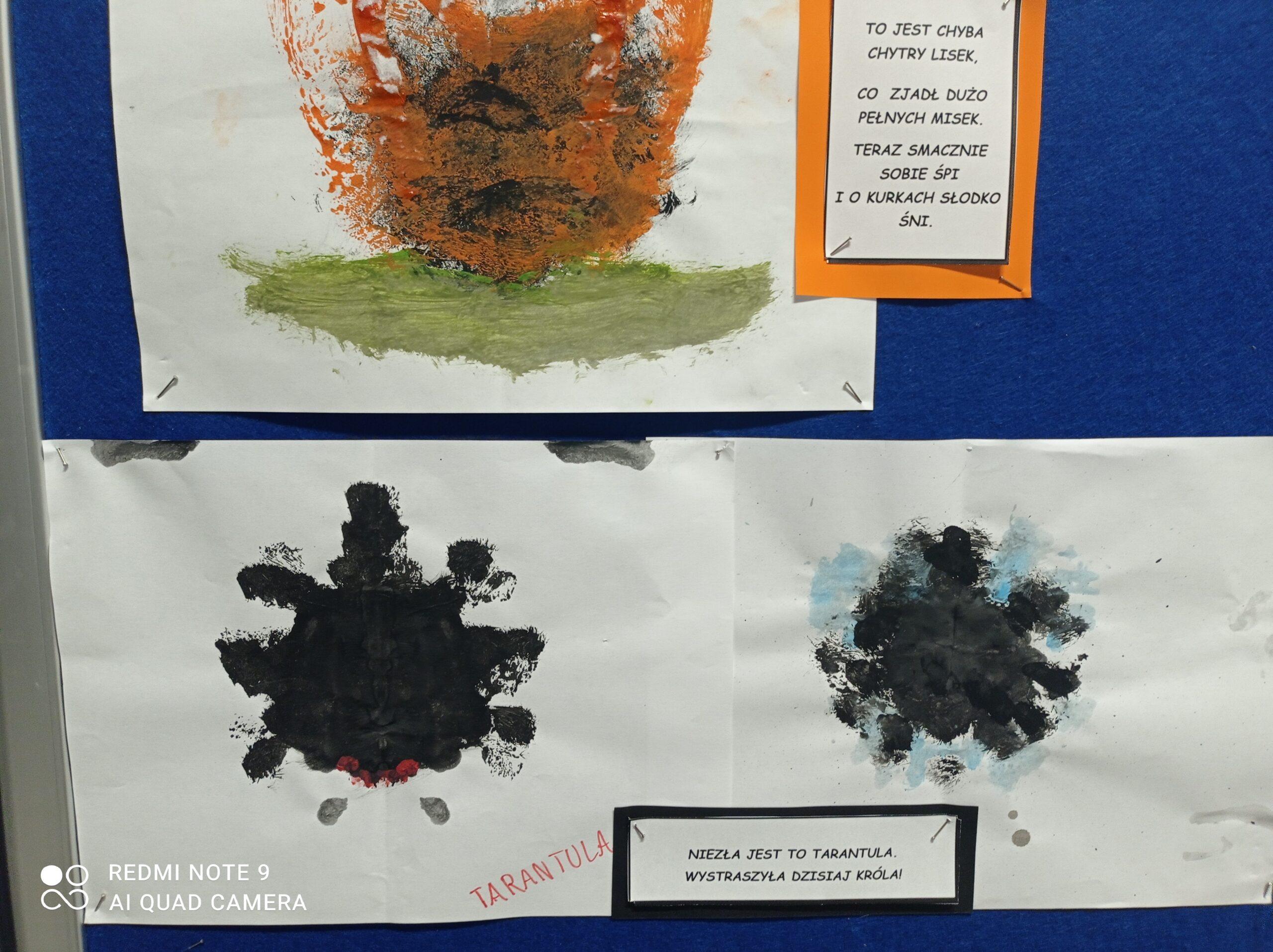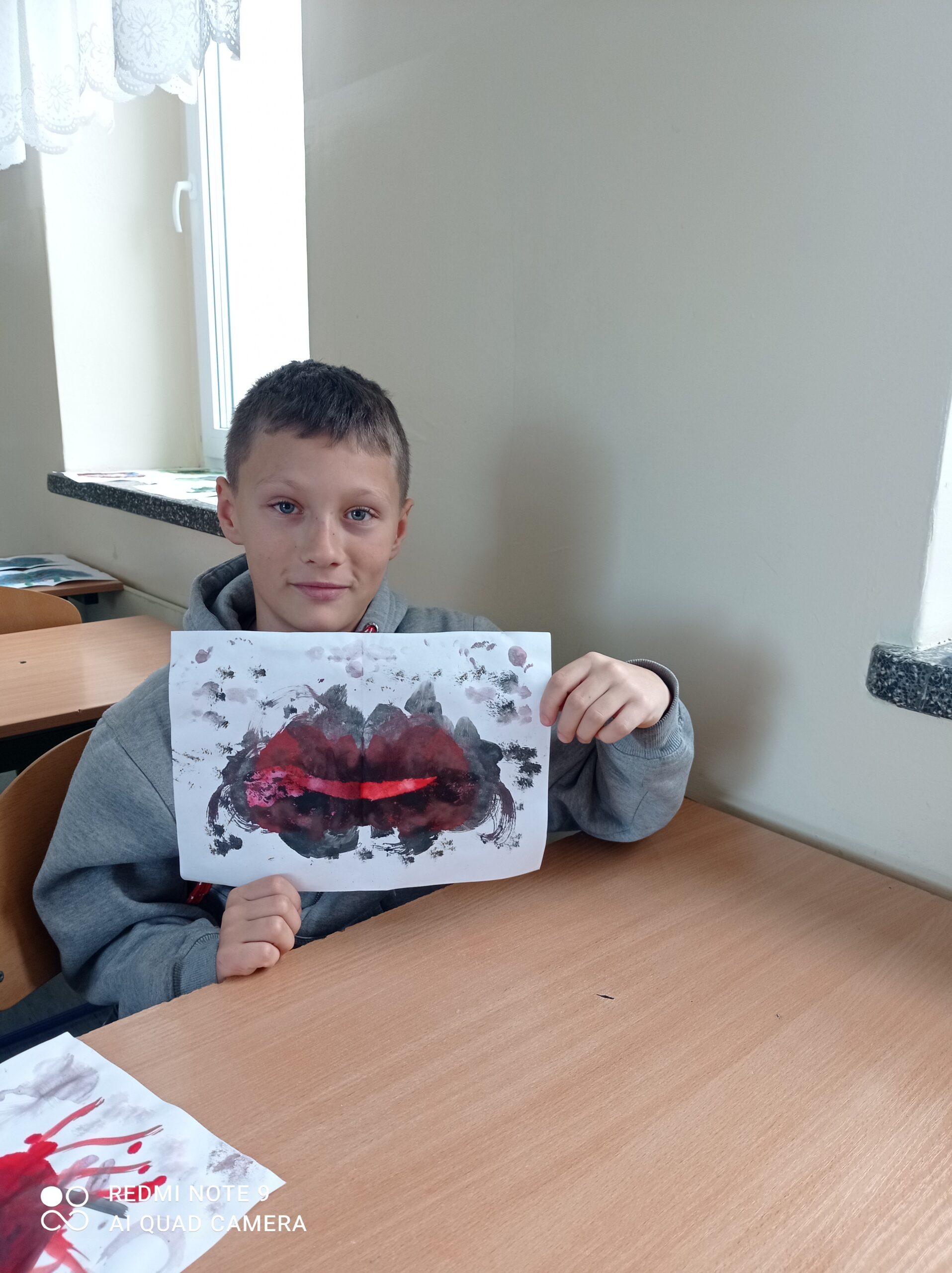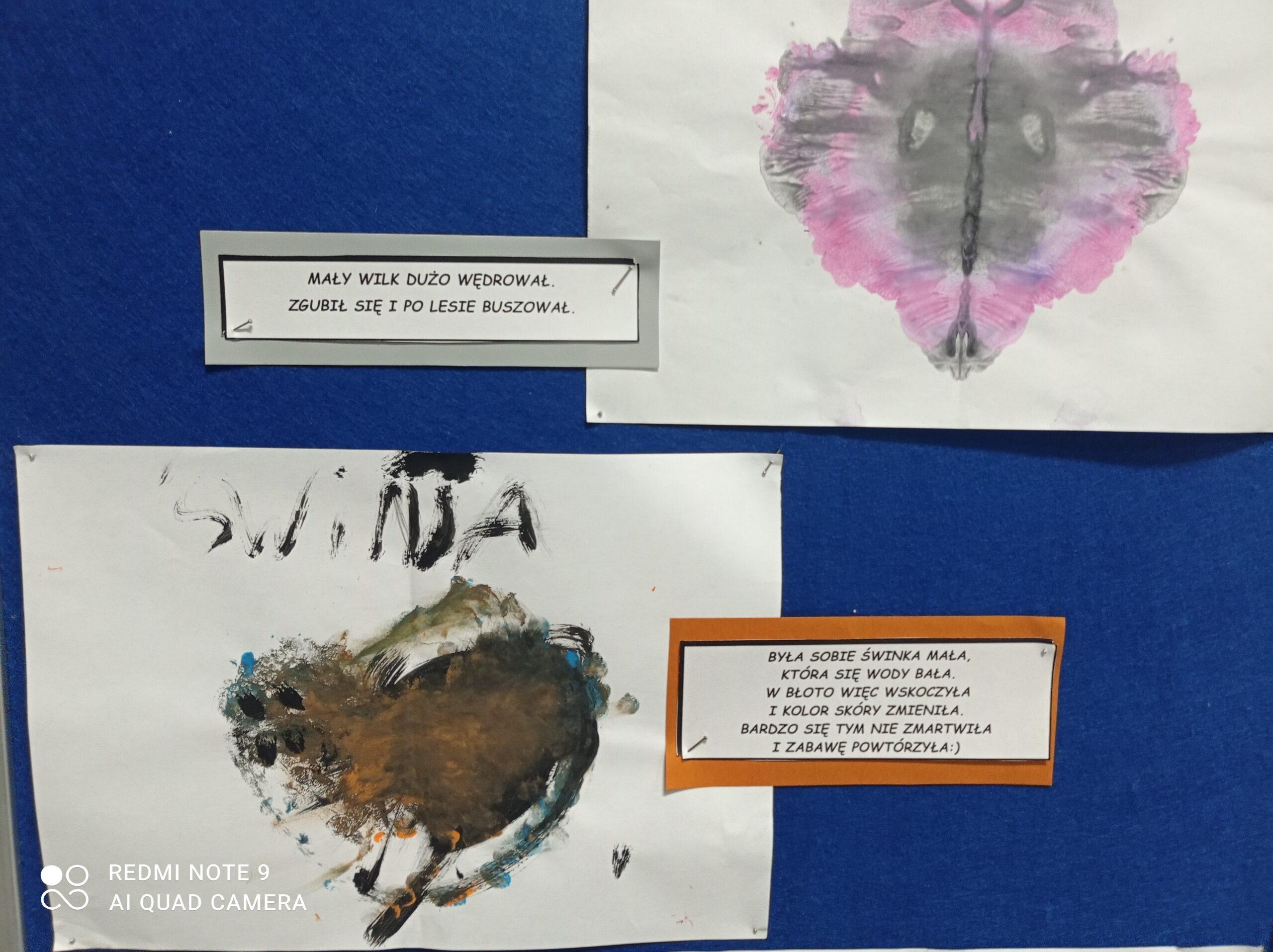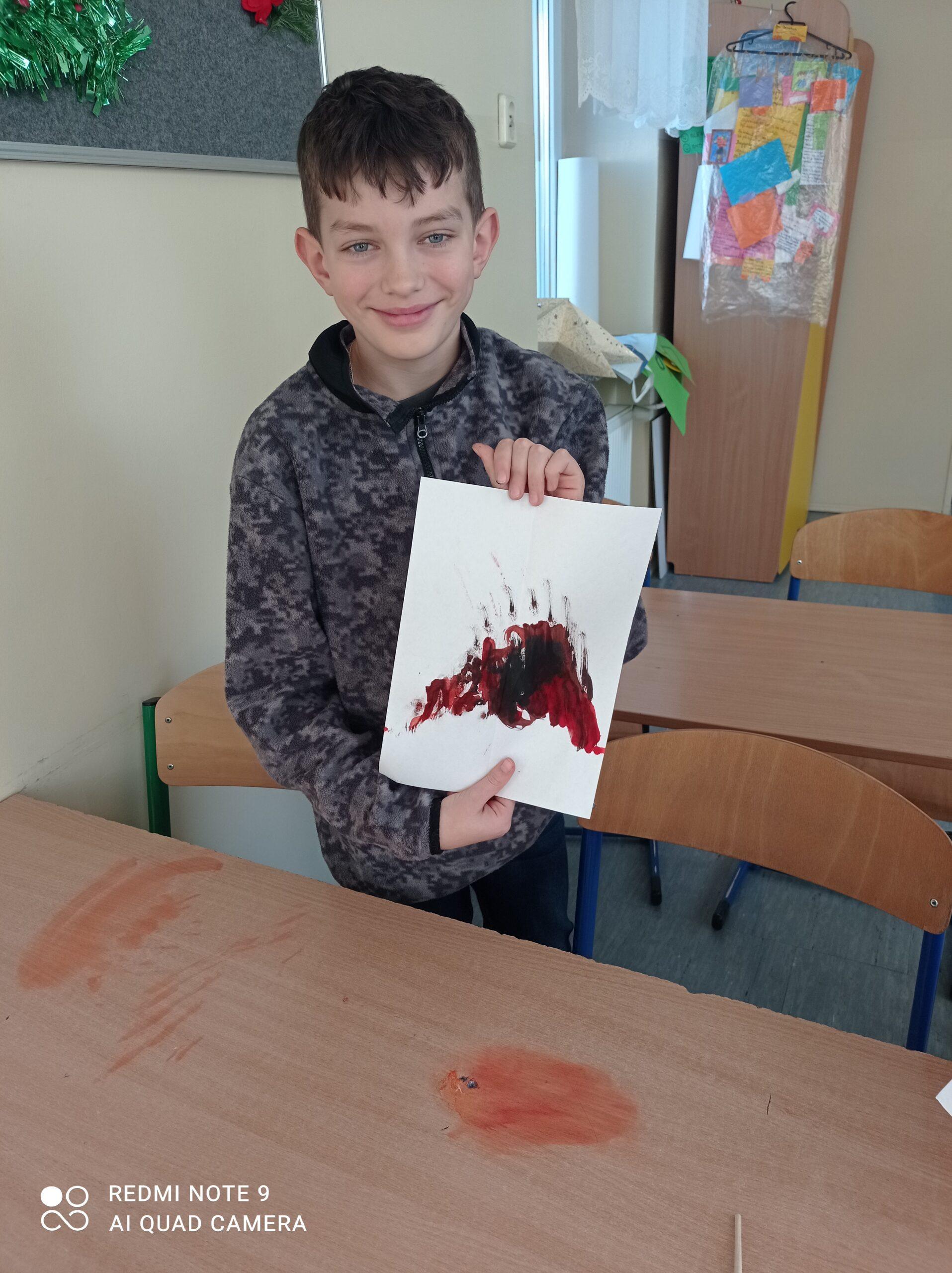 Po odczytaniu fragmentu książki uczniowie sformułowali przepis na kleksa, a następnie zabrali się do pracy. Pod kierunkiem nauczyciela j. polskiego czwartoklasiści wykonali piękne kleksy! Robili je na arkuszu papieru, który następnie składali na połowę i odczytywali różne historie z powstałych w ten sposób obrazków. Do niektórych wymyślali oryginalne rymowanki. Było niezwykle kolorowo i kreatywnie. Warto podkreślić, że każdy uczeń zdał egzamin z kleksografii celująco! Uczniowskie arcydzieła można zobaczyć na zdjęciach:
